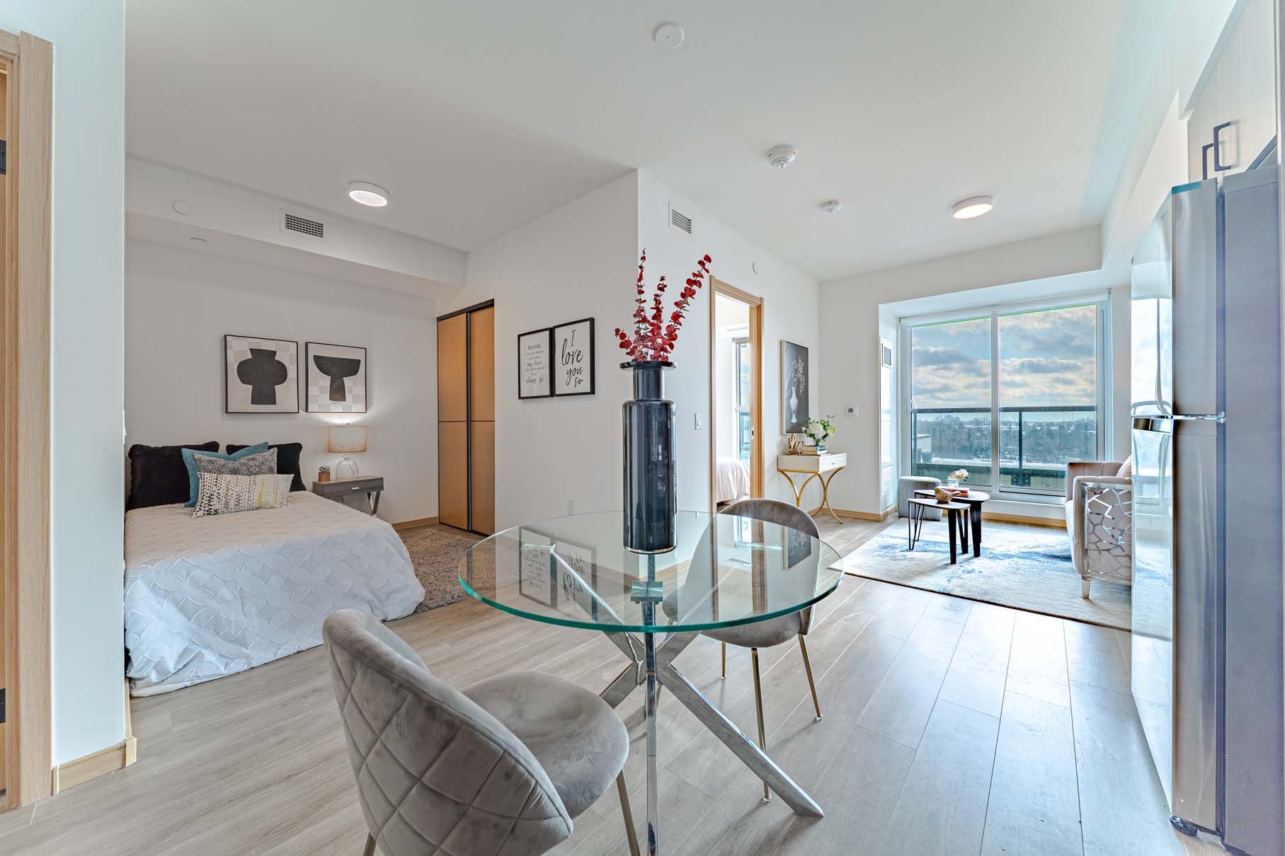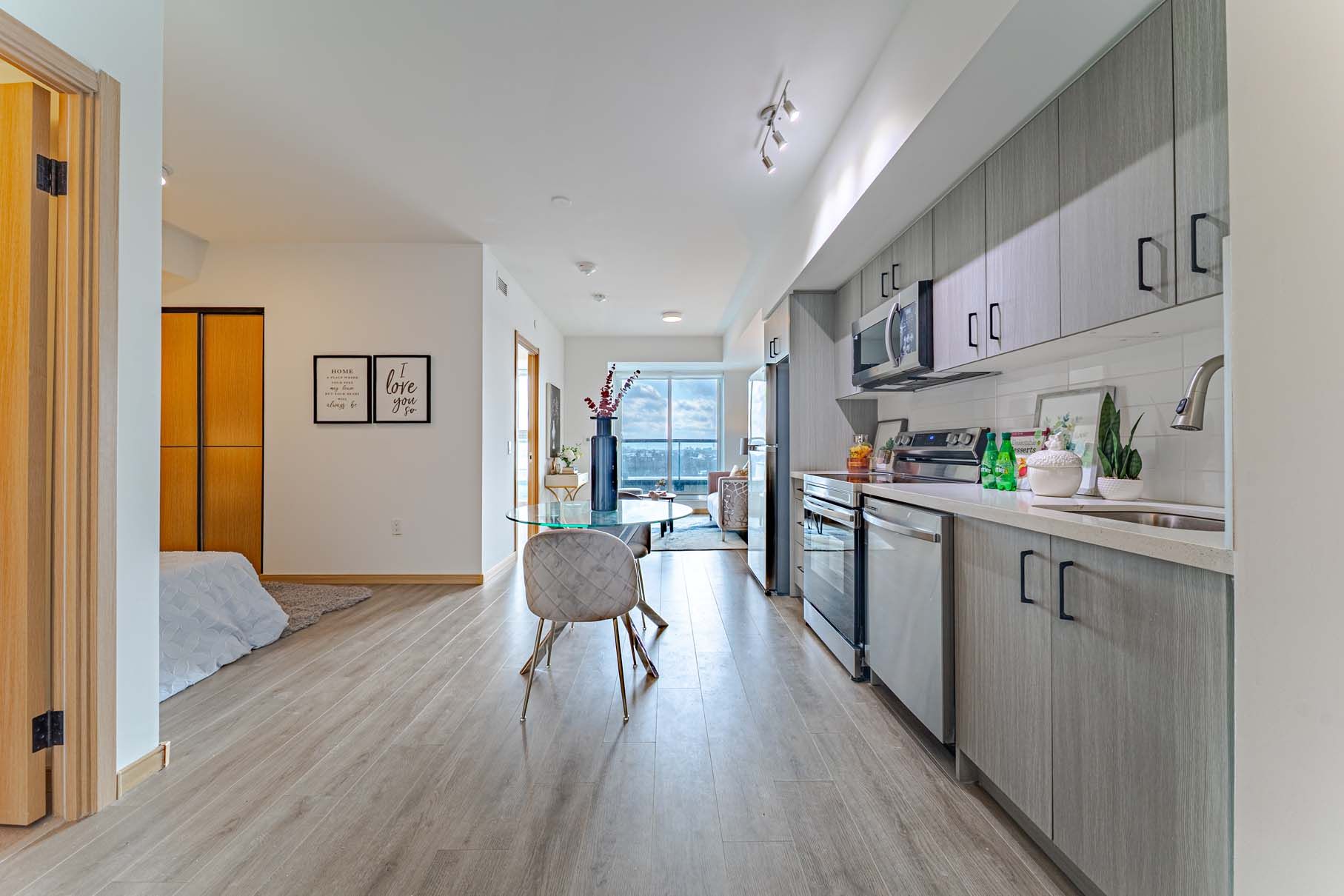 Bright and stylish 1+1 unit featuring a spacious open-concept layout and soaring 9ft ceilings. The living room extends seamlessly to a private balcony with an unobstructed view, perfect for relaxing or entertaining. The contemporary kitchen is equipped with stainless steel appliances and backsplash. A generously sized den with a closet offers the versatility to function as a second bedroom or home office. Enjoy excellent amenities, including gym, party room, library, visitor parking, and exercise room. Ideally located just steps to public transit, plazas, and minutes from hwy 401, supermarkets, shopping, banks, golf, schools, parks, and more.