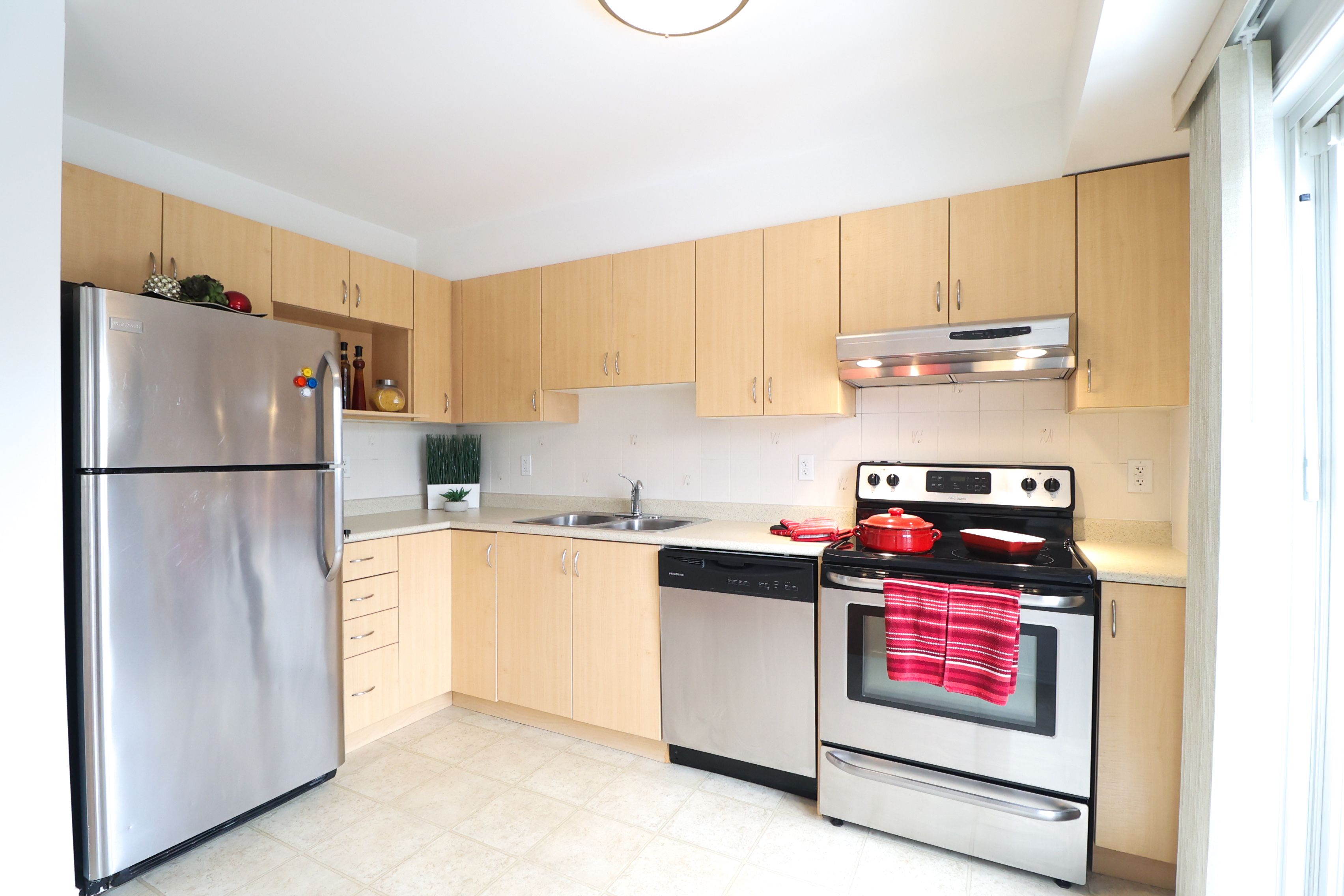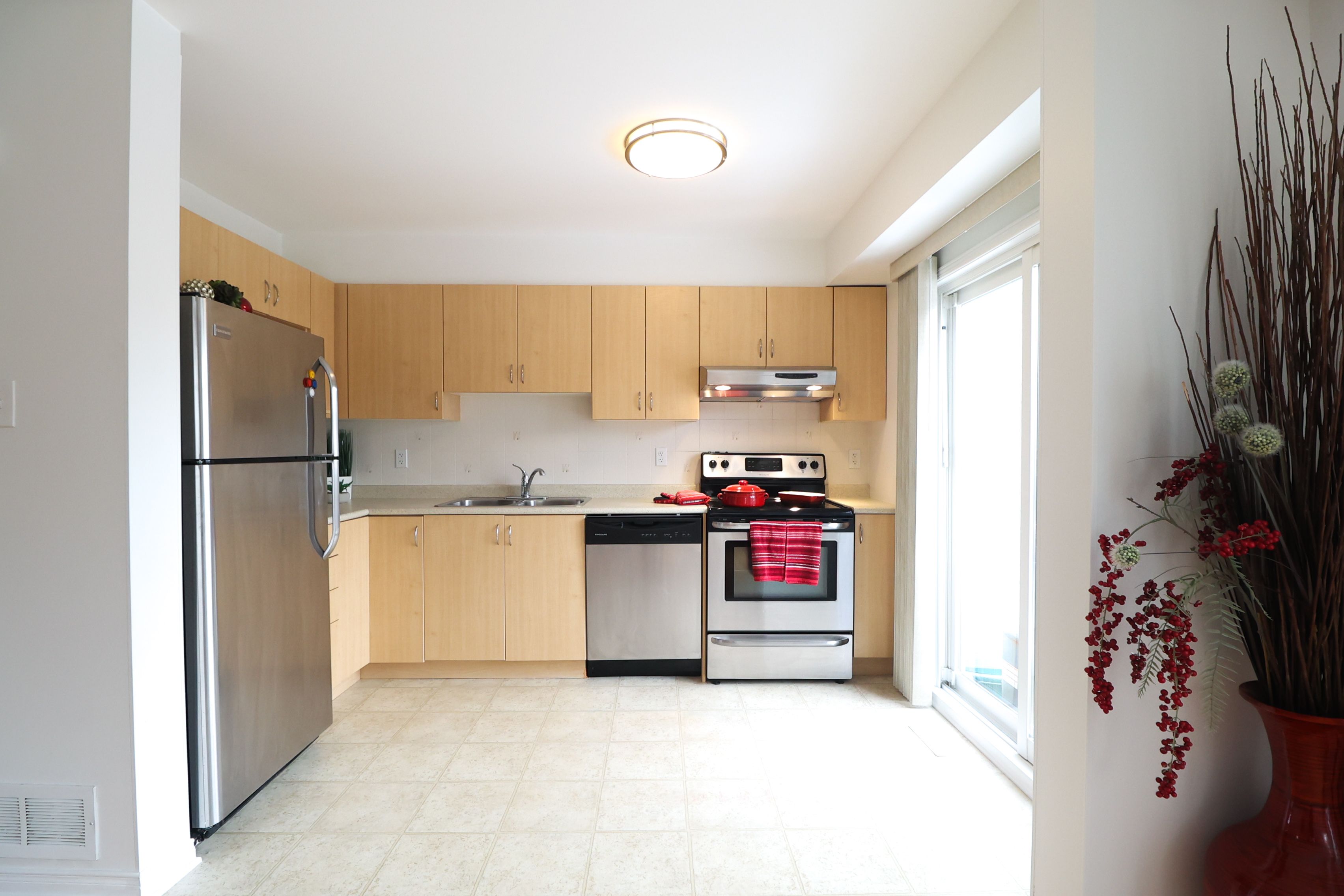 • Open-concept kitchen with stainless steel appliances and backyard access.