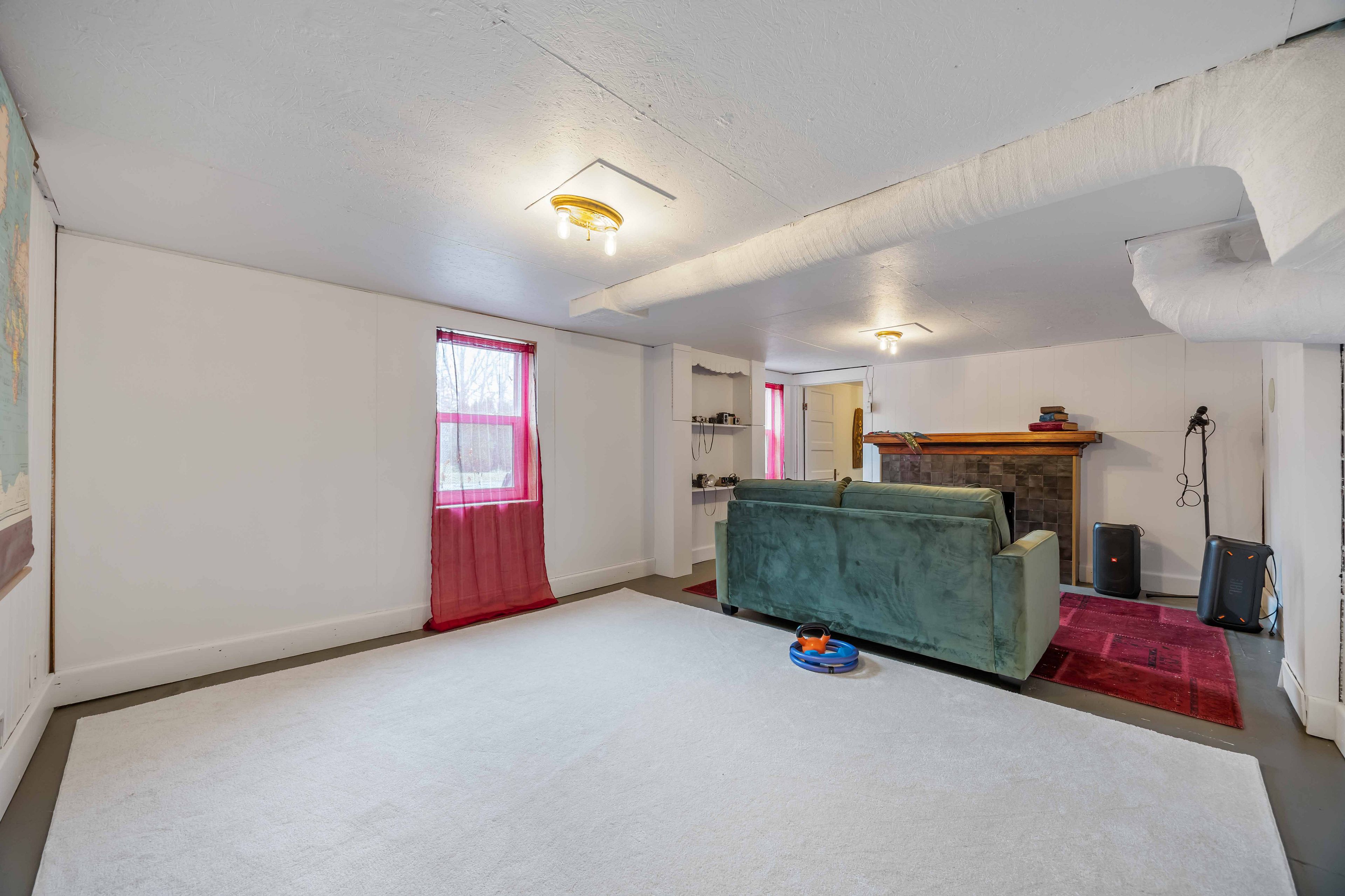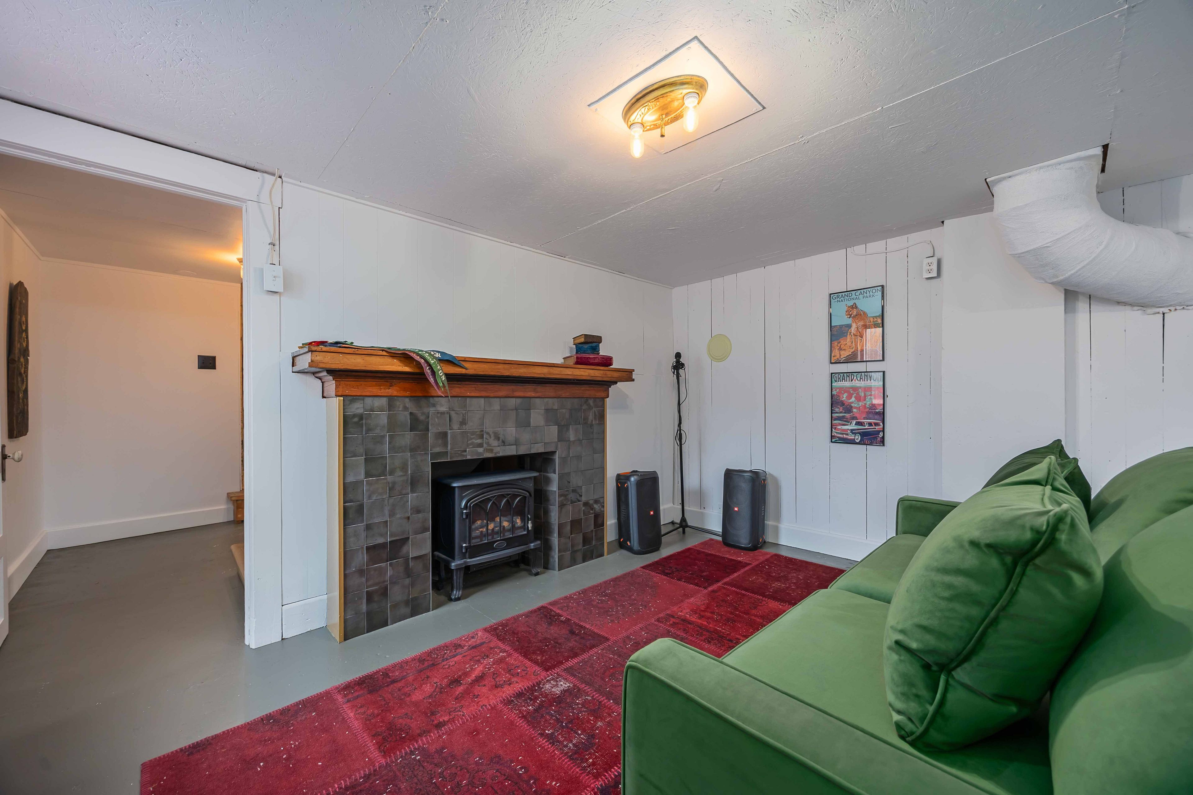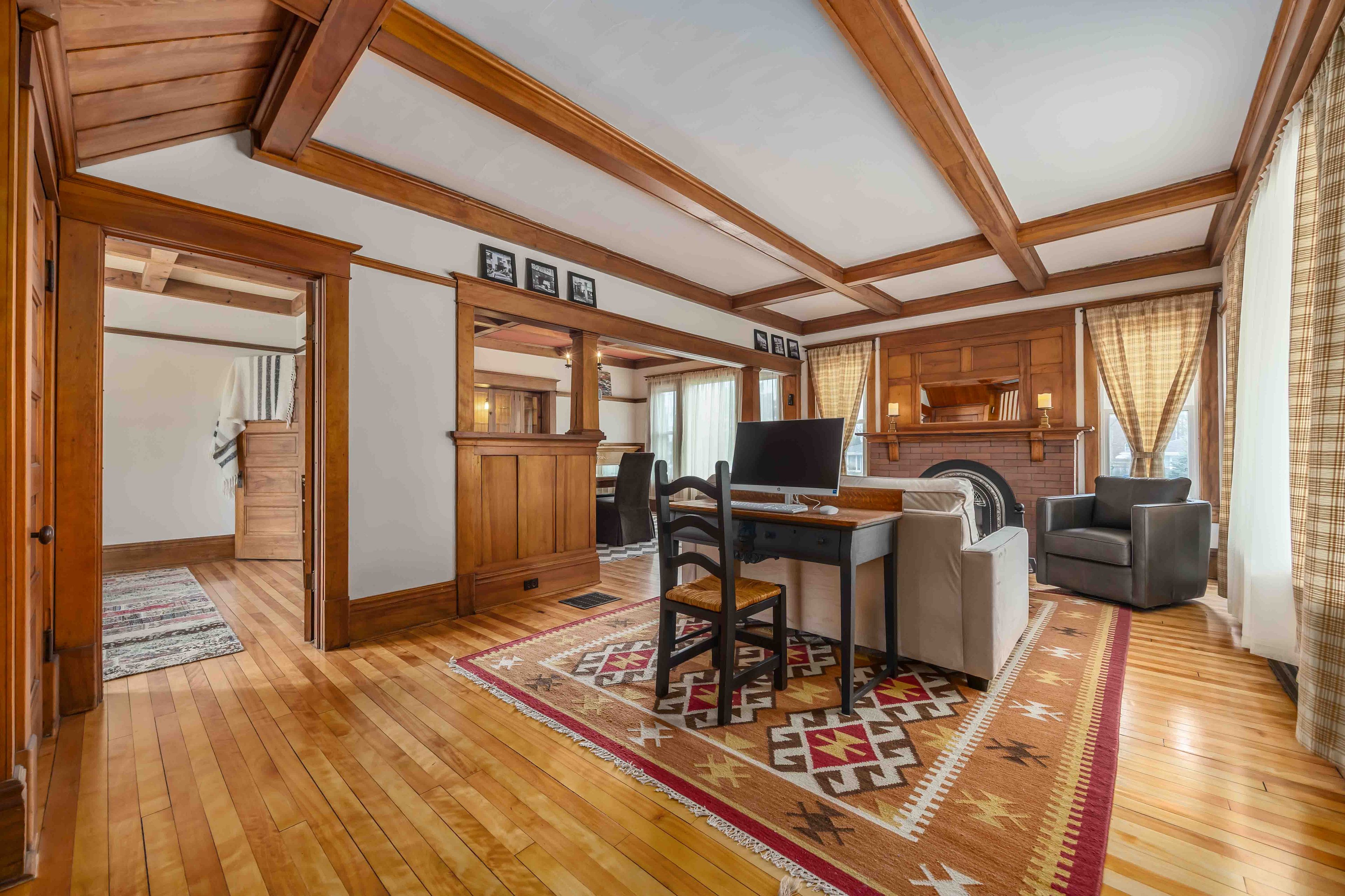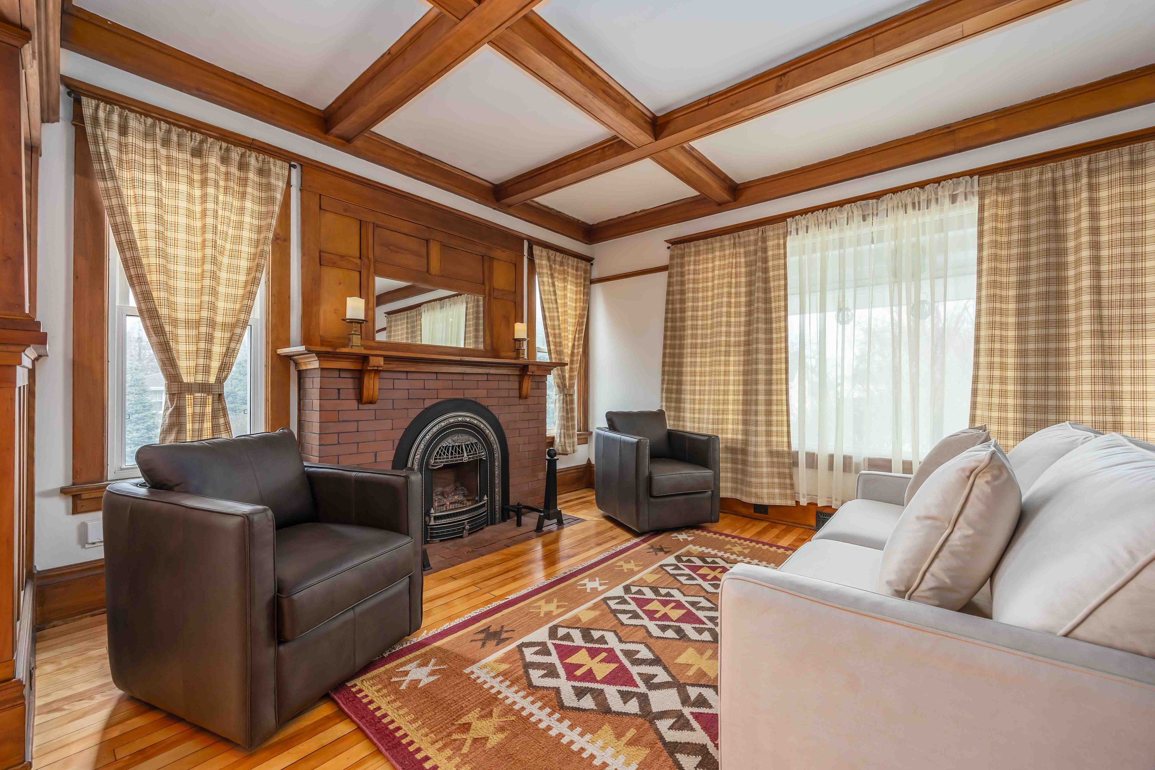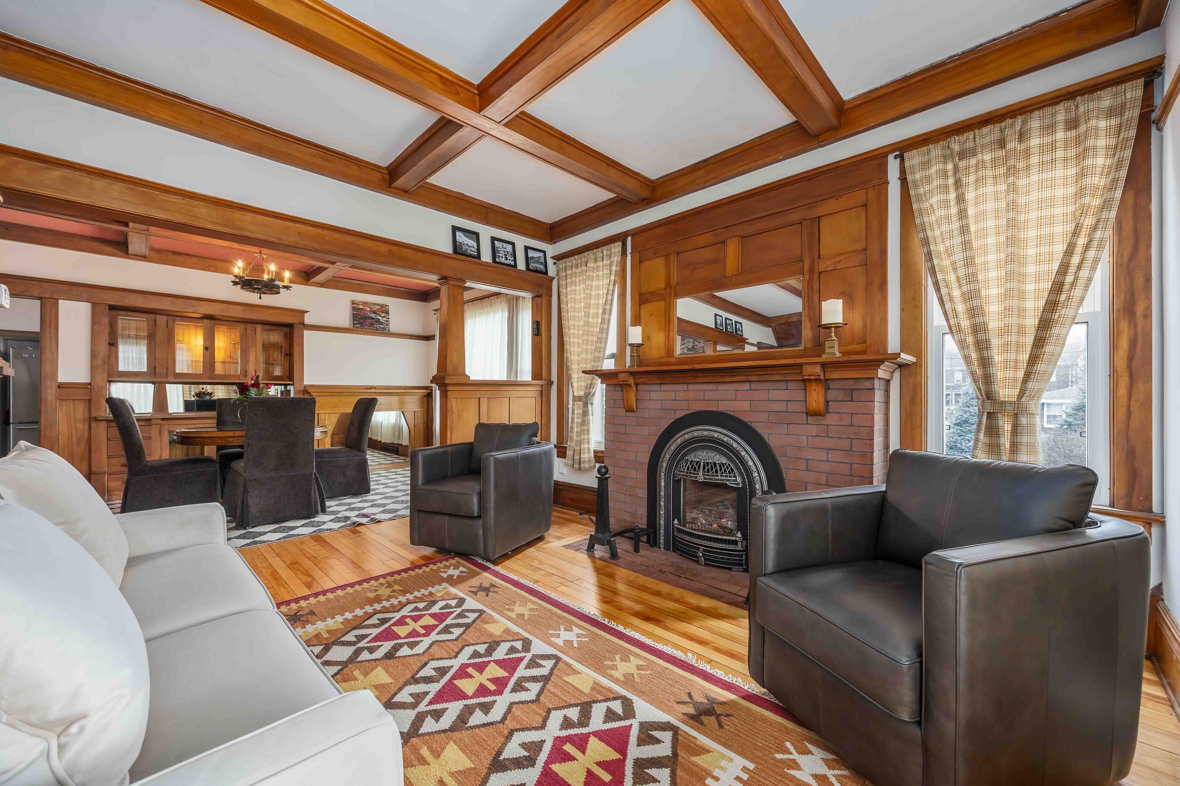 • Bright open-concept living area with antique gas fireplace.