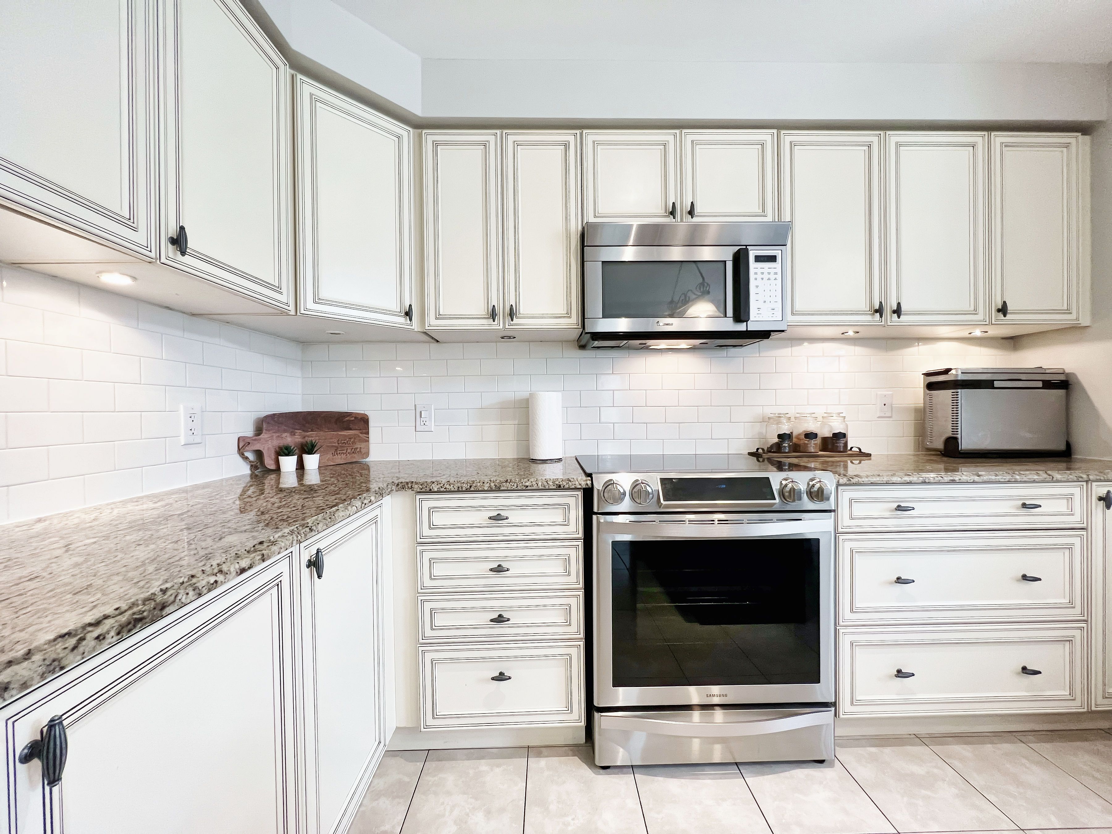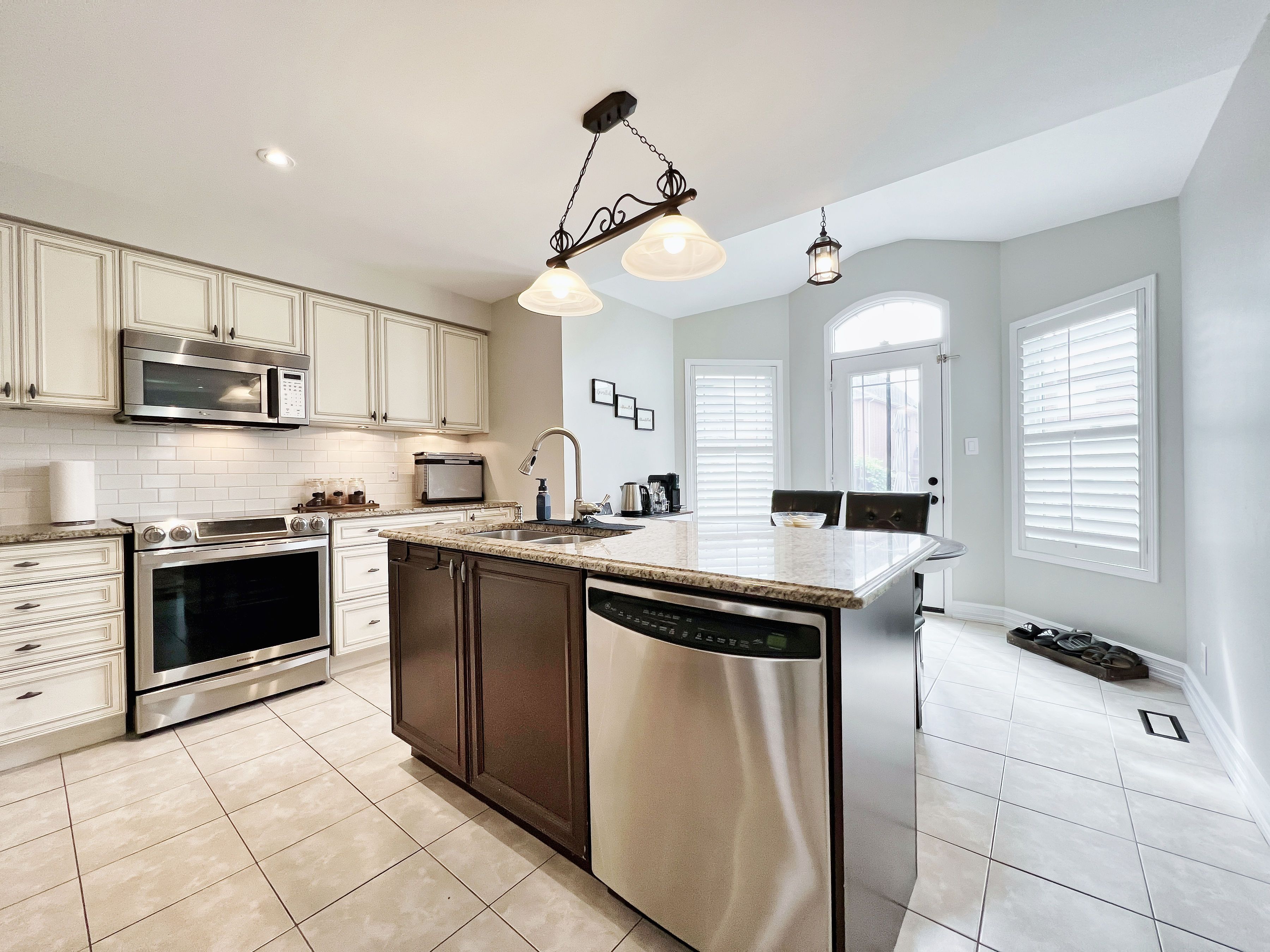 • Gourmet eat-in kitchen with granite countertops and stainless steel appliances.