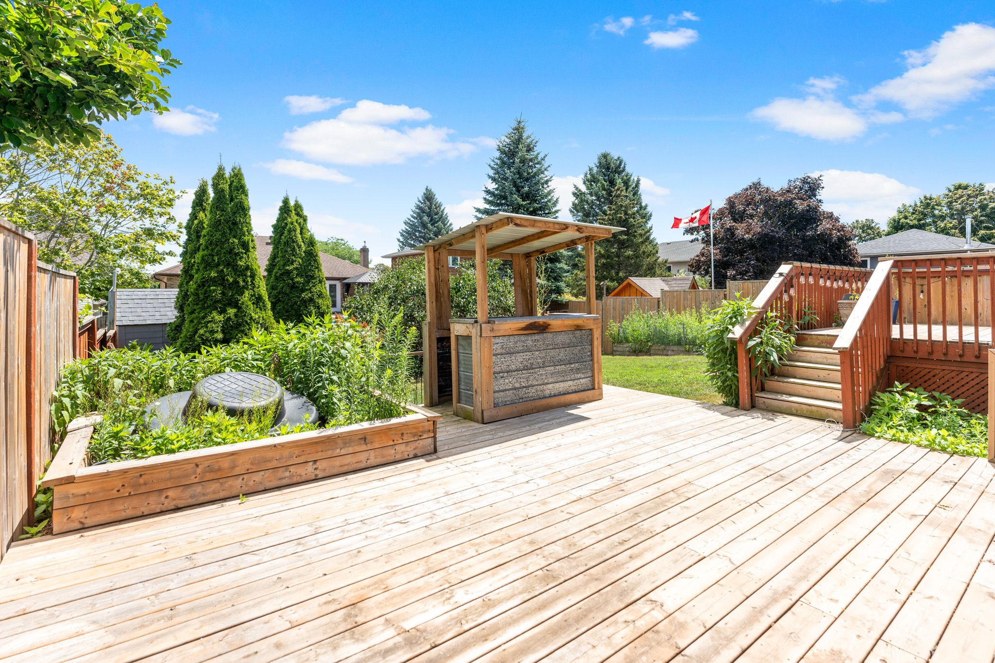 • Landscaped backyard with expansive decking and Tiki bar for relaxation.