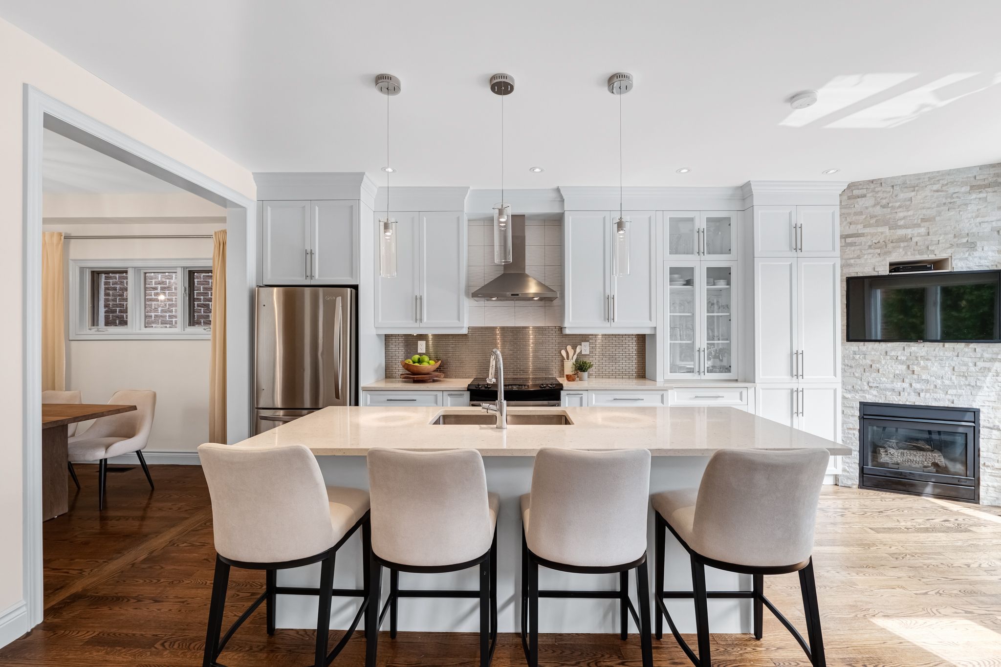 • Renovated oversized kitchen with stainless steel appliances and gas fireplace.