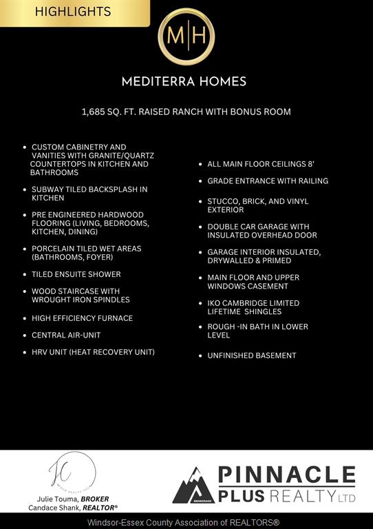 For a limited time - hst rebate pricing!! Welcome to mayrand street in the new villa oaks estates subdivision! The 'terra' model is a spacious raised ranch semi-detached home with bonus room and attached double garage features 3 bedrooms & 2 bathrooms in a quiet neighbourhood just minutes from many amenities. Step inside to the bright, welcoming space with hardwood floors in the kitchen and all living areas and tile flooring in the foyer and baths. The open floor plan seamlessly connects the living room to the dining area and kitchen, making it ideal for entertaining and family gatherings. The kitchen’s functional layout features plenty of cabinet space, island, solid surface countertops and beautiful coffee bar. The upper level features a large primary bedroom with 4-piece ensuite and walk-in closet- a private oasis! The unfinished basement features the laundry room, a grade entrance, and rough-in bath. Located in a desirable lasalle neighborhood with easy access to local schools, shopping, and major highways. Pricing reflects the current hst rebate in place for a limited time and is available to eligible buyers only.