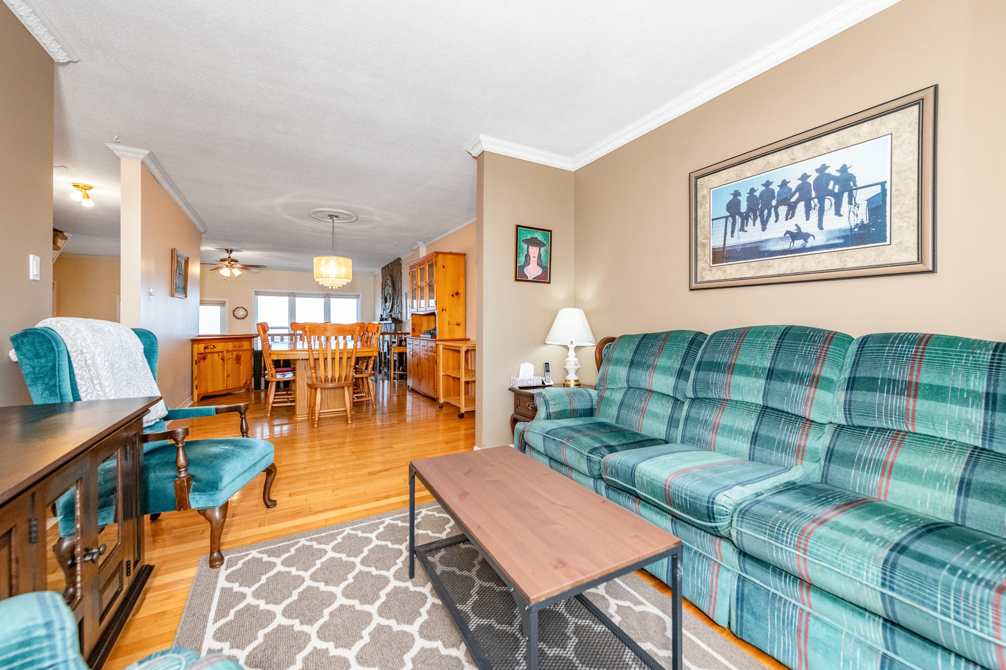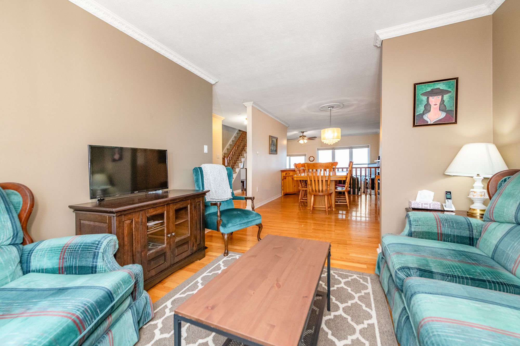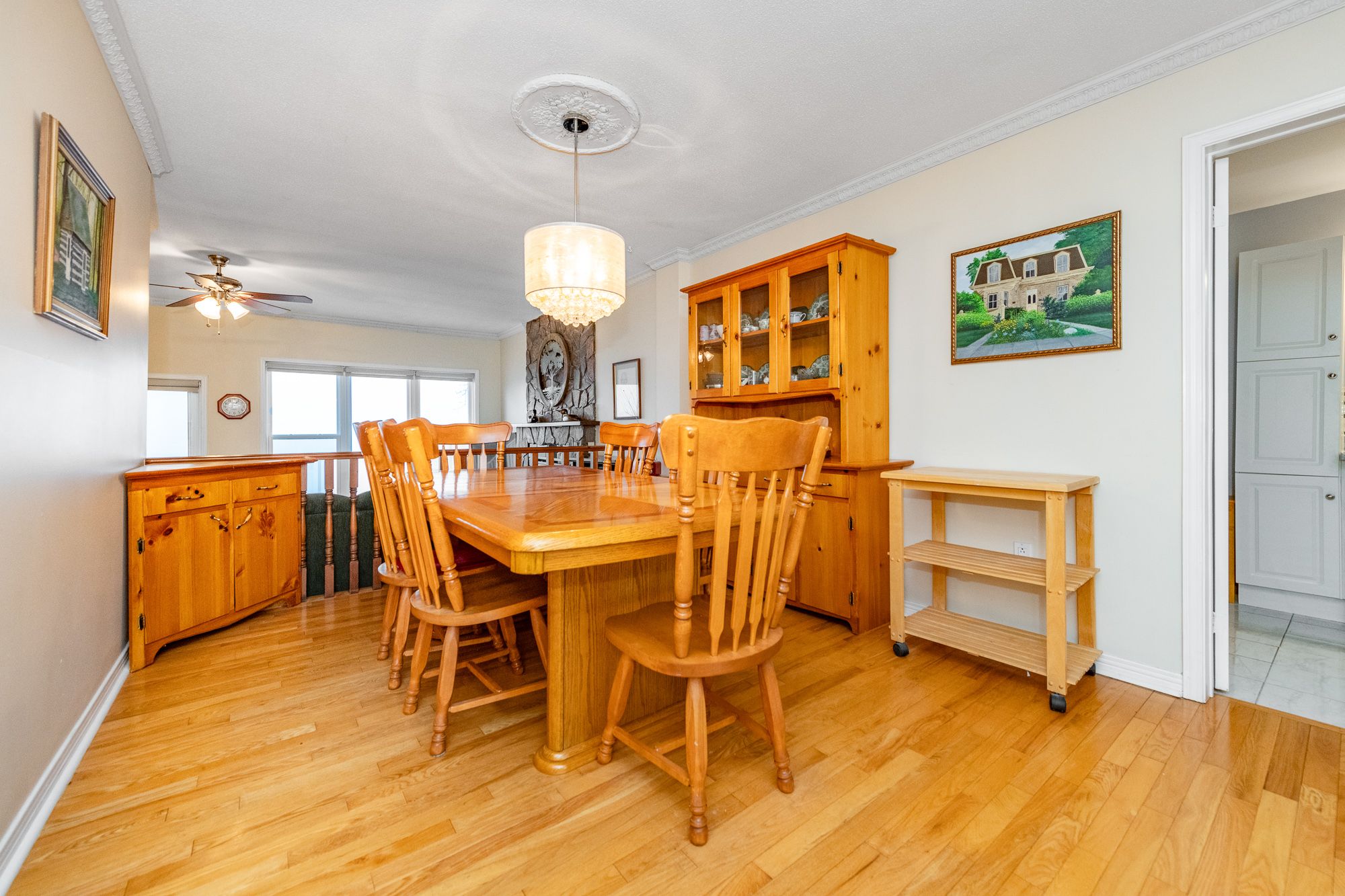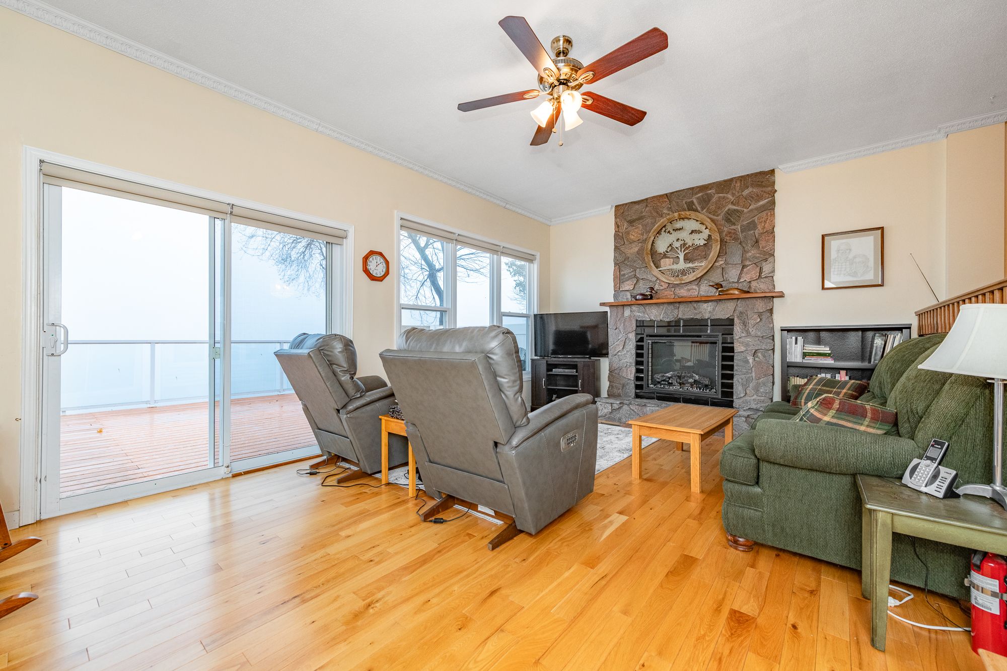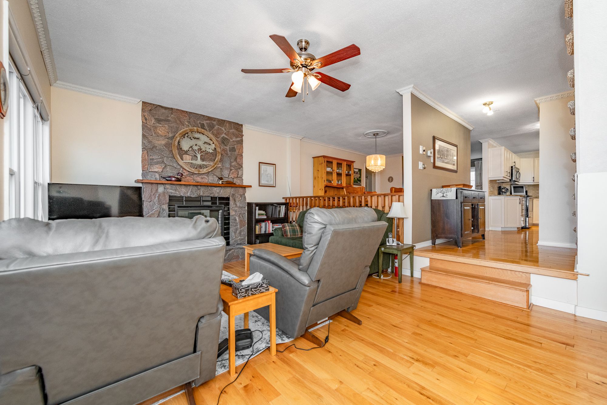 • Open-concept layout with hardwood floors and a cozy fireplace.