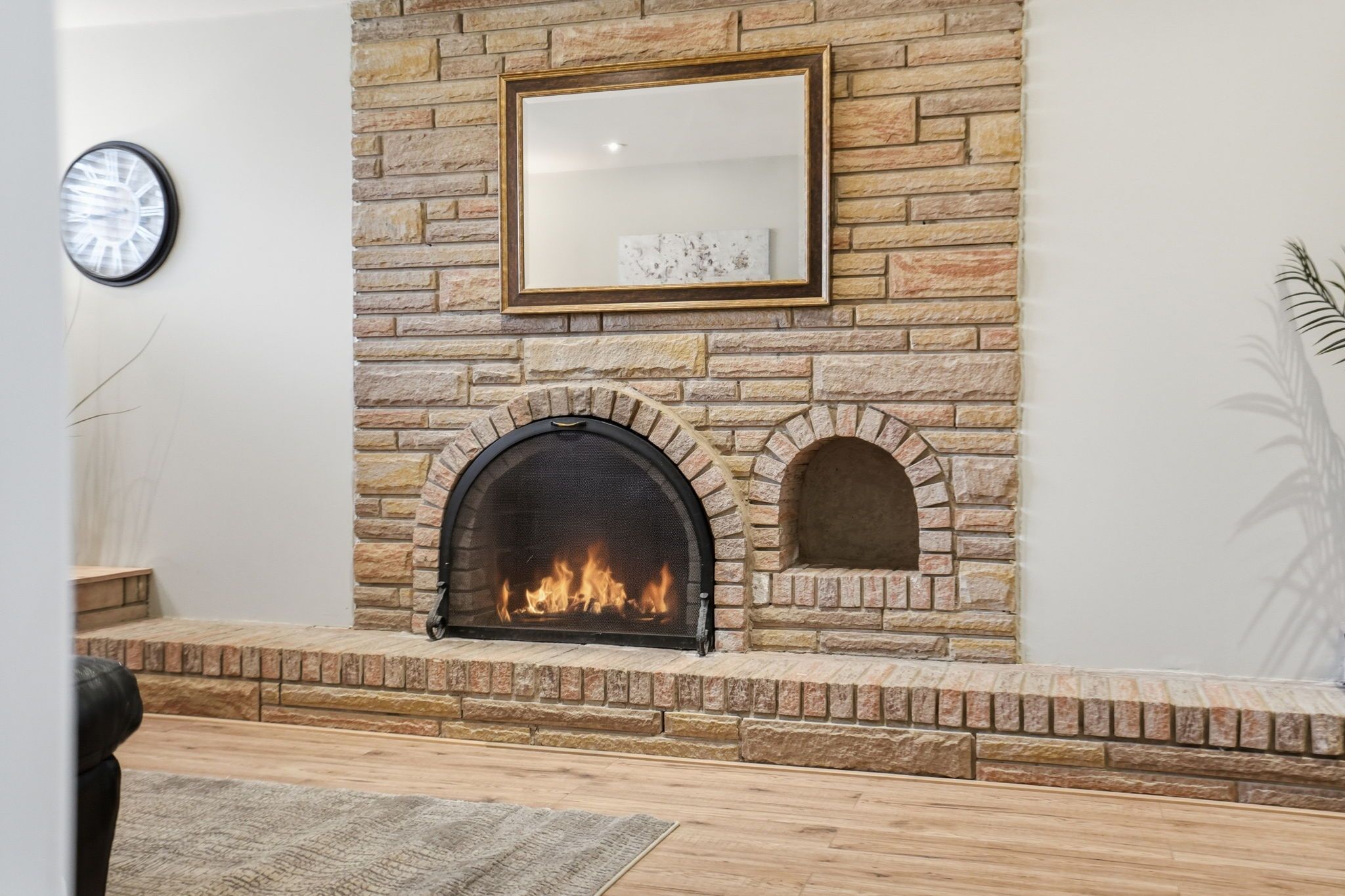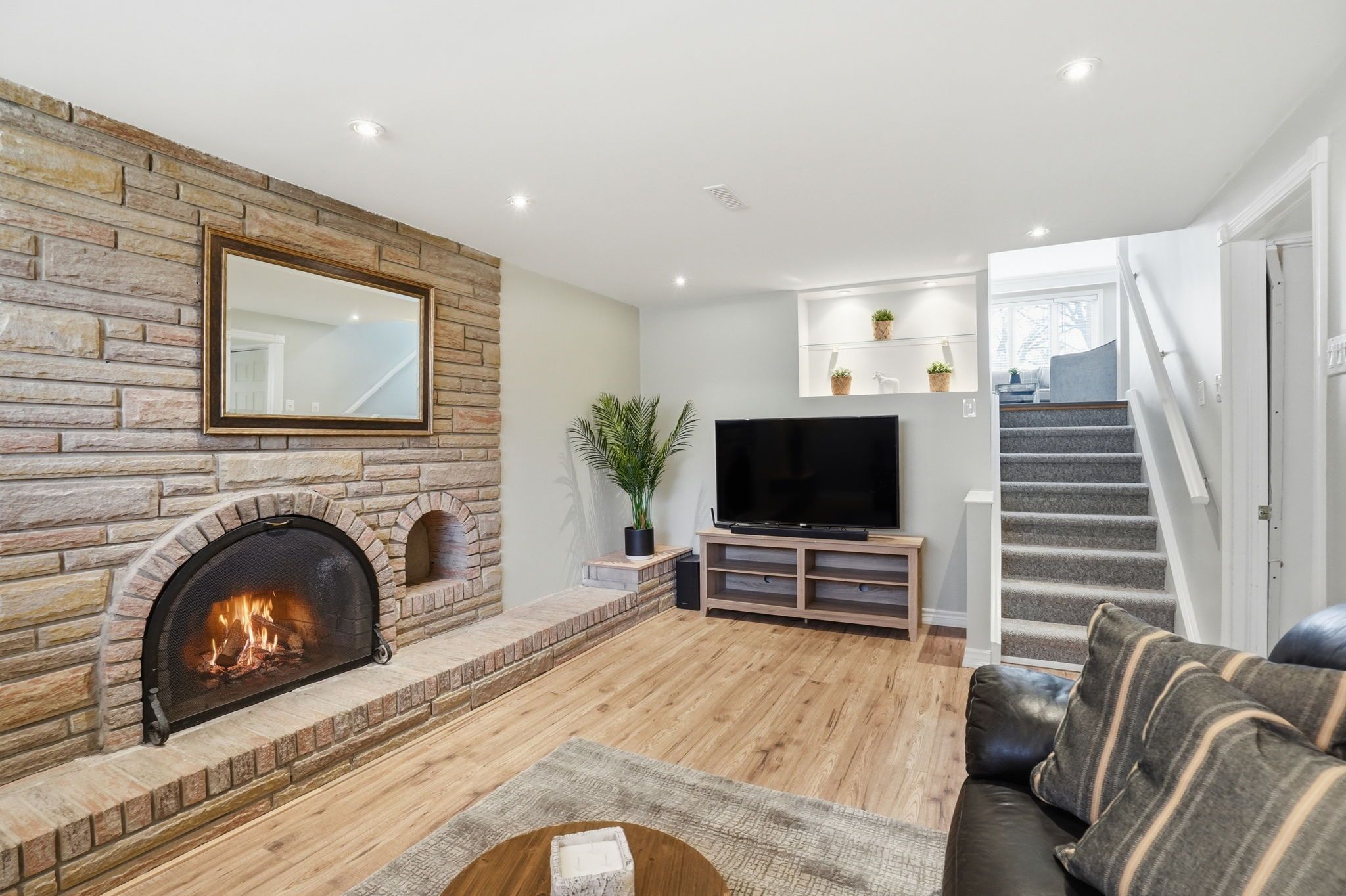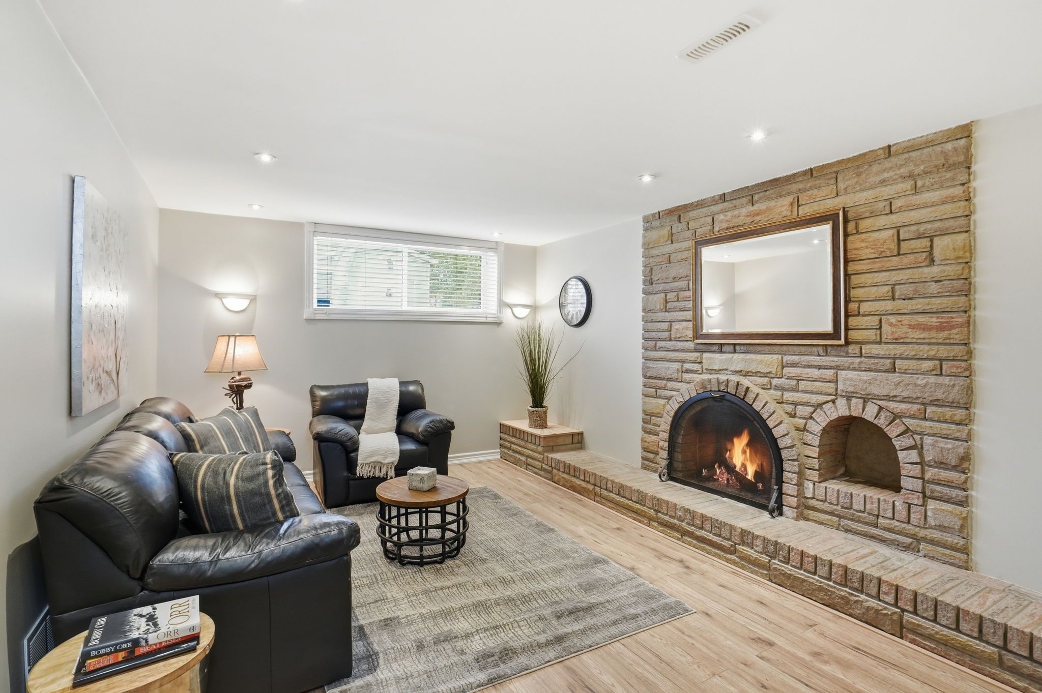 • Welcoming lower level with a wood burning fireplace for relaxation.