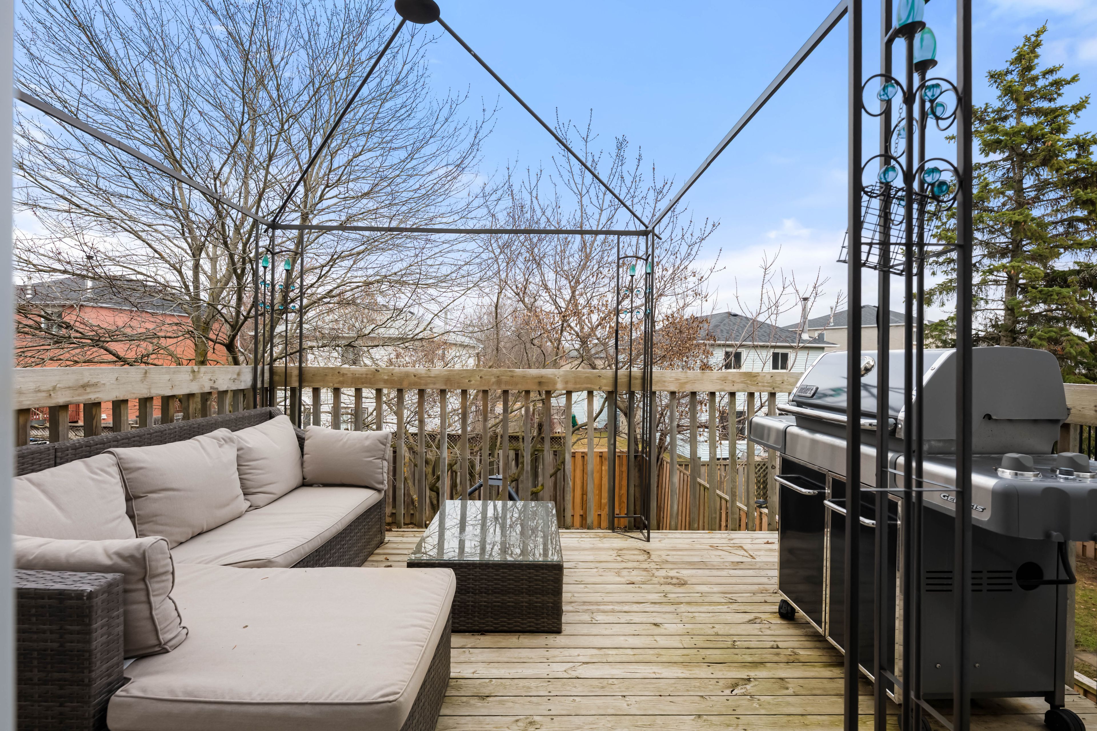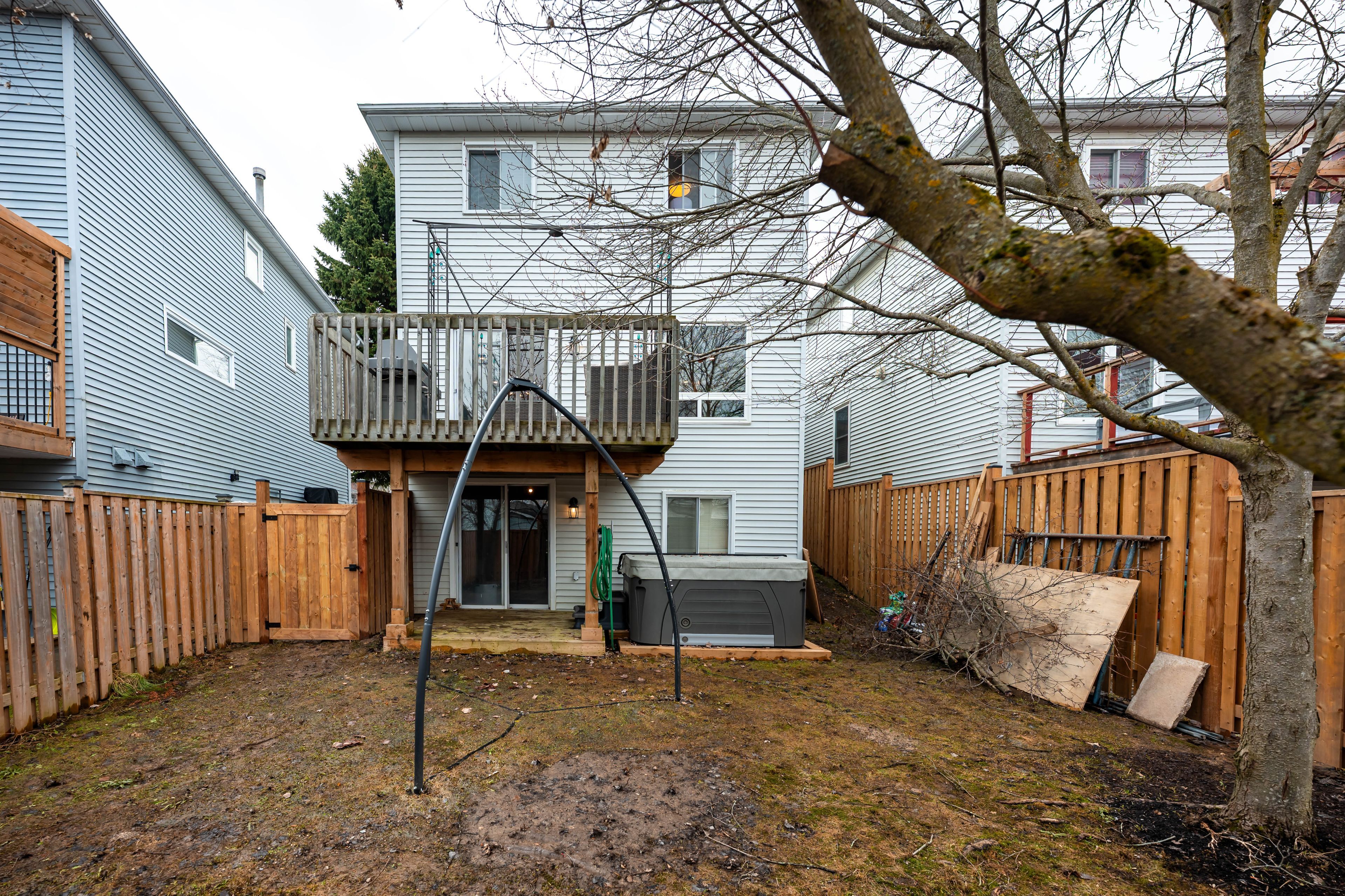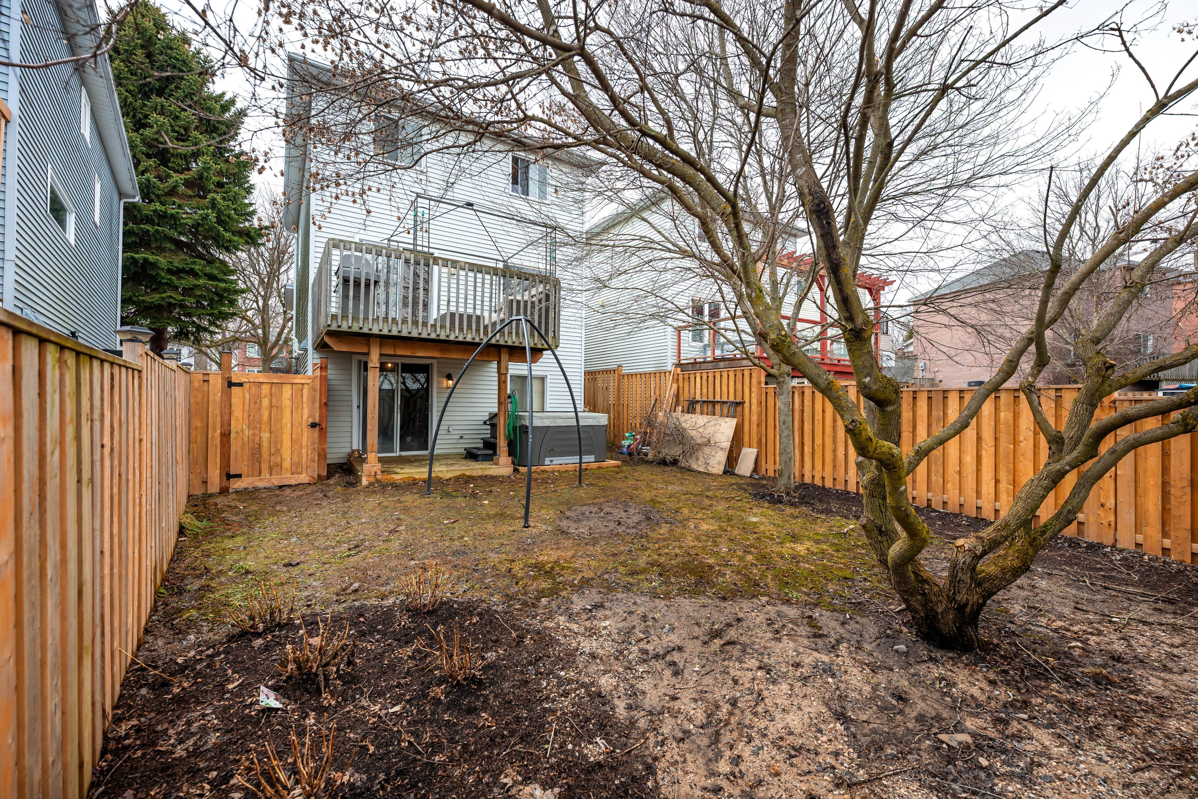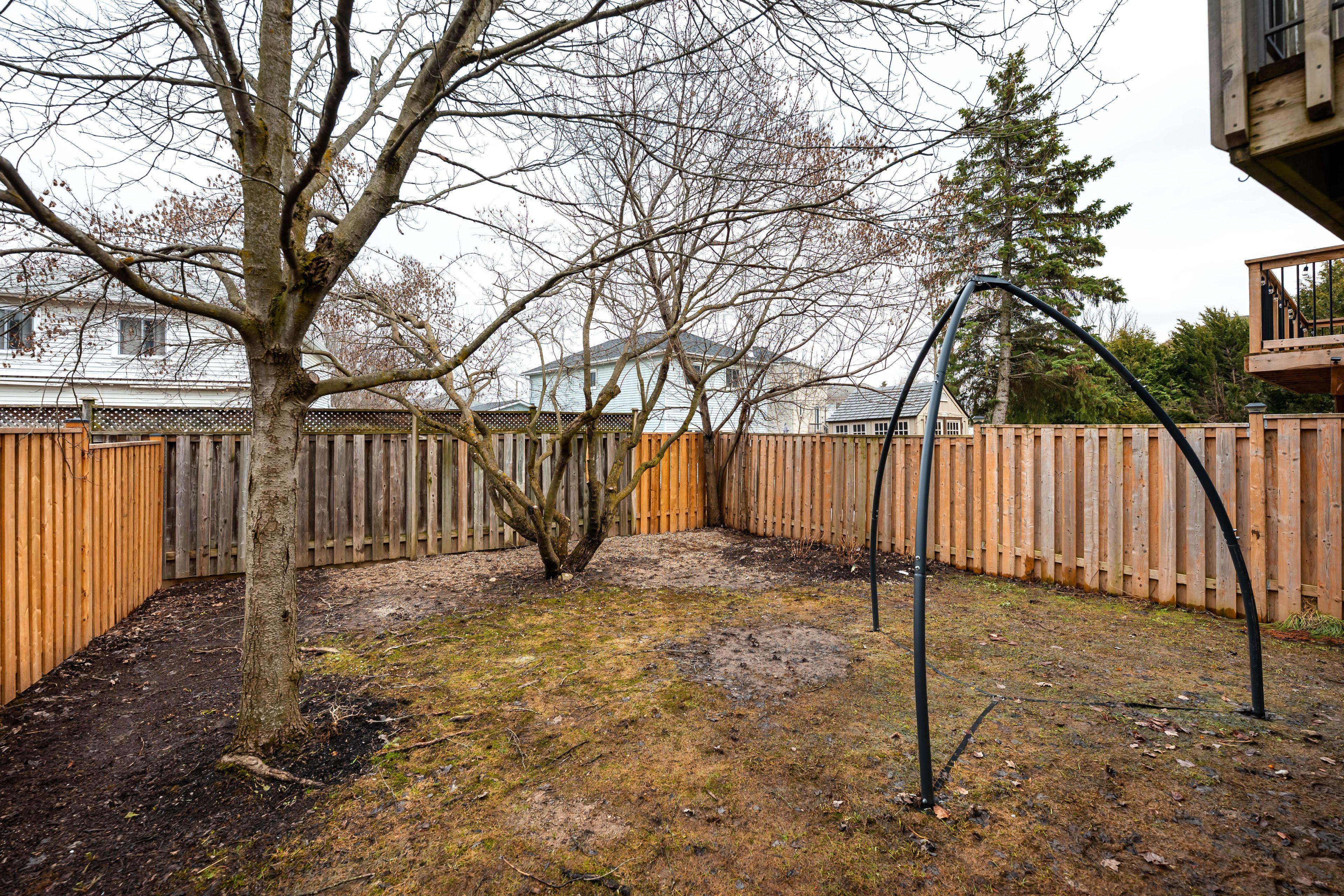 • Fenced backyard with mature trees and raised deck for outdoor relaxation.