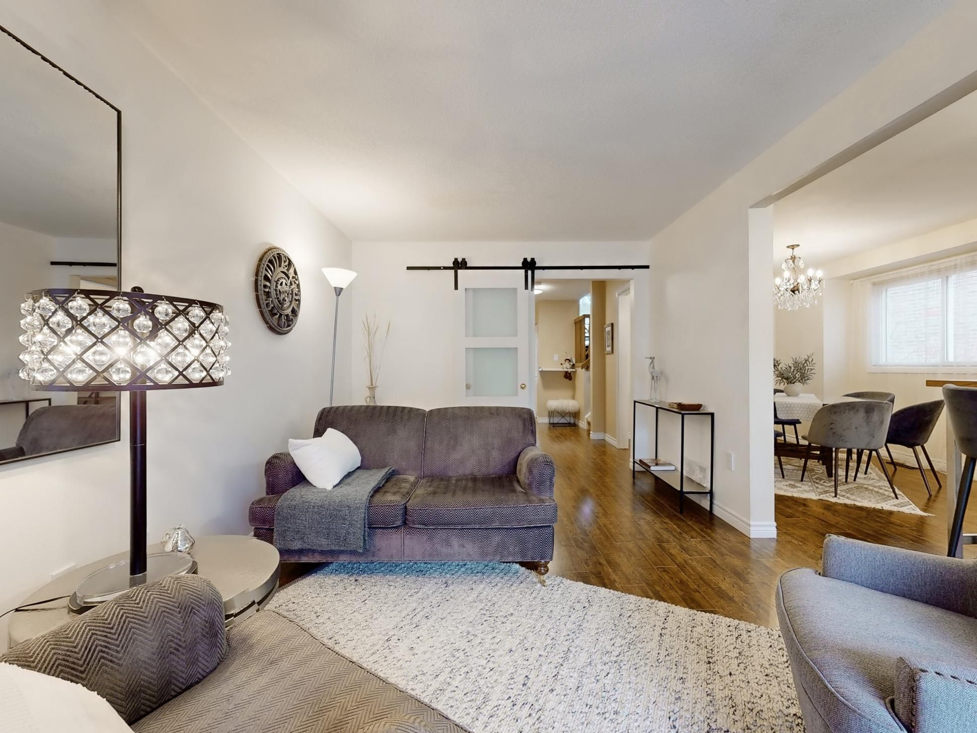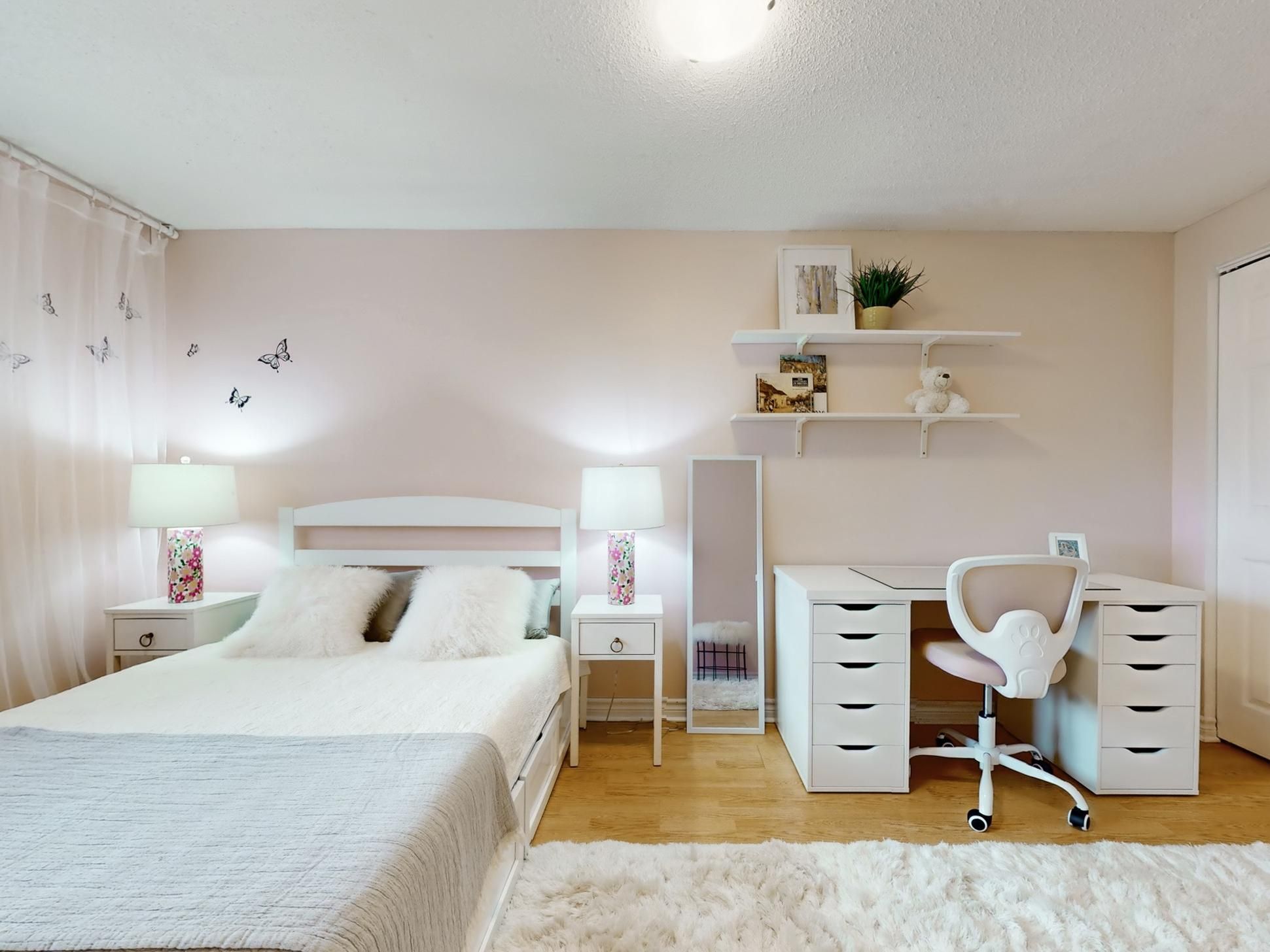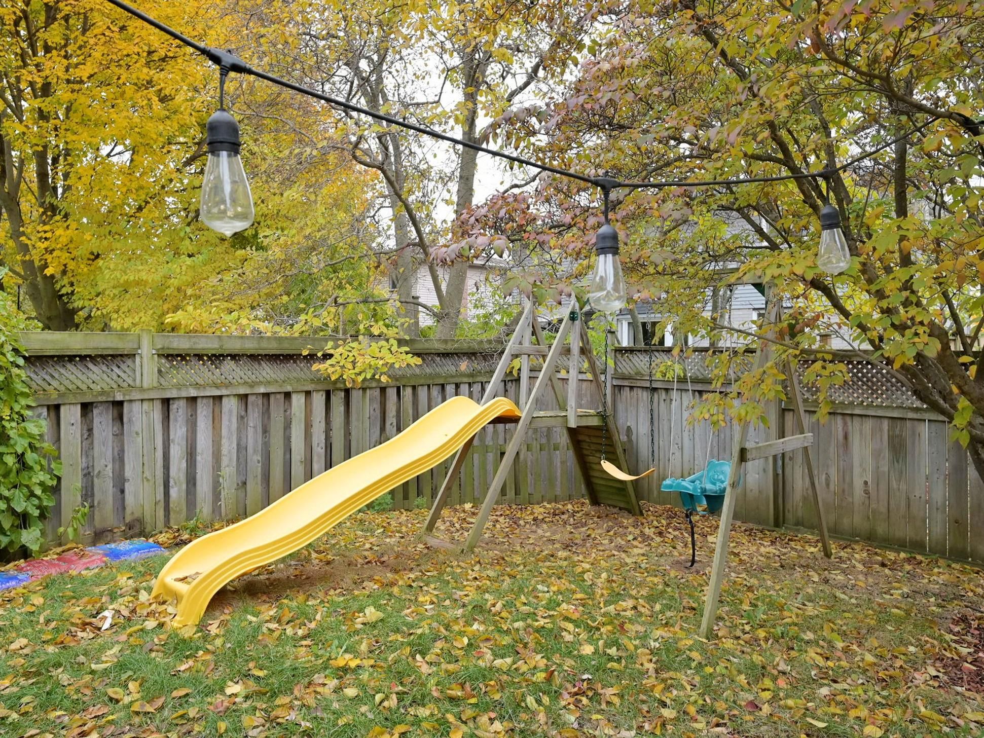 Spacious and inviting detached home on a premium pie-shaped lot! Welcome to this bright, beautifully updated home featuring an oversized 1. 5-car garage, a deep 3-car driveway and a fantastic lot with 39 feet across the back. The formal family room charms with barn doors, a real wood-burning fireplace, and a walk-out to a pool-sized backyard with an interlocked patio, lush greenery, and a children's playground - all included! The open-concept kitchen and dining area are perfect for everyday living and family gatherings. A stunning media room with a 12. 5-ft sloped ceiling, new natural hardwood floors, and a large front window creates the ultimate entertainment space. Upstairs, you'll find three spacious bedrooms and a bright 4-pc bath with a window. The finished basement adds even more living space with a bonus bedroom and lots of storage. No carpet anywhere. Excellent location - just minutes to the go train, hw403, parks, and schools. Popular lansdown park with splash pad nd bike path right across the road. Warm, light-filled, and move-in ready - this home truly has it all.