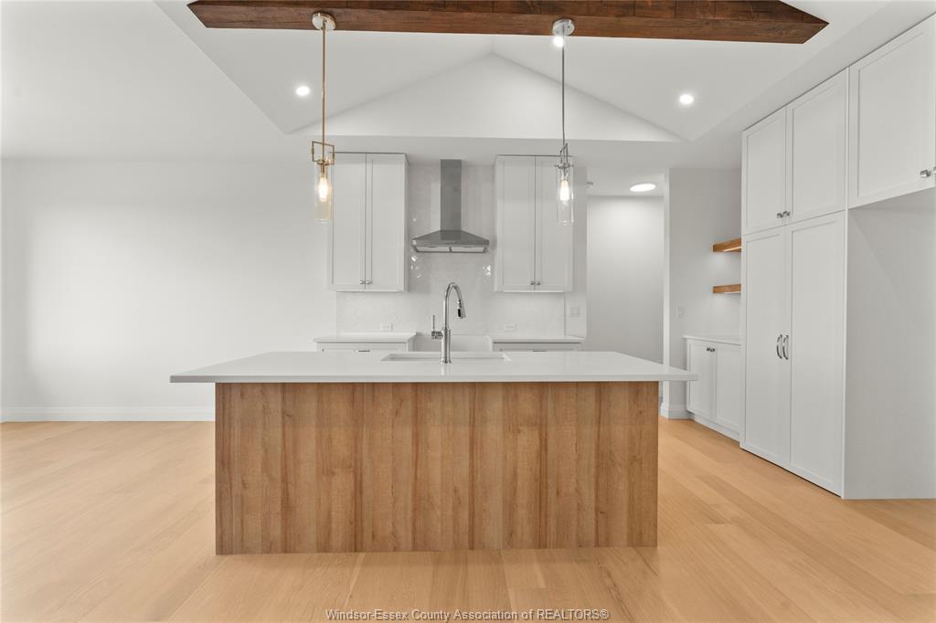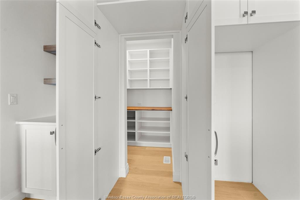 • Modern kitchen boasting stylish cabinets, granite countertops, and hidden pantry.