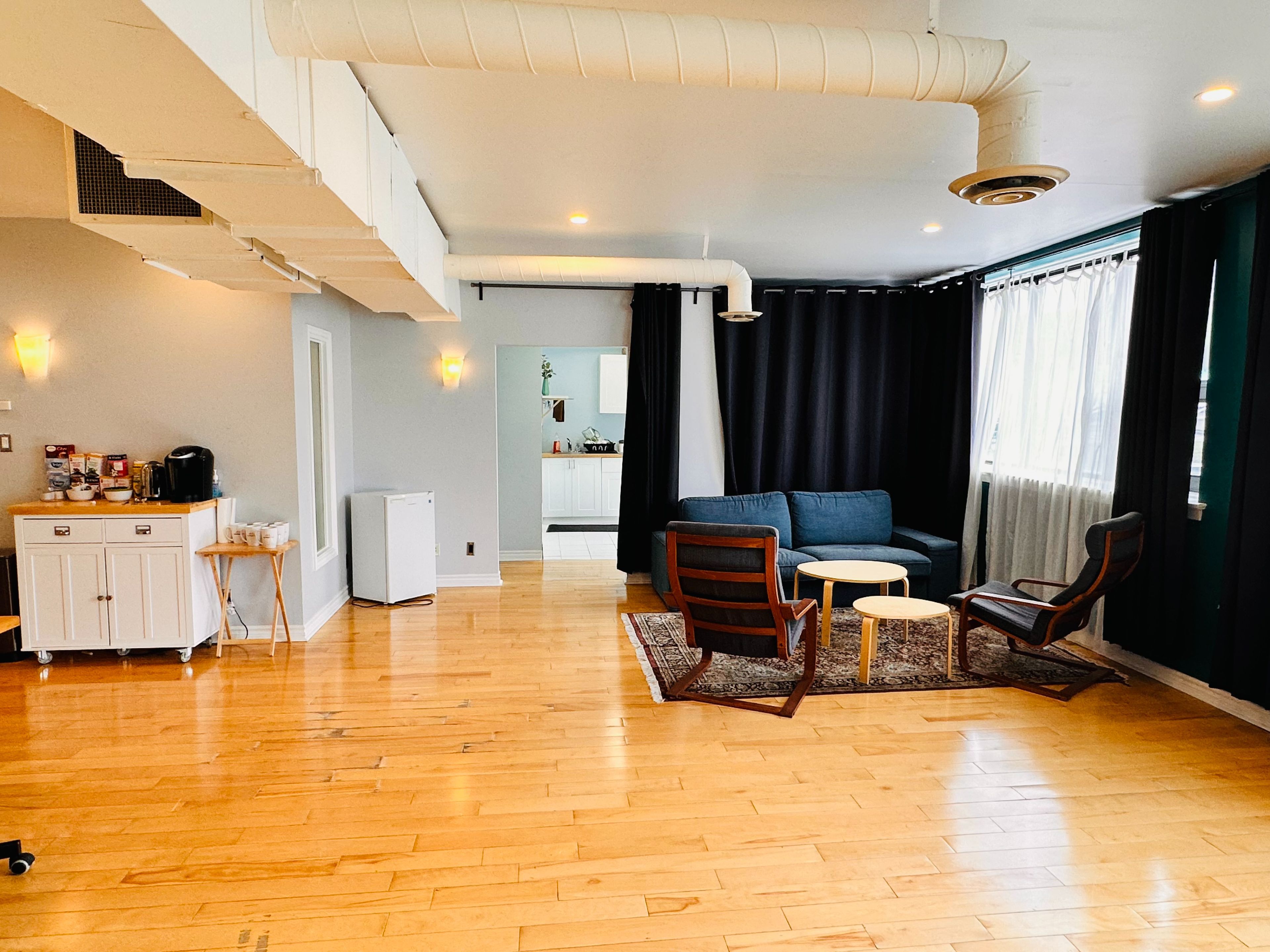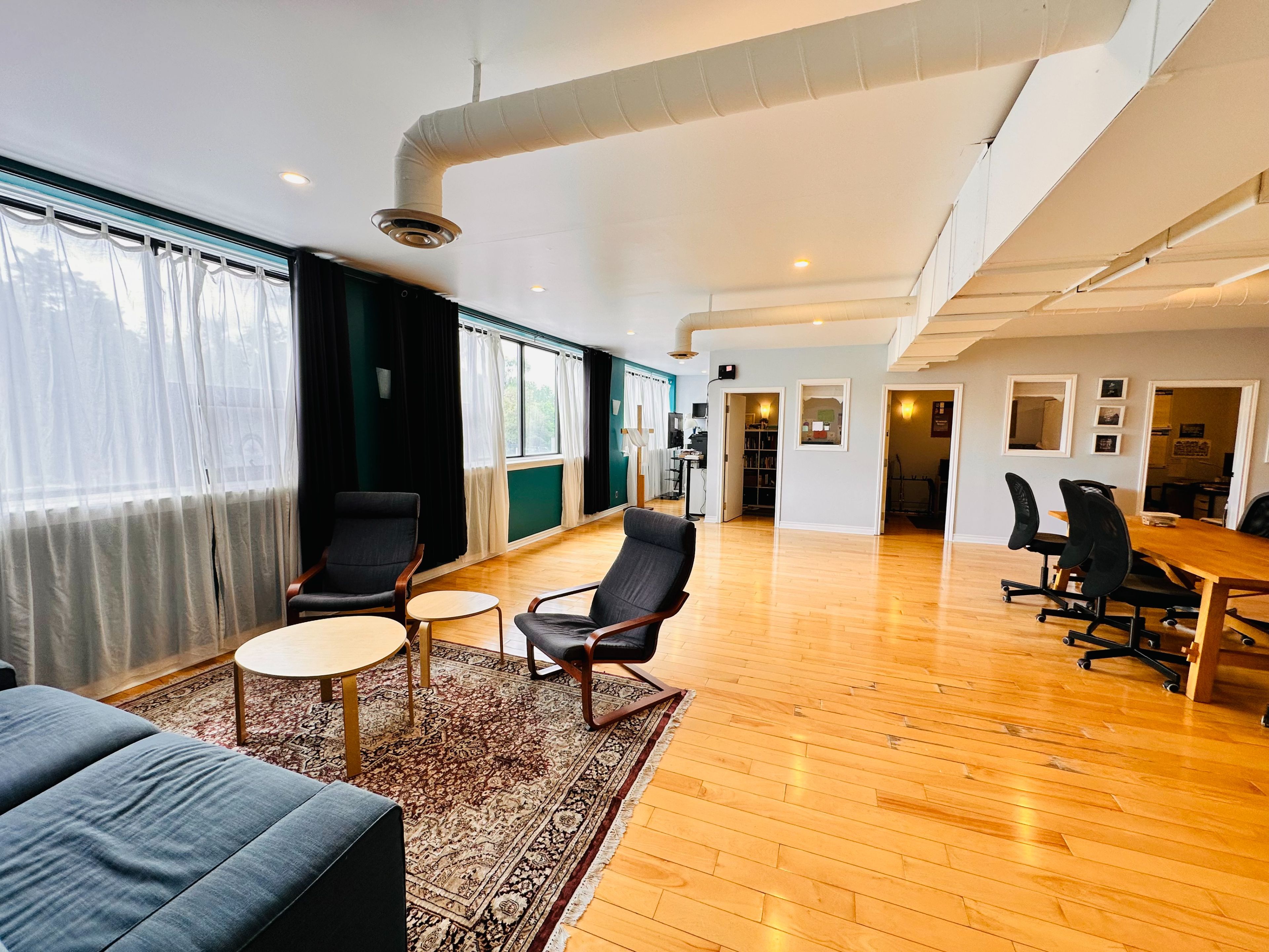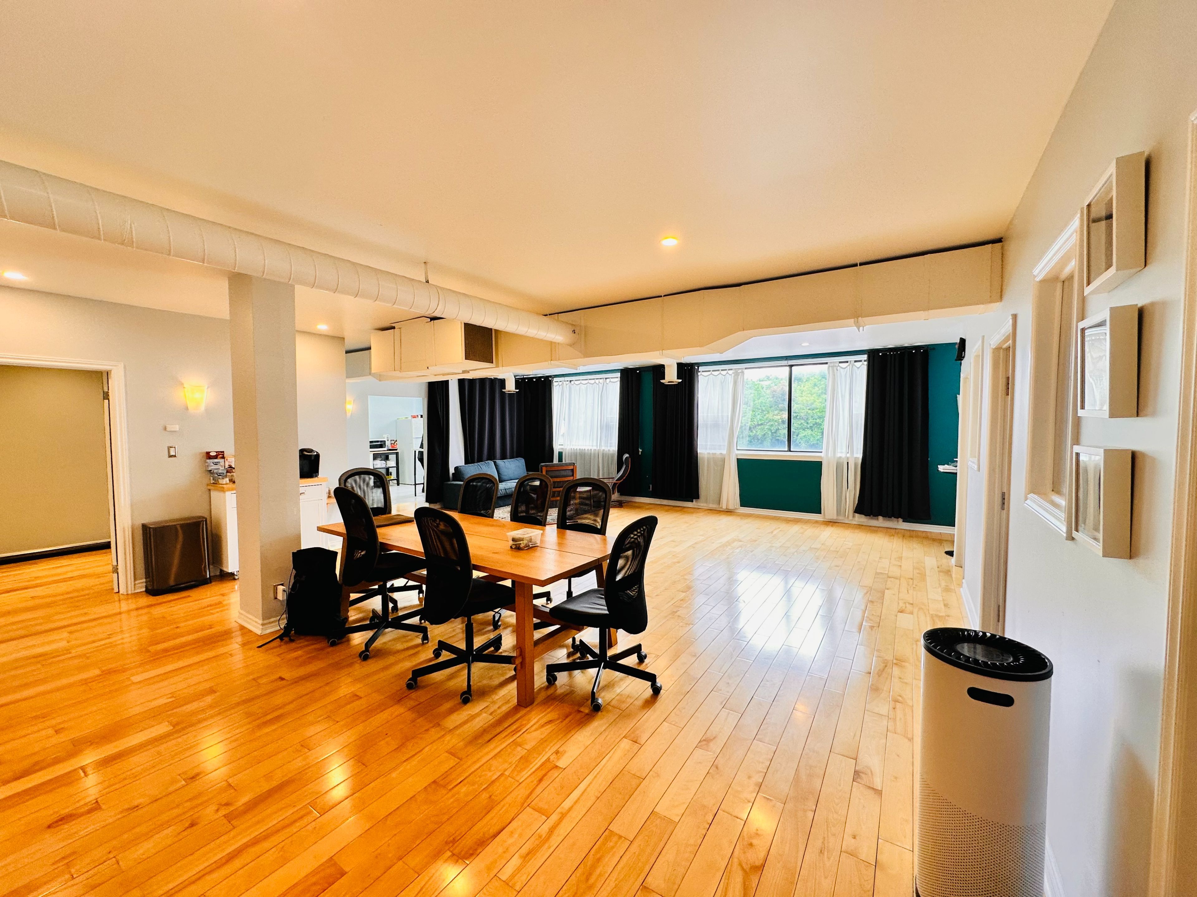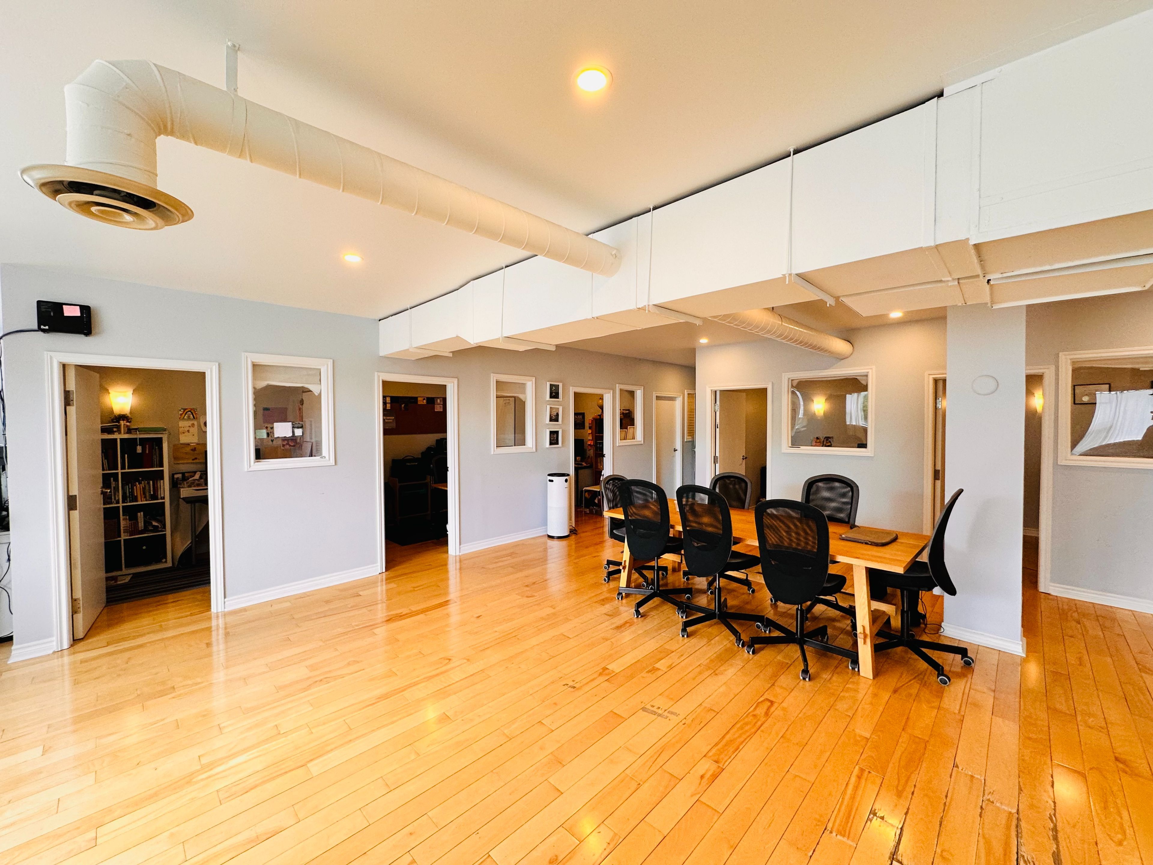 • Large windows provide plenty of natural light, enhancing the workspace atmosphere.