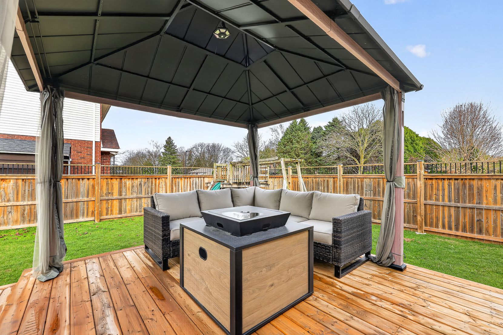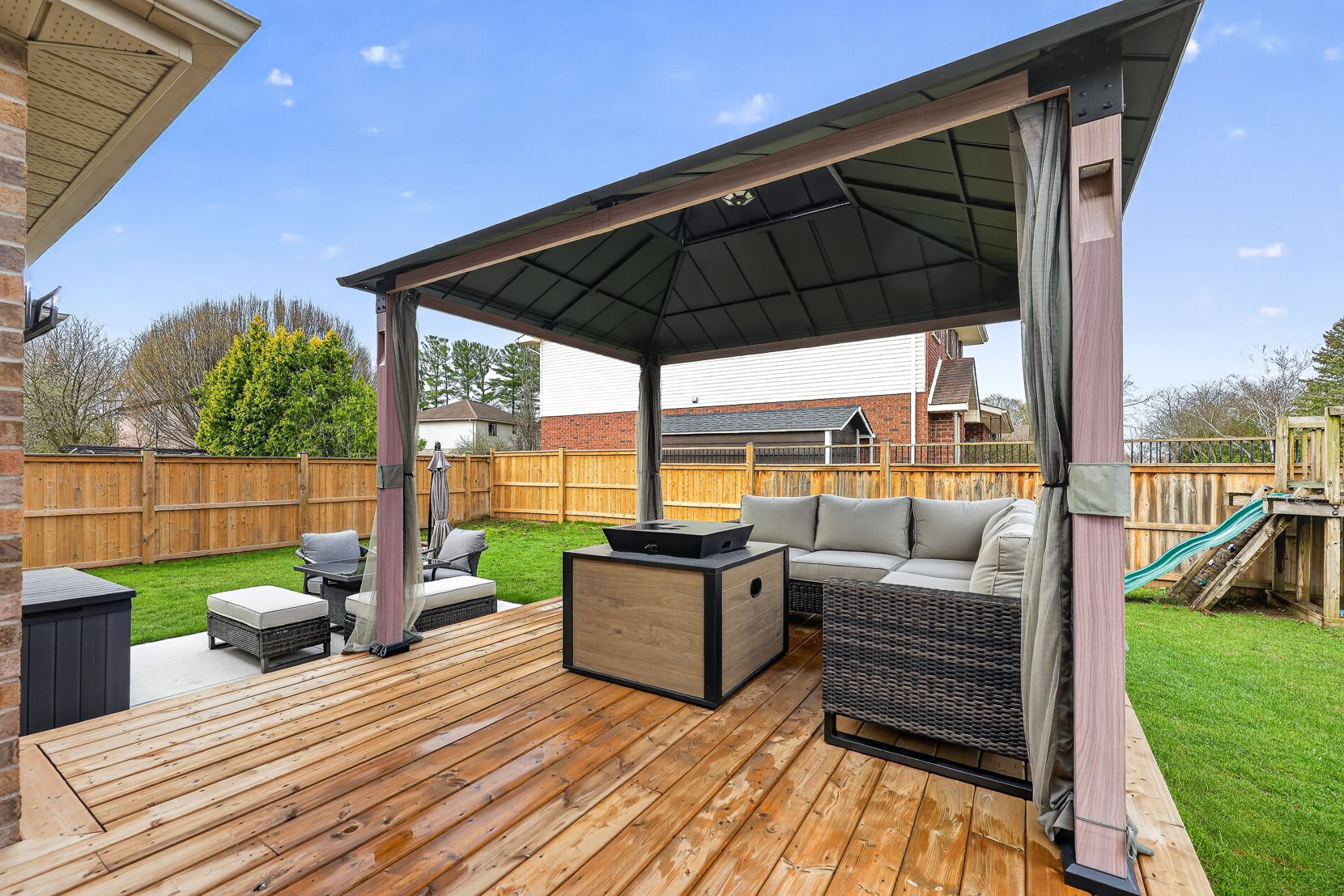 • Private fenced yard with a large deck and gazebo for outdoor enjoyment.