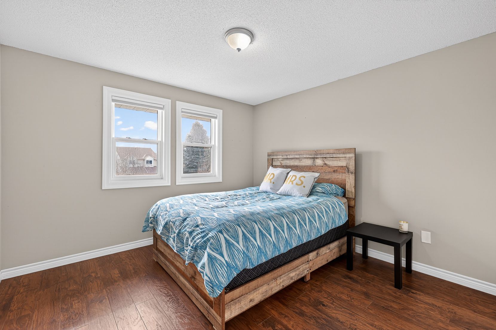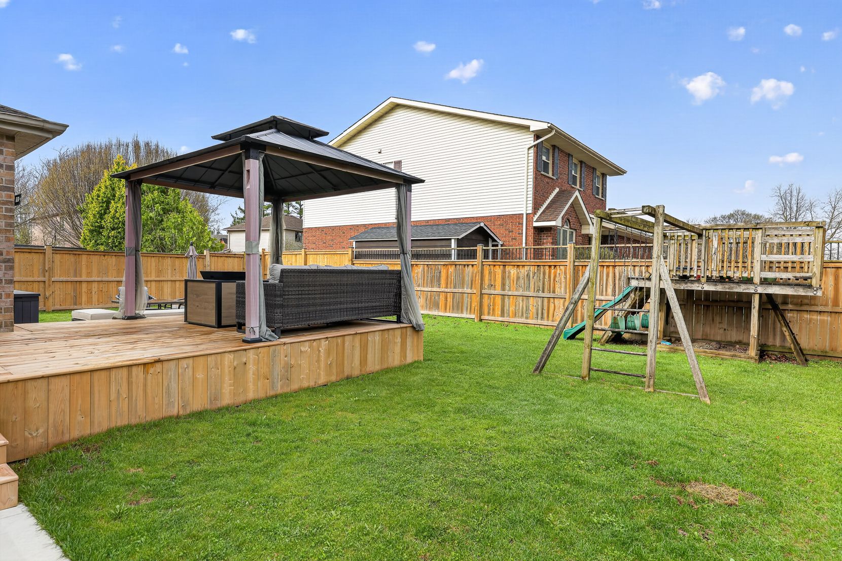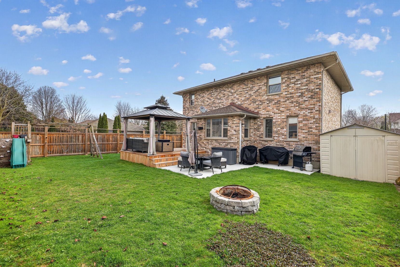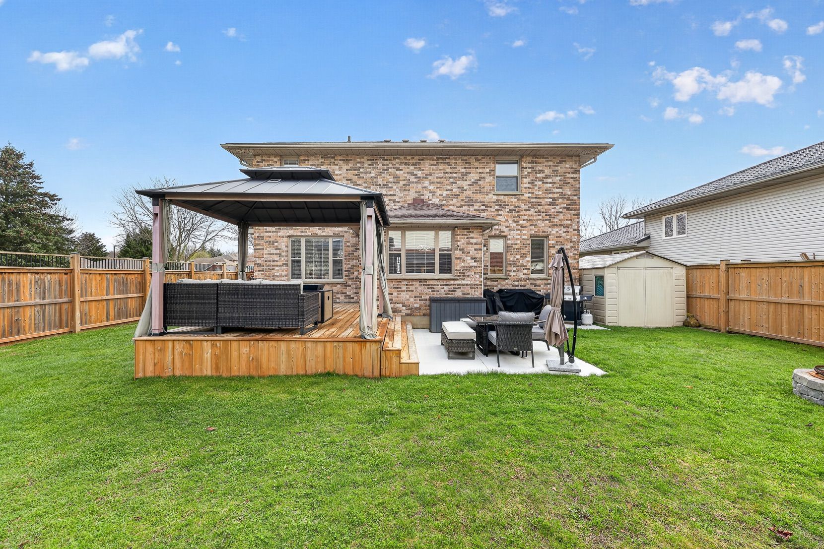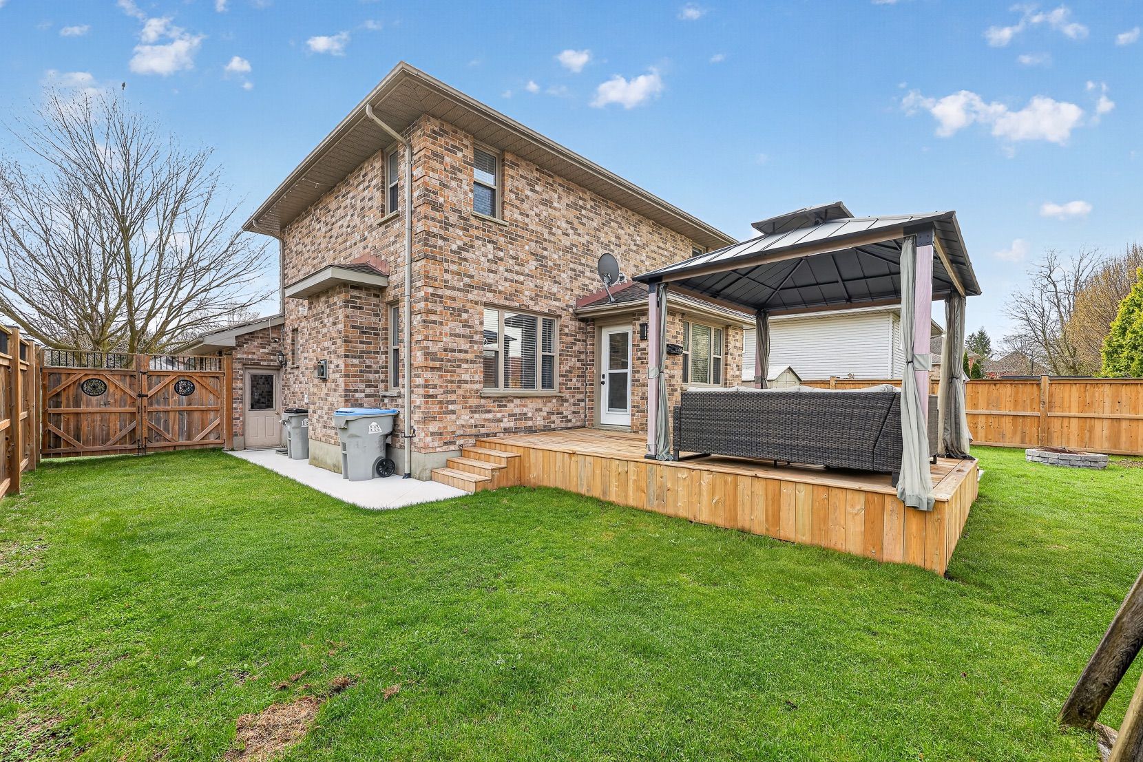 Not just updated-transformed with a stunning brand new custom kitchen completed in april 2026. This beautifully updated all-brick two-storey offers over 2,400 sq ft of finished living space spread across all three levels on a beautifully maintained corner lot in an established strathroy neighbourhood. The custom kitchen is designed to impress with custom cabinetry, crown moulding, granite countertops, tiled backsplash, large island and exceptional workspace for everyday living and entertaining. Paired with all new upgraded laminate flooring throughout the main floor, these recent improvements have created a fresh, cohesive feel throughout the home. The main floor features bright, spacious principal rooms, an inviting living room, dining area, 2pc bathroom and convenient main floor laundry with garage access. Upstairs, you'll find three generous bedrooms, including a primary retreat with walk-in closet featuring custom organizers and a private ensuite with soaker tub, along with an updated main bath. The finished lower level expands the living space with a family room, workout room/office, and a three-piece bathroom ideal for guests, teens, or home office flexibility. Outside, enjoy a private fenced yard with a large deck with gazebo, lower concrete patio, and plenty of room to entertain or unwind. Additional updates over recent years include windows, front door, bathrooms, lighting, outlets, paint, popcorn ceiling removal, deck, concrete walkway and patio. With major improvements already completed, this move-in ready family home offers the space, style, and substance today's buyers are looking for.