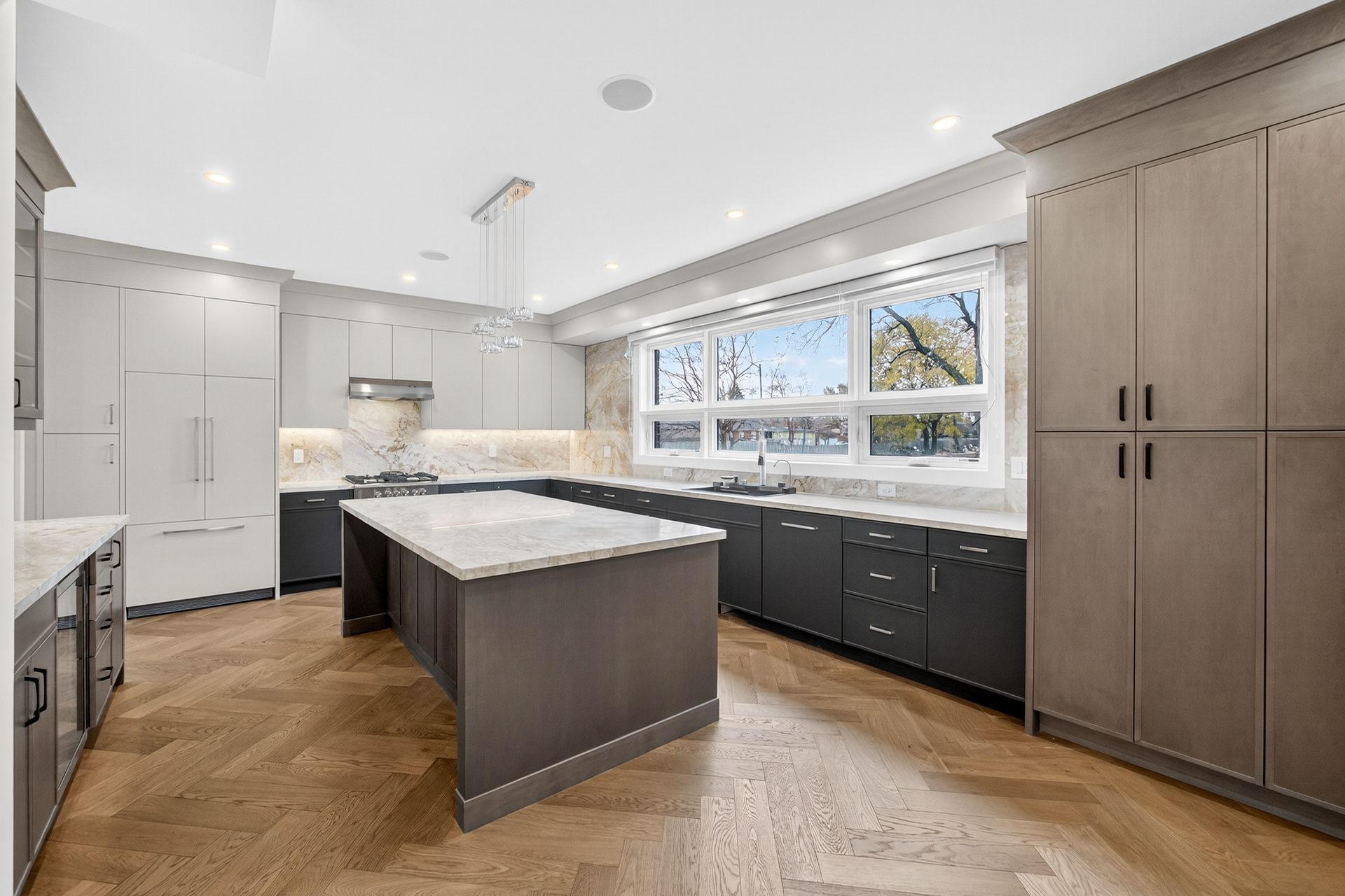 • Open concept kitchen with quartzite counters and high-end appliances.