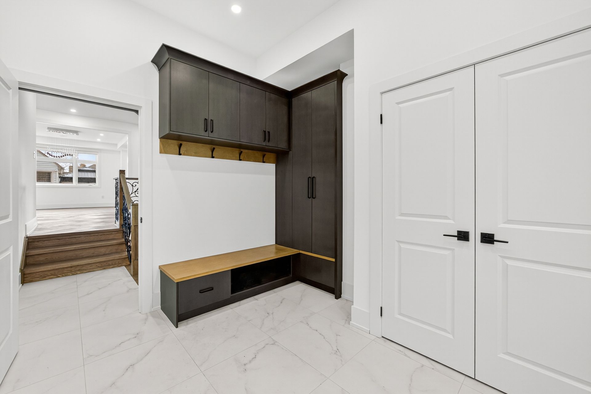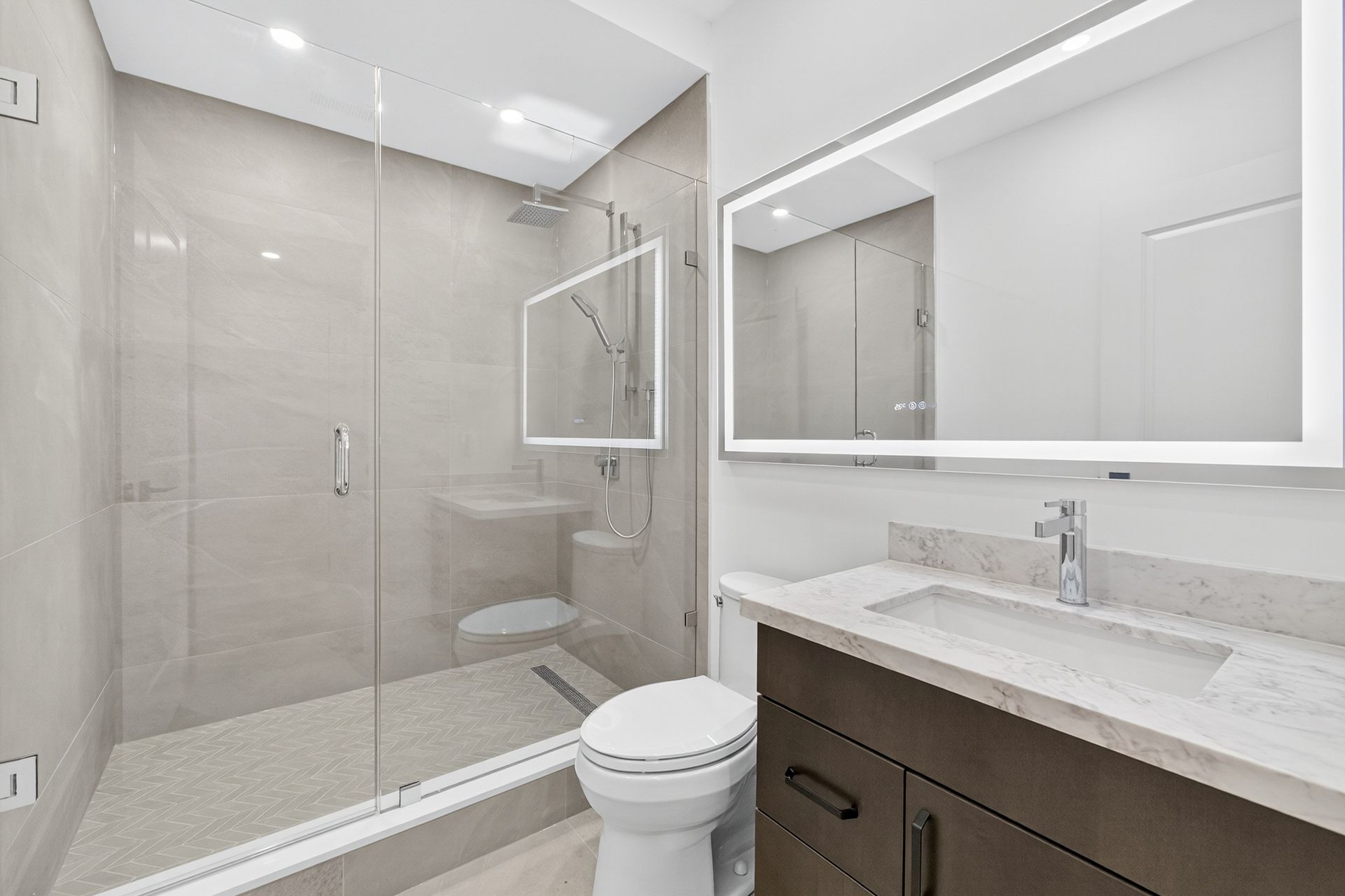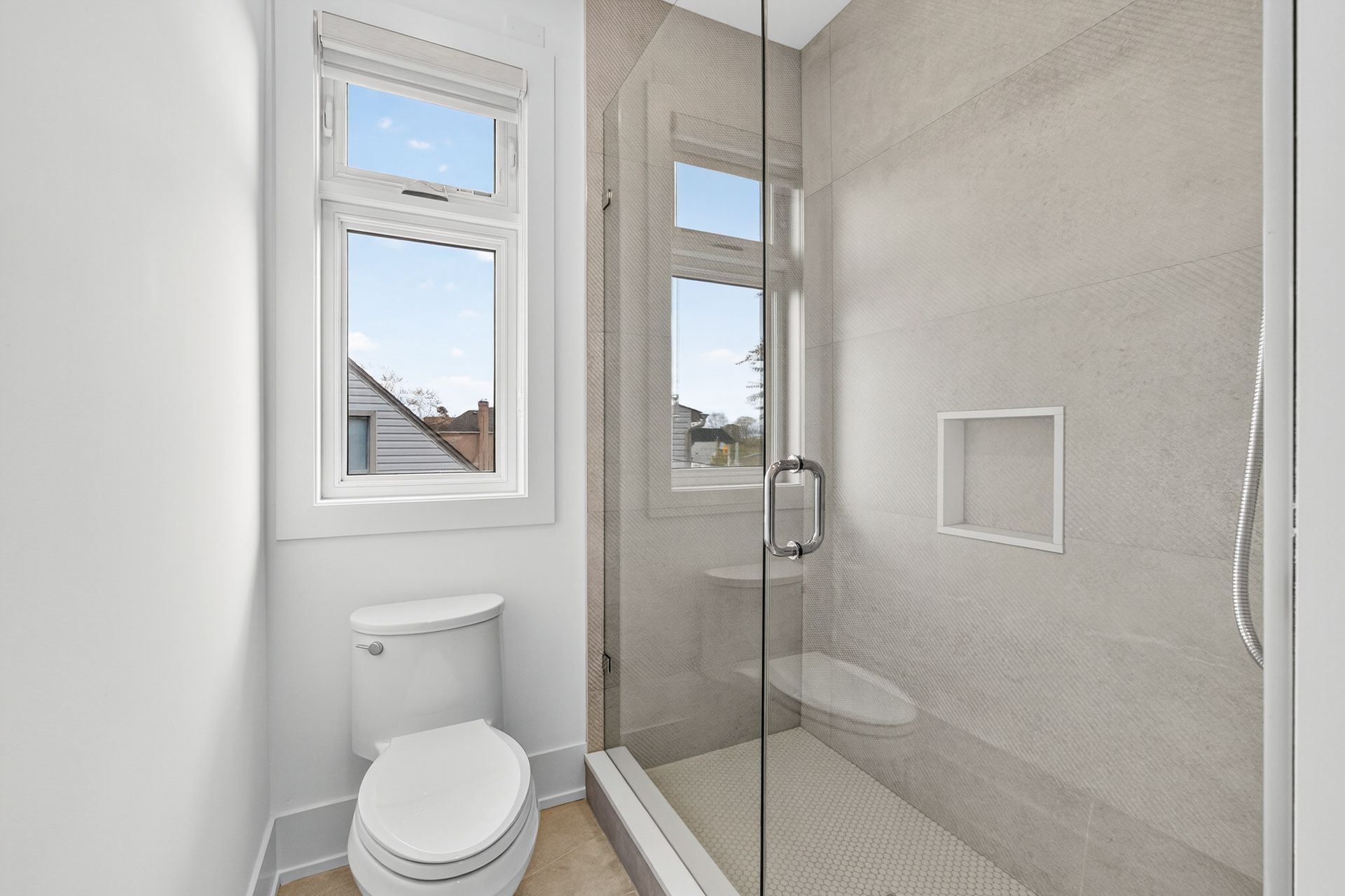 • Stylish herringbone hardwood flooring and oversized windows throughout.