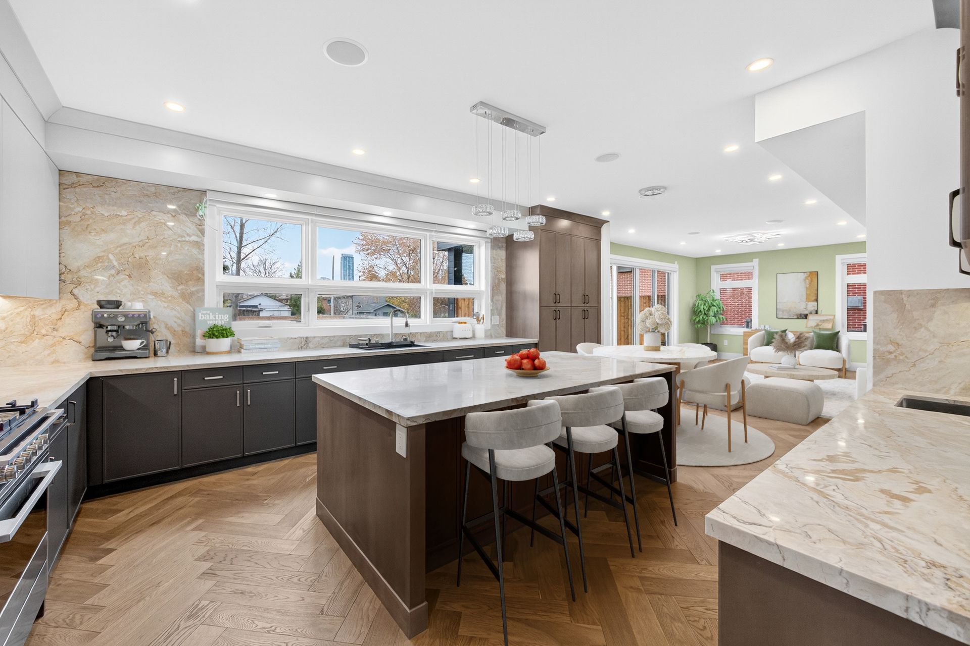 • Open concept kitchen with quartzite counters and top-tier appliances.