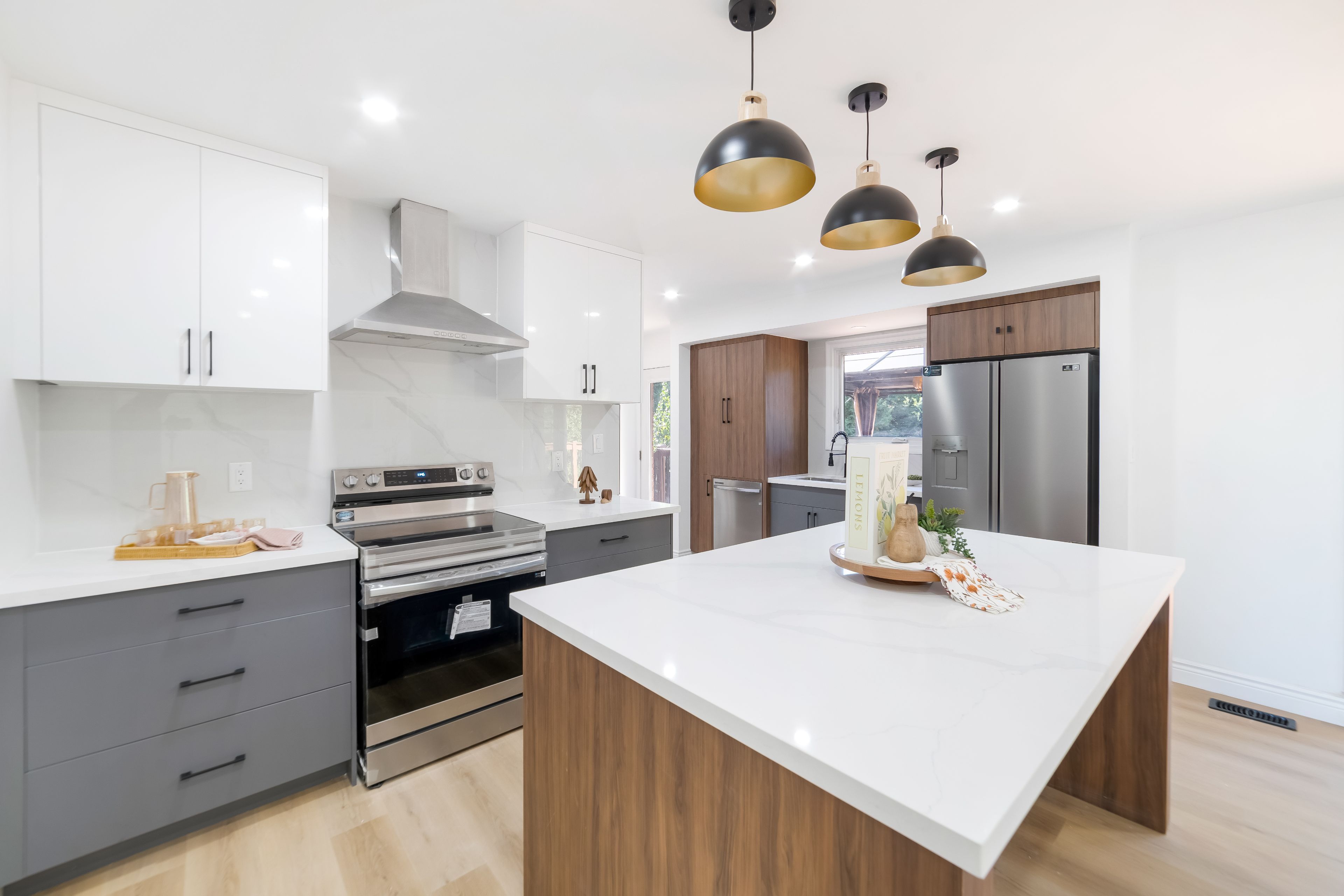 Presenting a beautifully updated 3-bedroom, 2-bathroom bungalow, perfectly located in a highly desirable neighborhood on a sprawling 78ft x 150ft lot. Over $120,000 has been invested in upgrades, including a brand-new custom luxury kitchen valued at $40,000. Step inside to a spacious foyer that leads into a naturally lit living room, setting the tone for the elegance found throughout the home. The stunning kitchen features quartz countertops, timeless three-tone cabinetry, a modern black sink, and high-end stainless steel appliances. A central island offers the perfect space for cooking and casual dining. The main floor boasts three inviting bedrooms, including a master with a custom ensuite and built-in cabinetry. A bright, custom laundry room completes the main level. The lower level offers a partially finished space with a beautiful rec room, providing versatile options for family living or entertainment. The fully fenced backyard is an entertainer's dream, featuring a large above-ground pool, a substantial deck, and an expansive covered porch ideal for year-round relaxation. Additional highlights include an attached garage, asphalt double-wide driveway, and meticulously maintained landscaping with a brick front and walkway enhancing the home's curb appeal. Other notable upgrades include attic insulation (2025), appliances (2025), kitchen cabinets (2025), renovated bathrooms (2025), brand-new pot-lights (2025), and much more. This home is truly move-in ready and offers a perfect blend of luxury, comfort, and functionality.