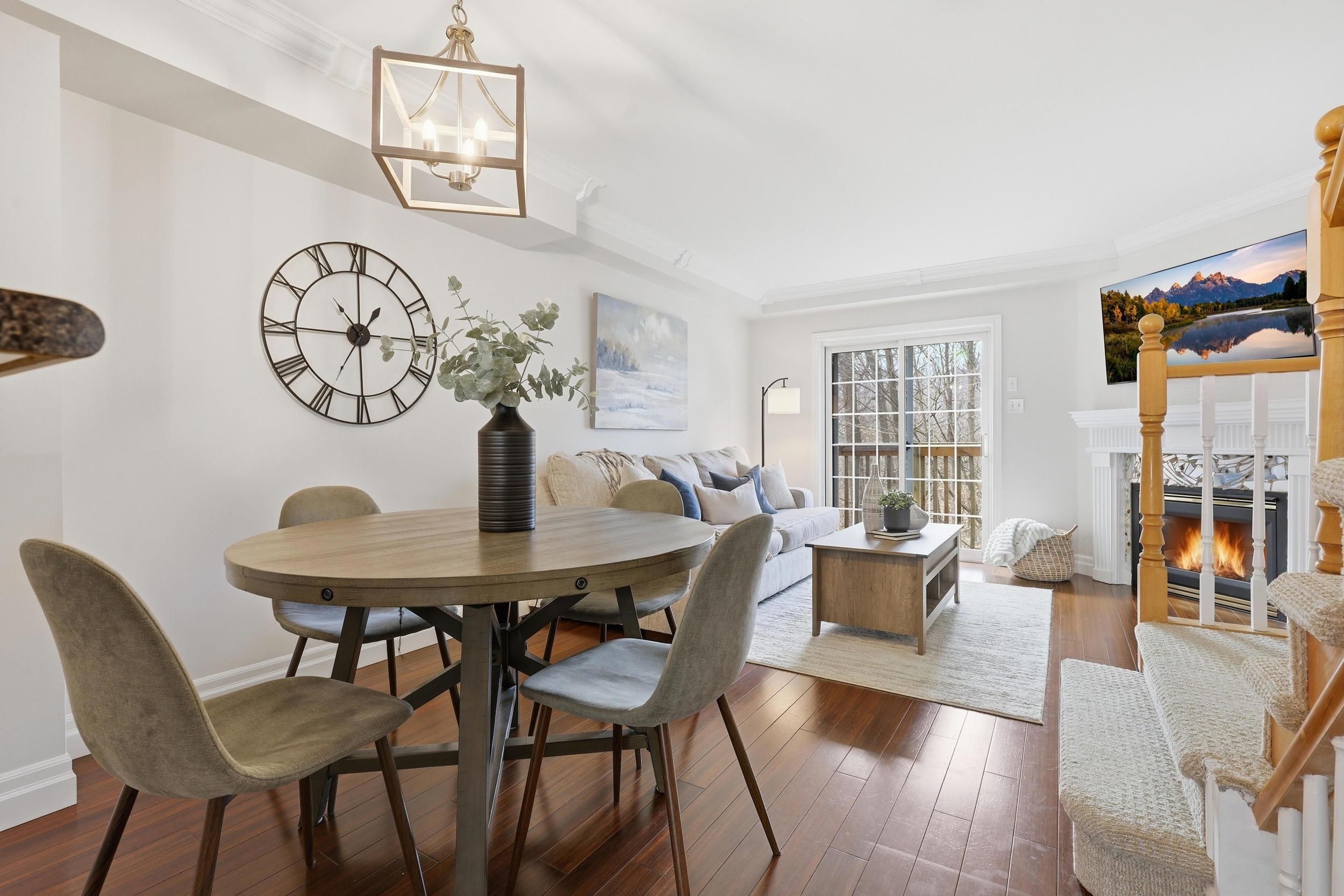 Breathtaking views from this very private ravine lot with no rear neighbours! This bright and spacious home offers a serene and intimate living space with vaulted ceilings, bay windows, a gas fireplace and walk-out to a large patio overlooking greenspace. The open-concept, kitchen-living-dining area is perfect for entertaining. Upstairs, you'll find two generous-sized bedrooms, a newly renovated 4-piece bathroom (2023) and the convenience of upstairs laundry (purchased in 2025). Other updates include new garage door, front door lock, staircases, fresh paint and upgraded light fixtures. The finished lower level with bathroom and garage access provides extra living space or third bedroom. Ideally situated near shops, hwy, restaurants & entertainment, this home delivers an unparalleled maintenance free retreat with snow removal, leaf blowing, window cleaning, and more. Managed by condo!