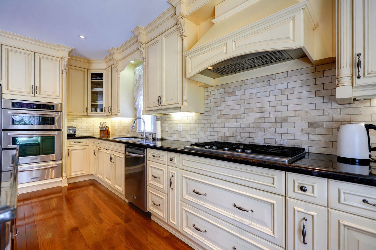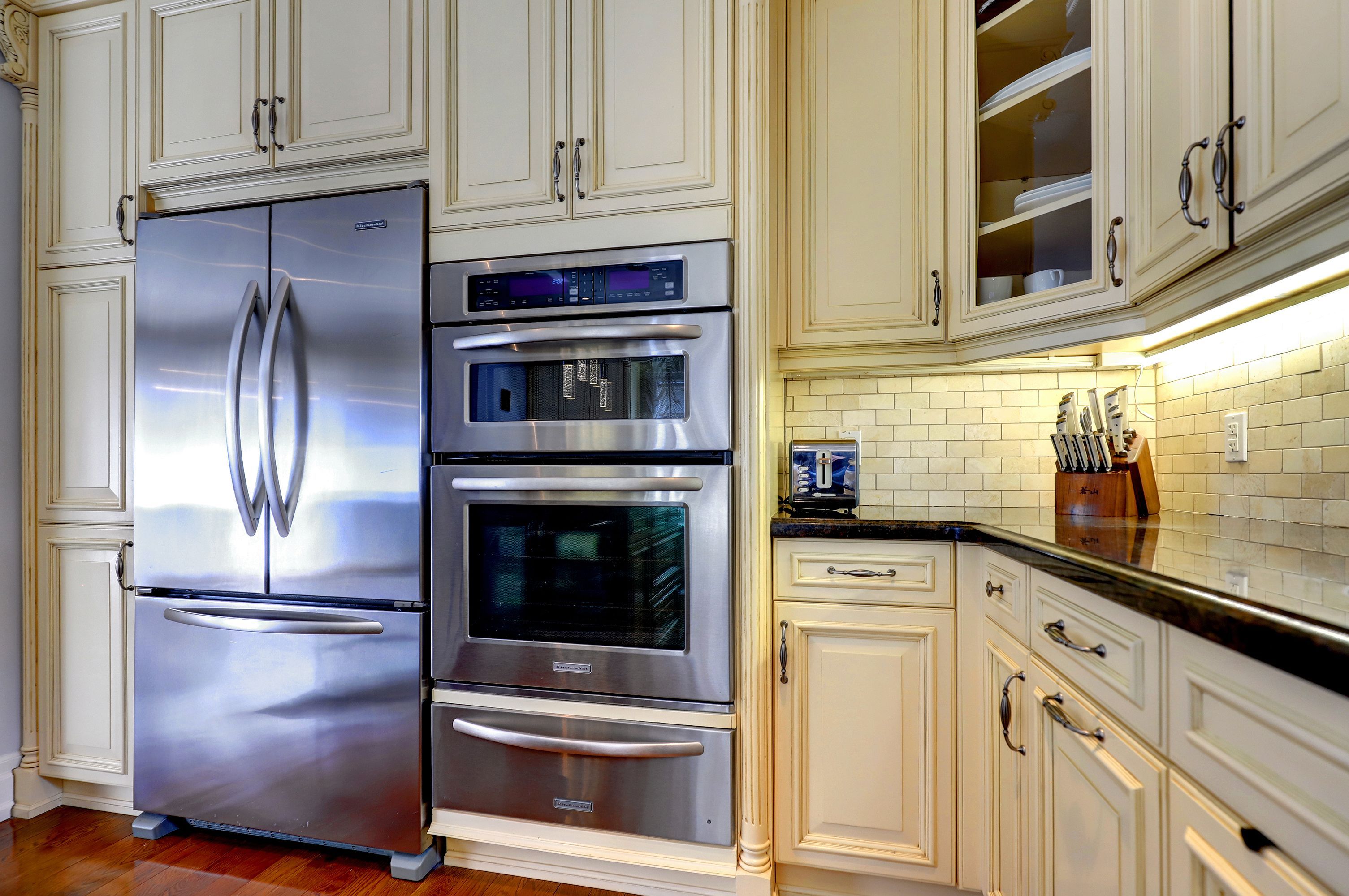 • Chef-inspired kitchen featuring stainless steel appliances, large island, and bay window.