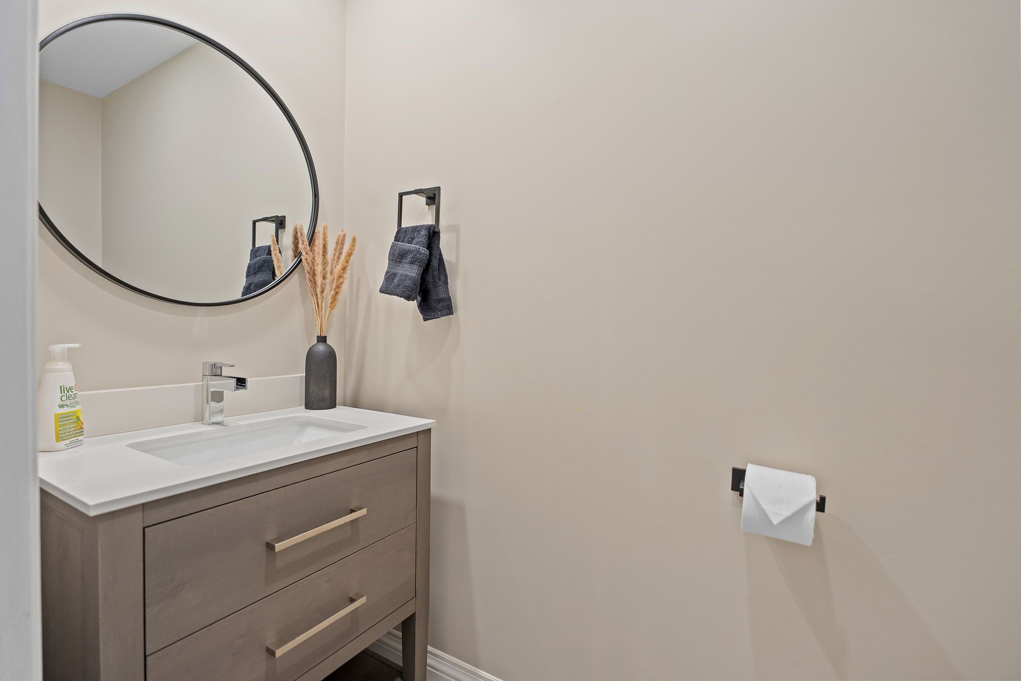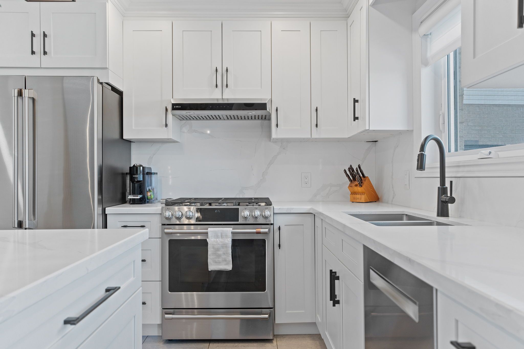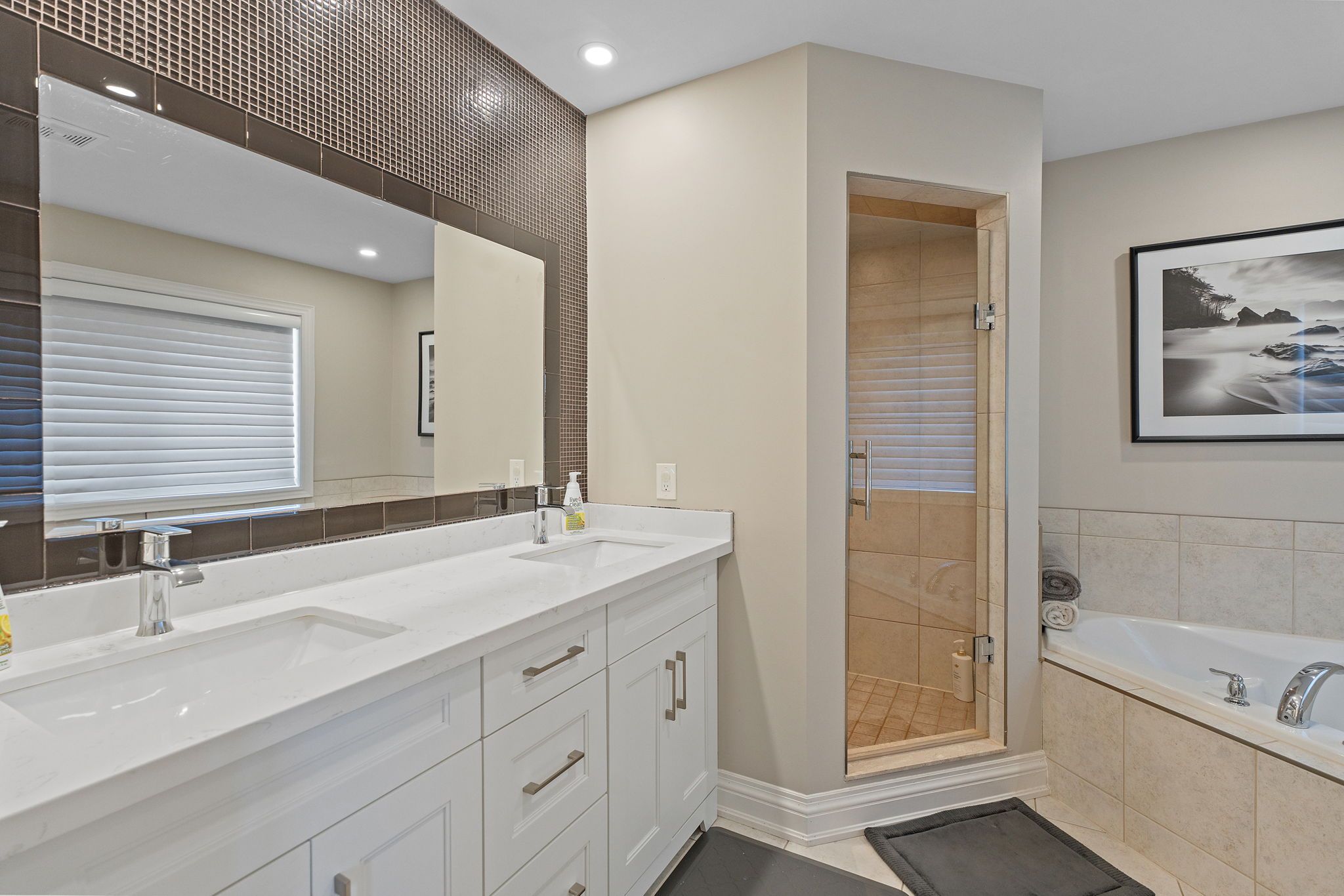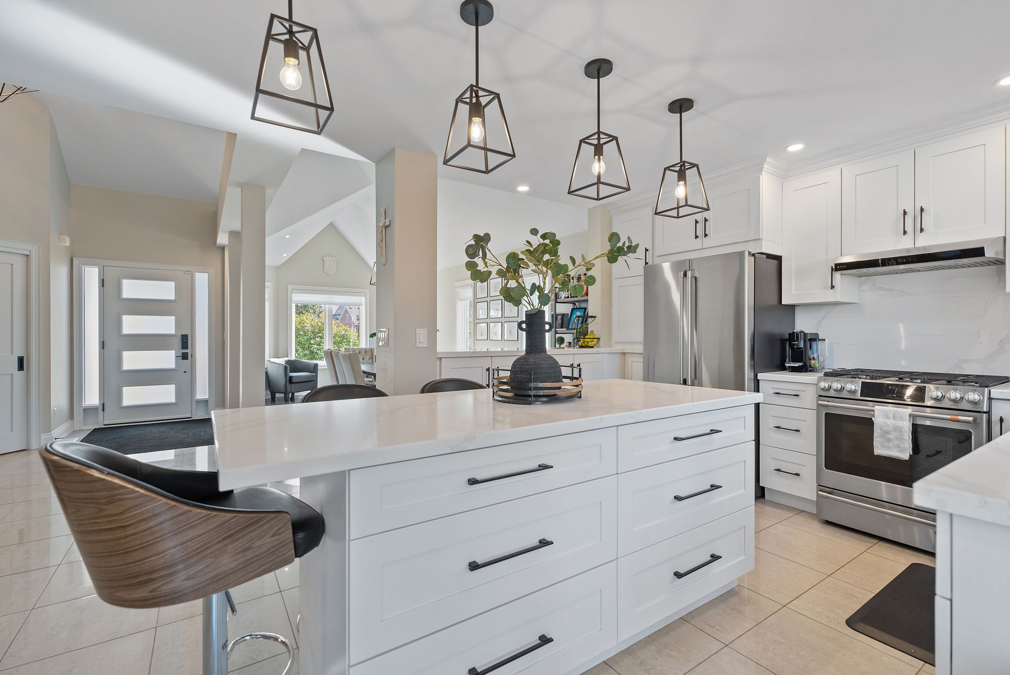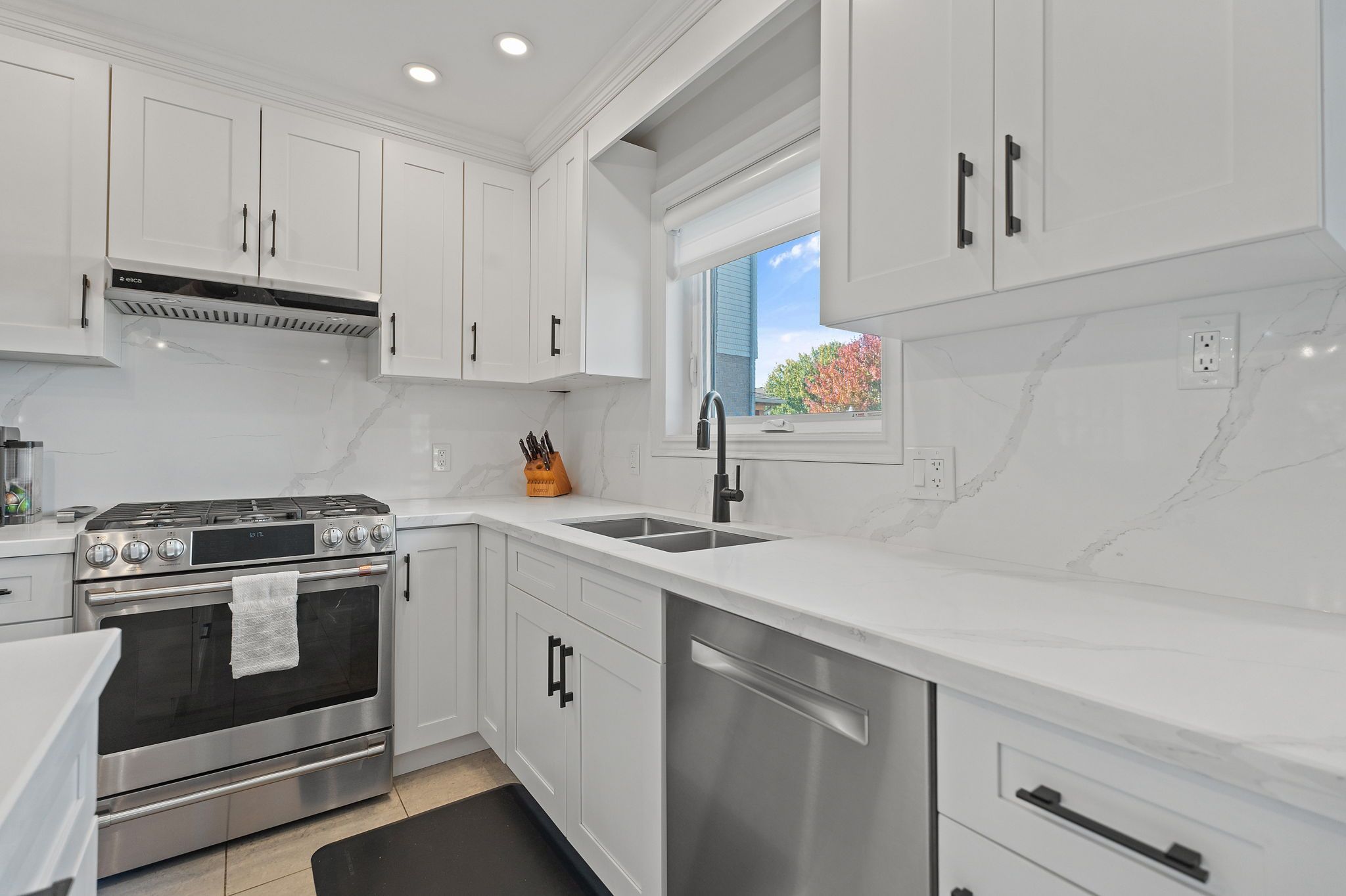 • Updated kitchen with quartz countertops and modern cabinetry.