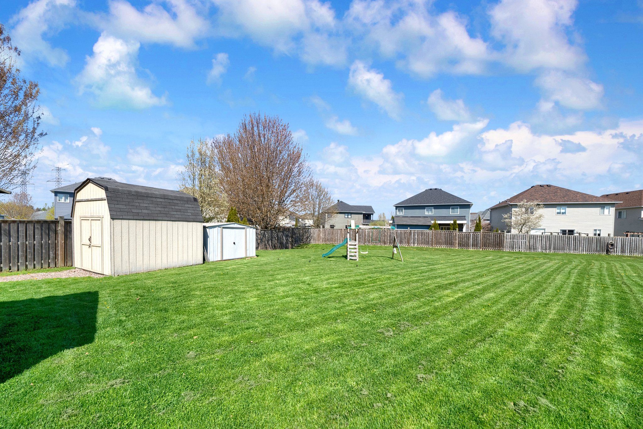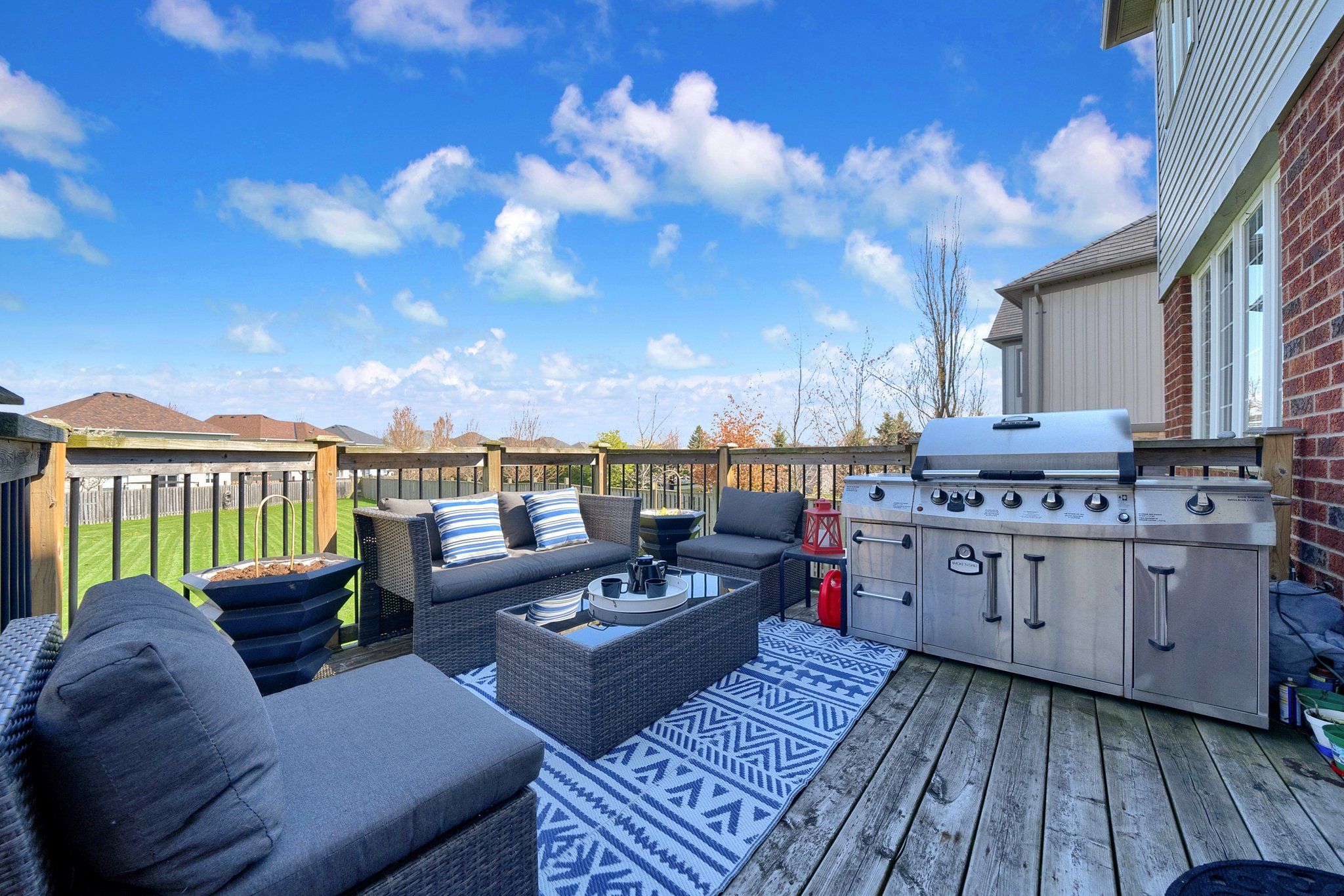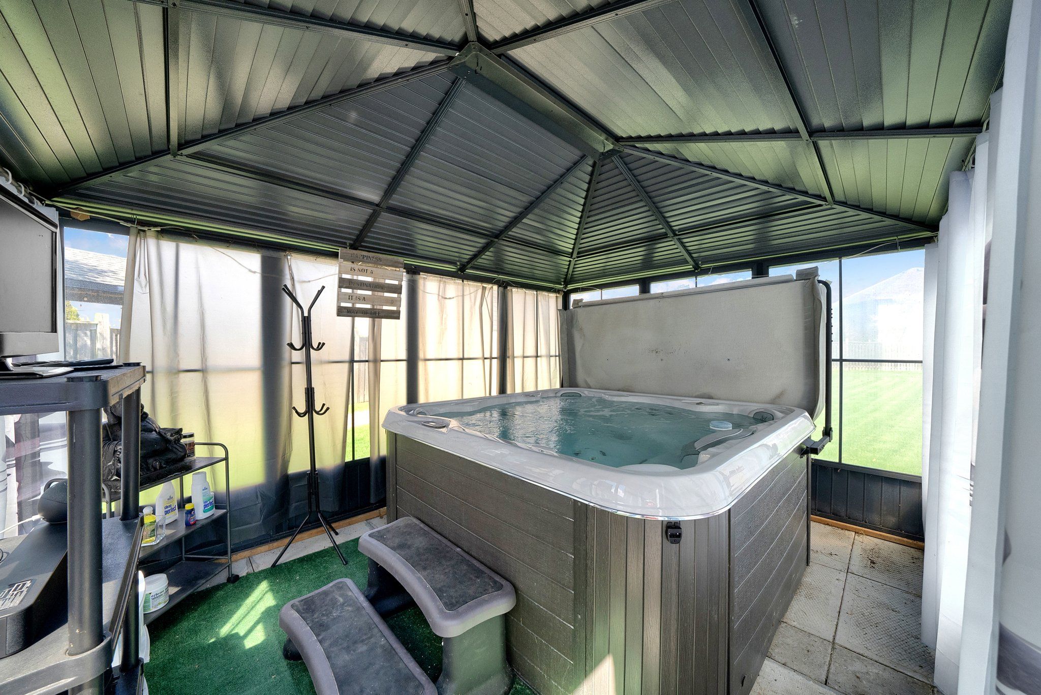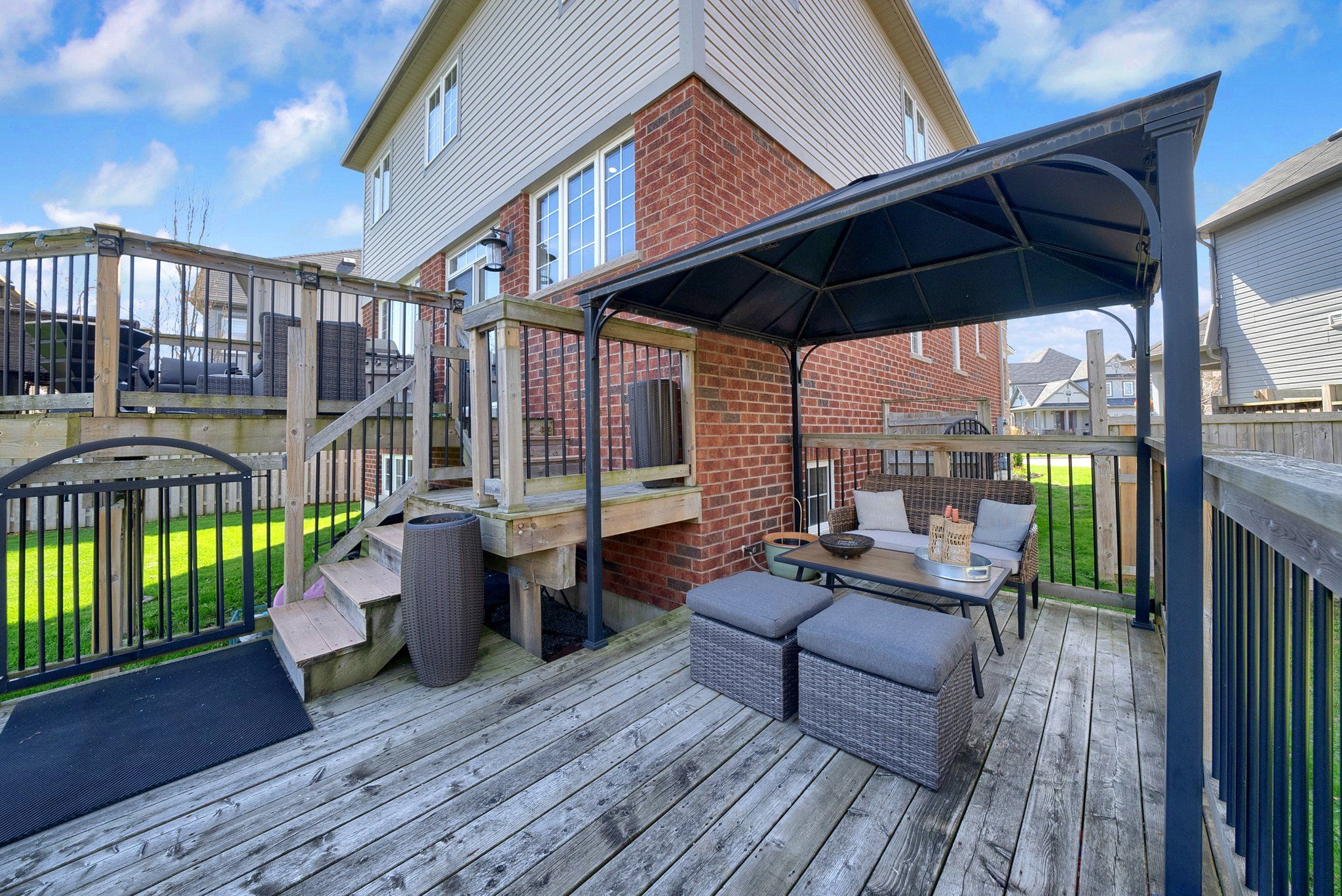 • Fully fenced yard with tiered decks, gazebo, and private hot tub area.