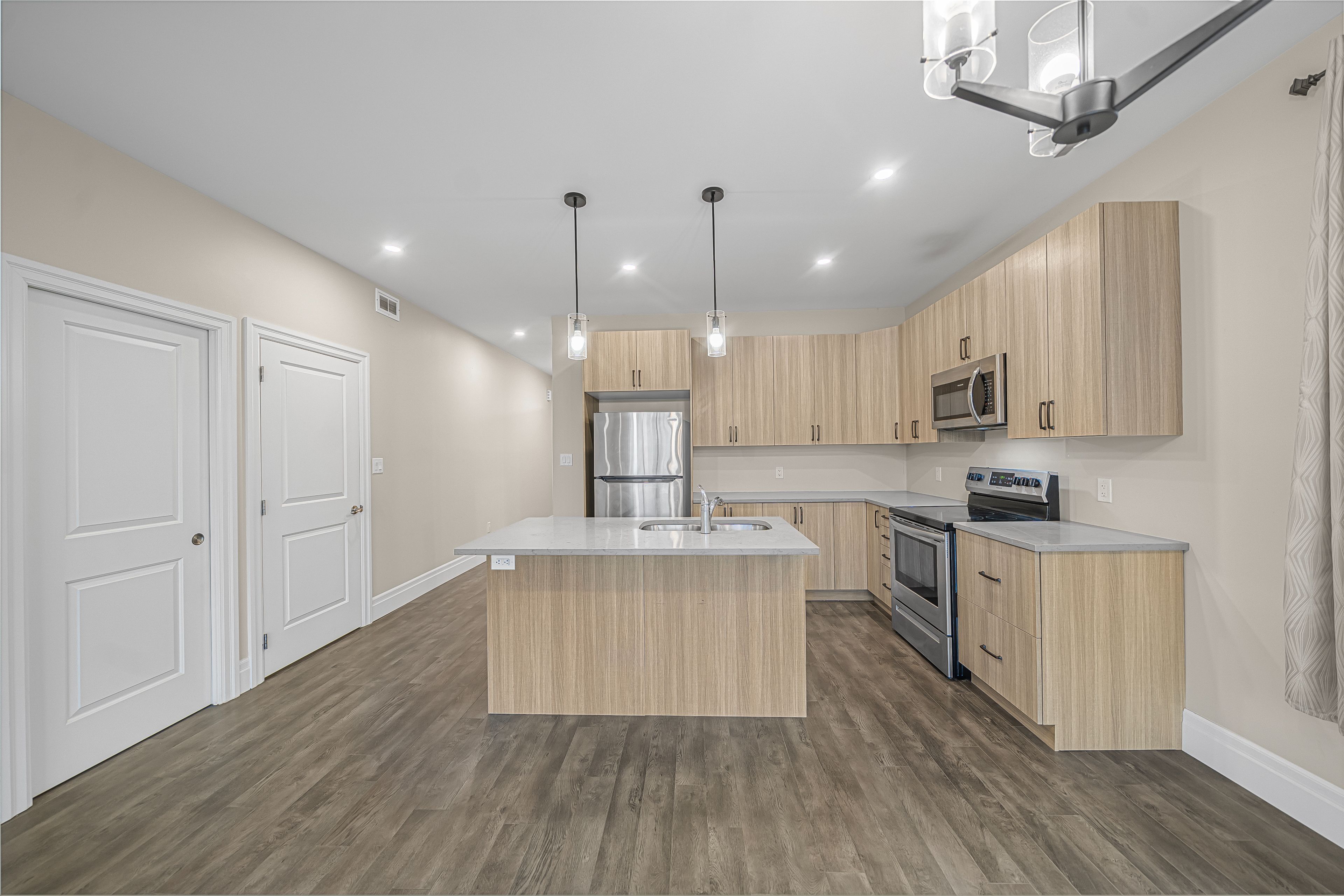 • Gourmet kitchen features quartz countertops and stainless steel appliances.