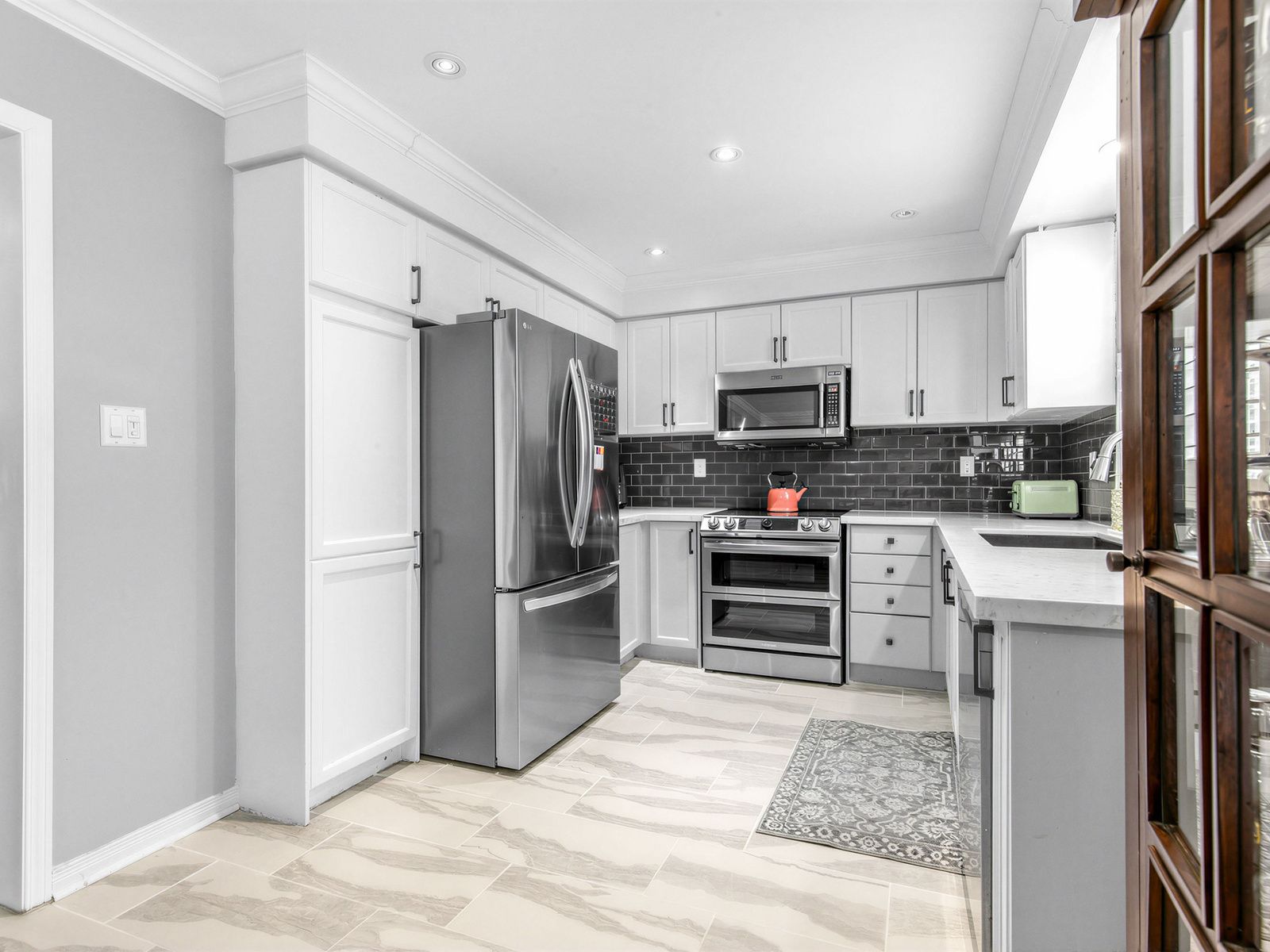 • Modern kitchen with quartz countertops and stainless steel appliances.
