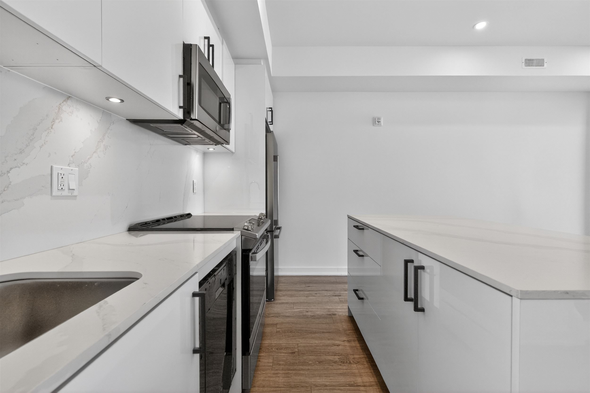 • Modern kitchen featuring stainless steel appliances and breakfast bar.