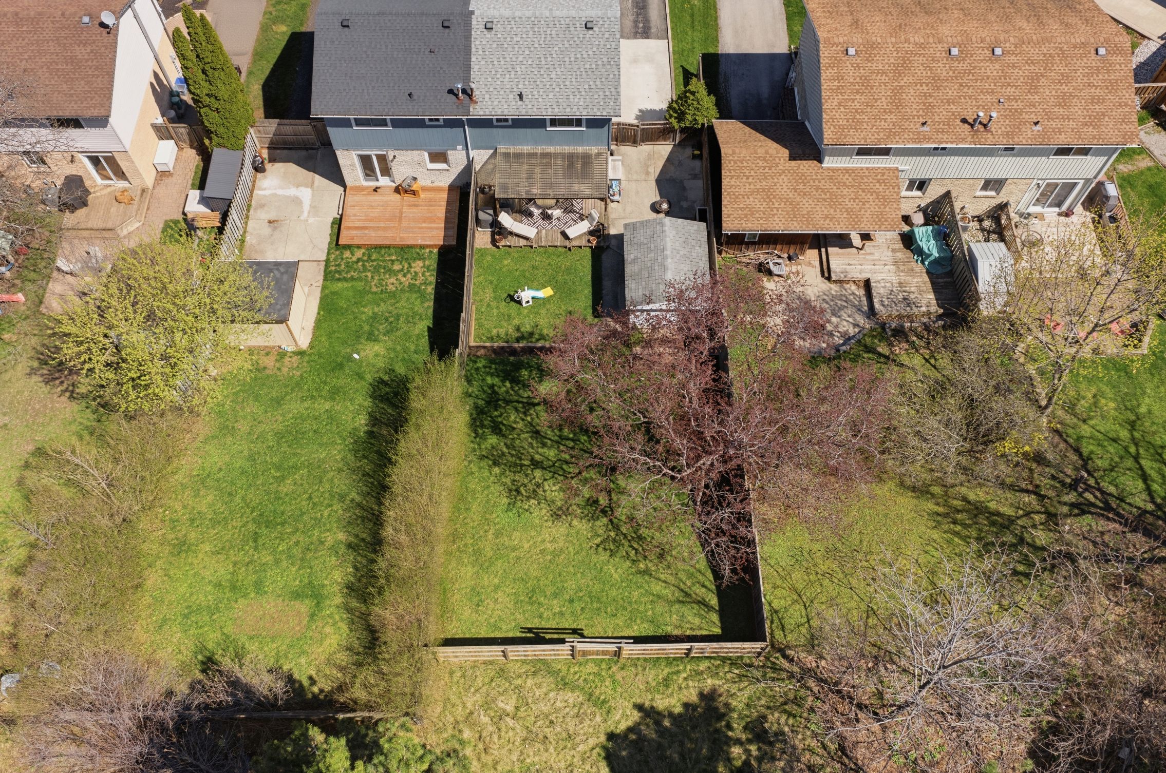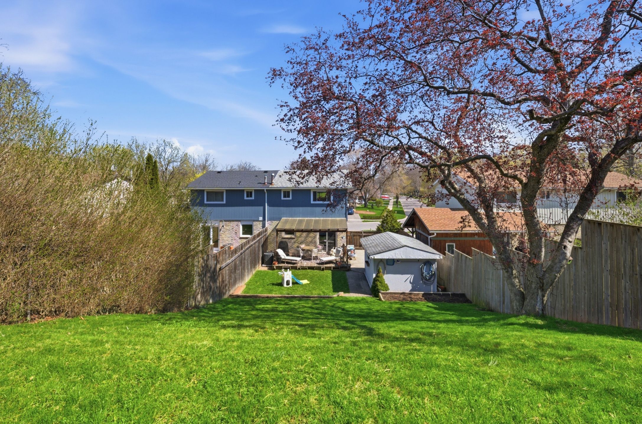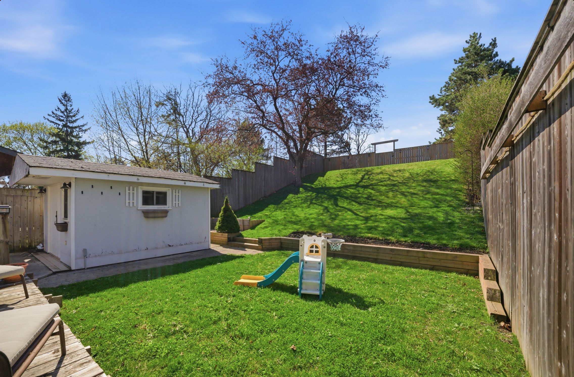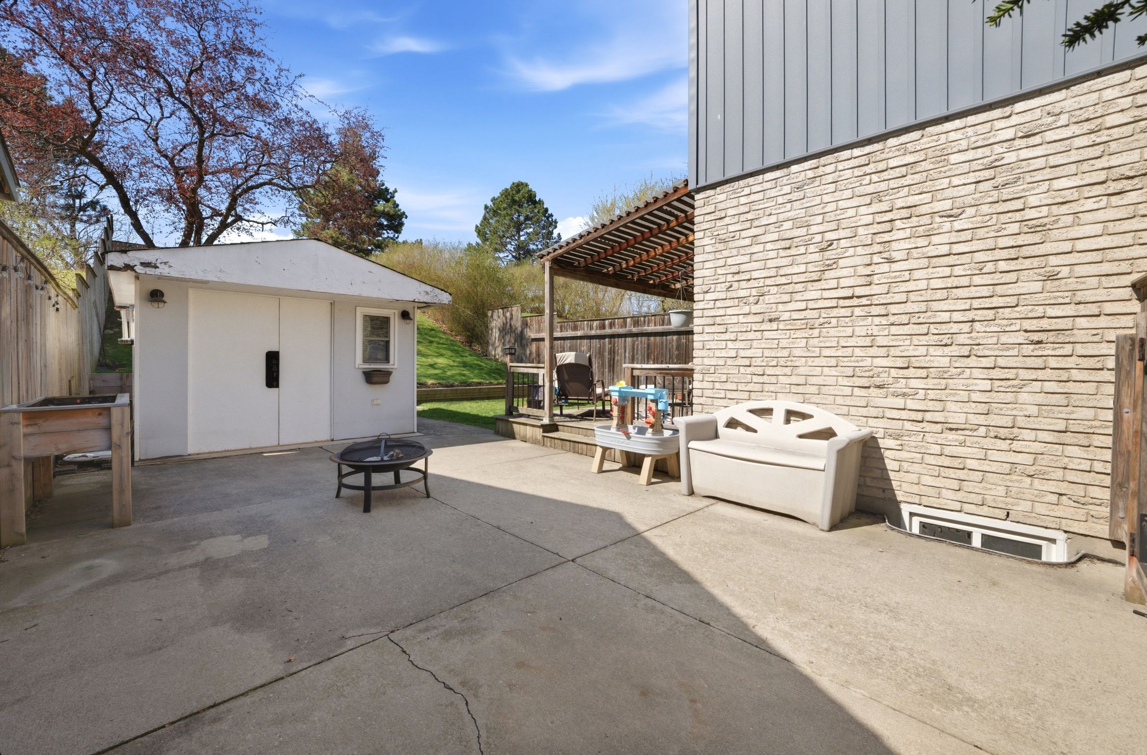 • Fully fenced backyard with seating area, garden beds, and electric storage shed.