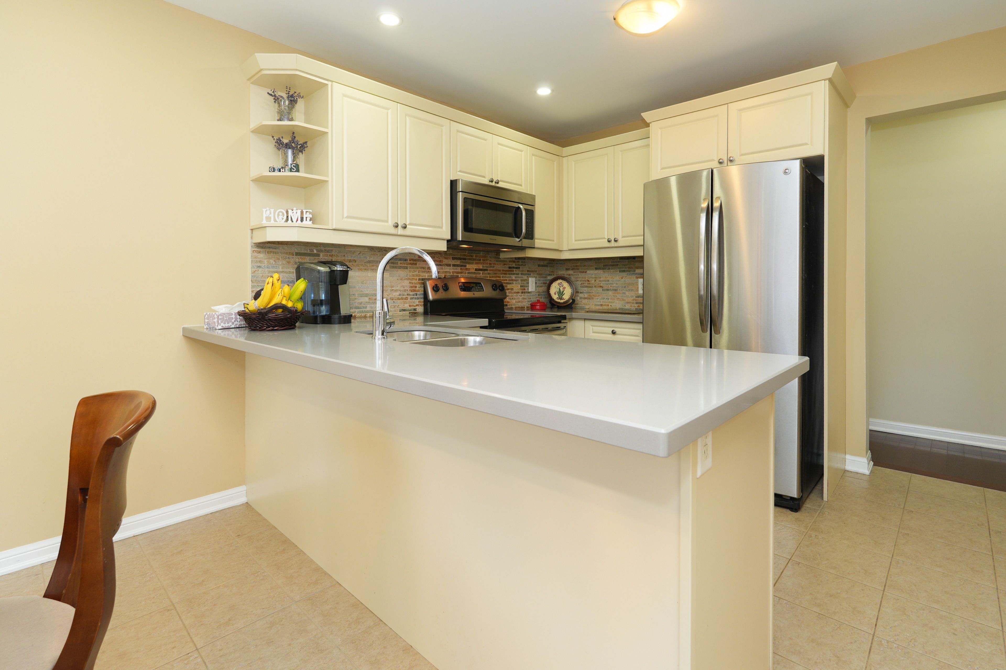 • Modern kitchen featuring quartz countertops and stainless steel appliances.