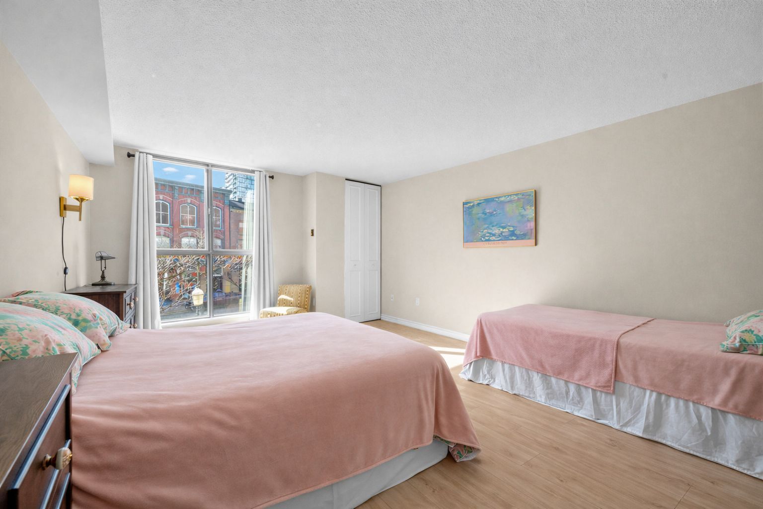 Market square, a boutique condominium in the heart of the st lawrence market district. Bright, beautifully proportioned and thoughtfully laid out, this inviting suite of approximately 1118 square feet offers an exceptional blend of space, comfort, and functionality. A welcoming foyer opens into a defined dining area, seamlessly connecting to an expansive living room filled with natural light from a full wall of windows and showcasing amazing views of st lawrence market and the flatiron building. The well appointed kitchen offers generous cabinetry and counter space, creating an efficient and practical workspace with a clean, timeless aesthetic. The adjacent dining area provides flexibility for hosting or quiet meals at home. The oversized primary bedroom offers a peaceful retreat with a large walk in closet, while the spacious, fully updated bath features a sleek glass enclosed shower and modern finishes. A separate laundry area adds everyday convenience. Light toned flooring, soft neutral finishes, and a calm, cohesive palette enhance the sense of openness throughout. The layout is exceptionally functional, with a clear separation between living and private areas, offering both comfort and privacy. Unbeatable location with a walk score of 99 and transit score of 100. Easy access to the second floor terrace with barbecues. Outstanding building amenities include rooftop gardens, saltwater pool, party room, and 24 hour concierge. Steps to theatre, shops, restaurants, ttc, lcbo, berczy park, eaton centre, the financial district, and the lake.