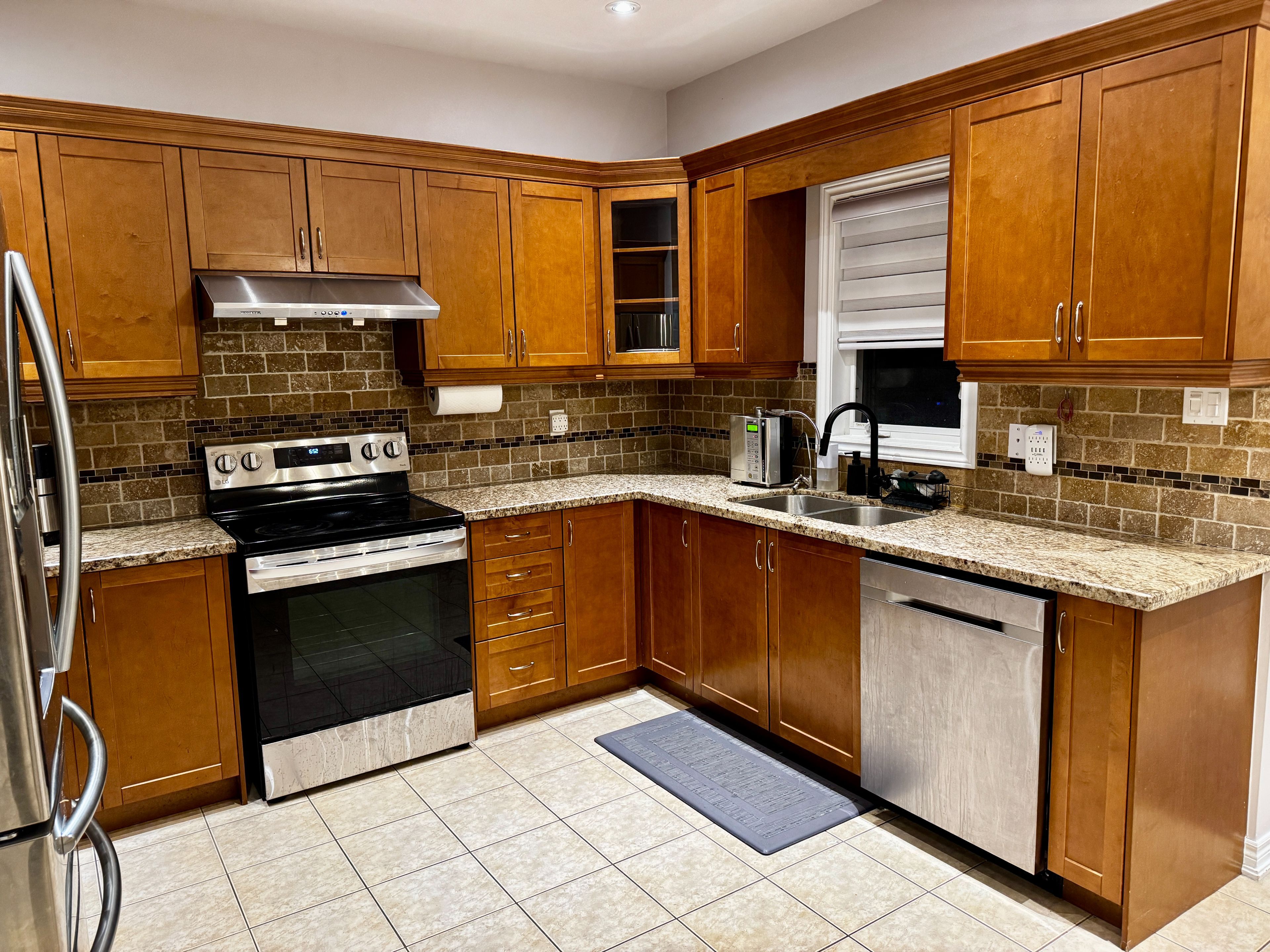• Modern kitchen with granite countertops and convenient breakfast area.