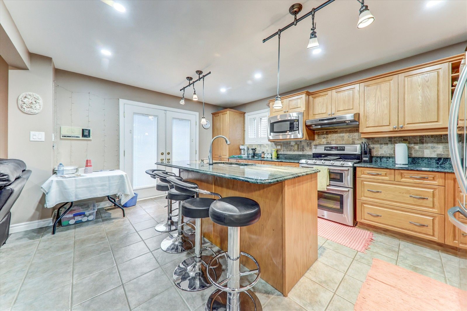 • Custom kitchen with granite counters, stainless steel appliances, and oak cabinetry.