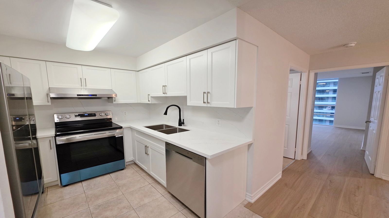 Stunning 2-bedroom unit with 1 parking + 1 locker, one of the best layouts in the building! Bright and spacious split-bedroom design, perfect for comfortable living. Fully renovated: brand-new kitchen with new appliances; new engineered hardwood floors; fresh paint; new bathroom vanity. Convenient location - steps to the subway, grocery stores, and top-rated restaurants. Great building amenities - indoor pool, sauna, exercise room, 24 hrs concierge, and ample visitor parking.