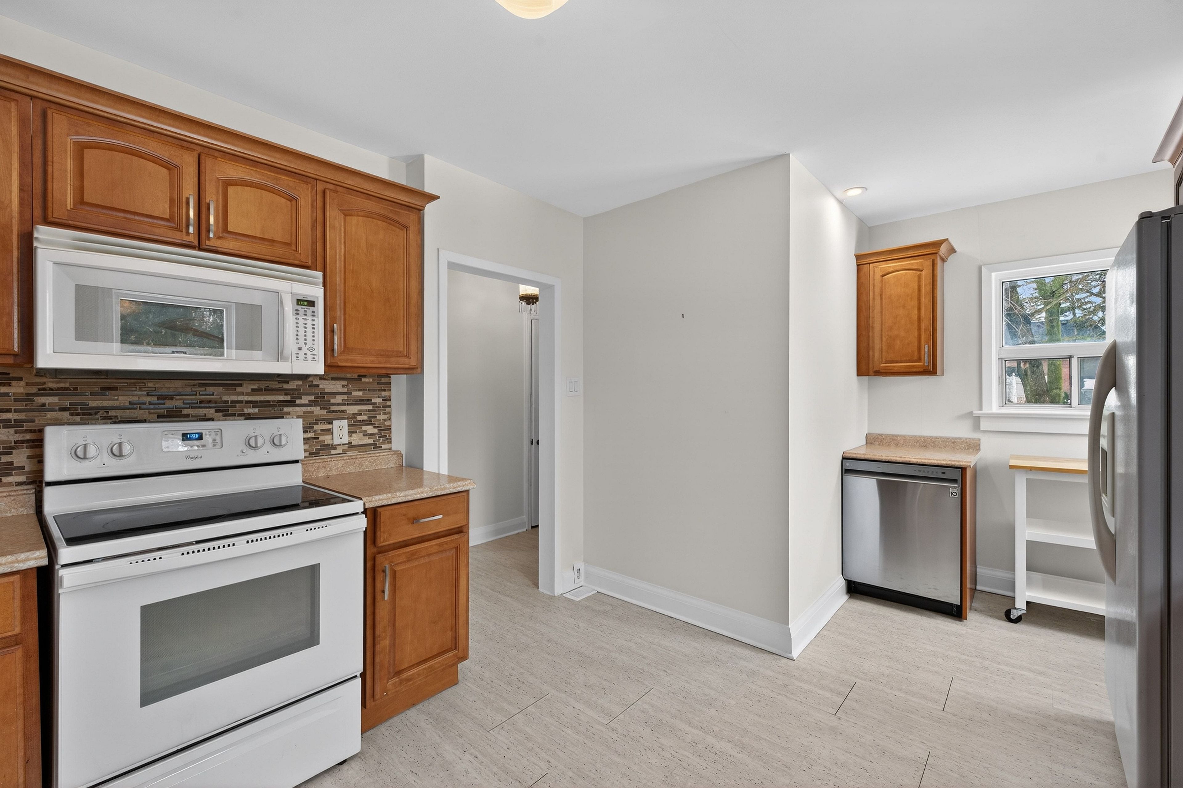 • Open-concept kitchen features ample cabinetry and updated bathrooms.