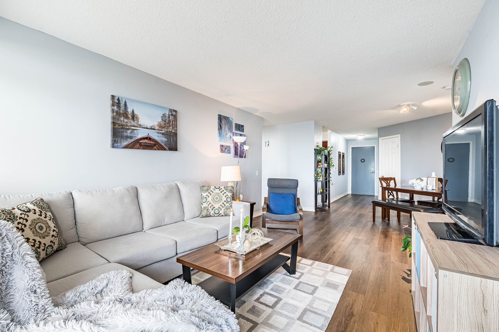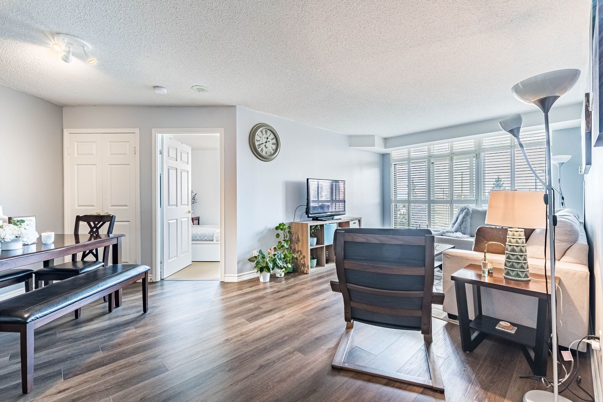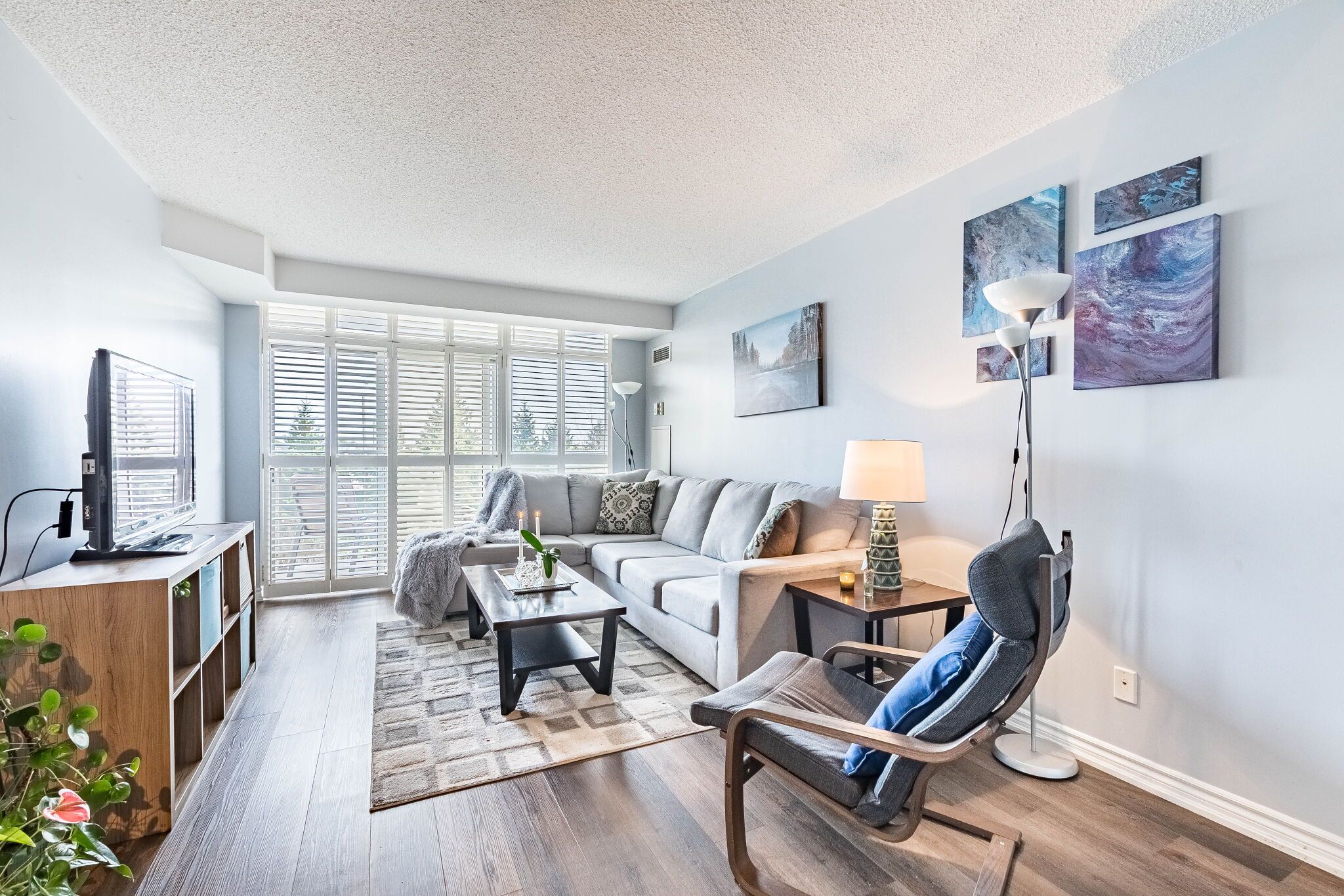 • Bright open-concept living area with balcony overlooking landscaped gardens.