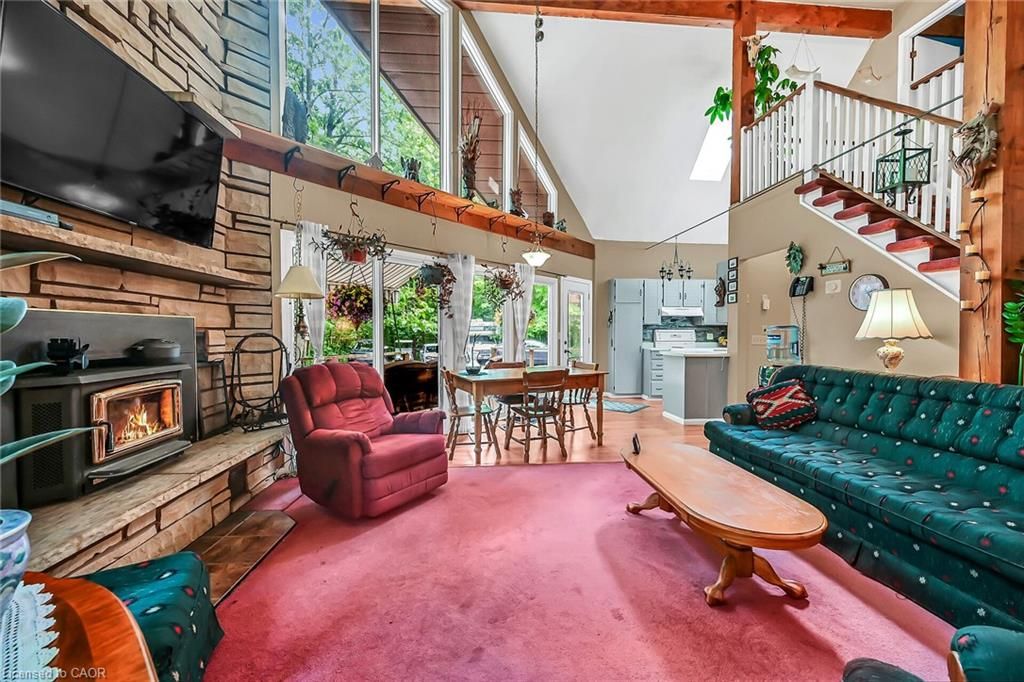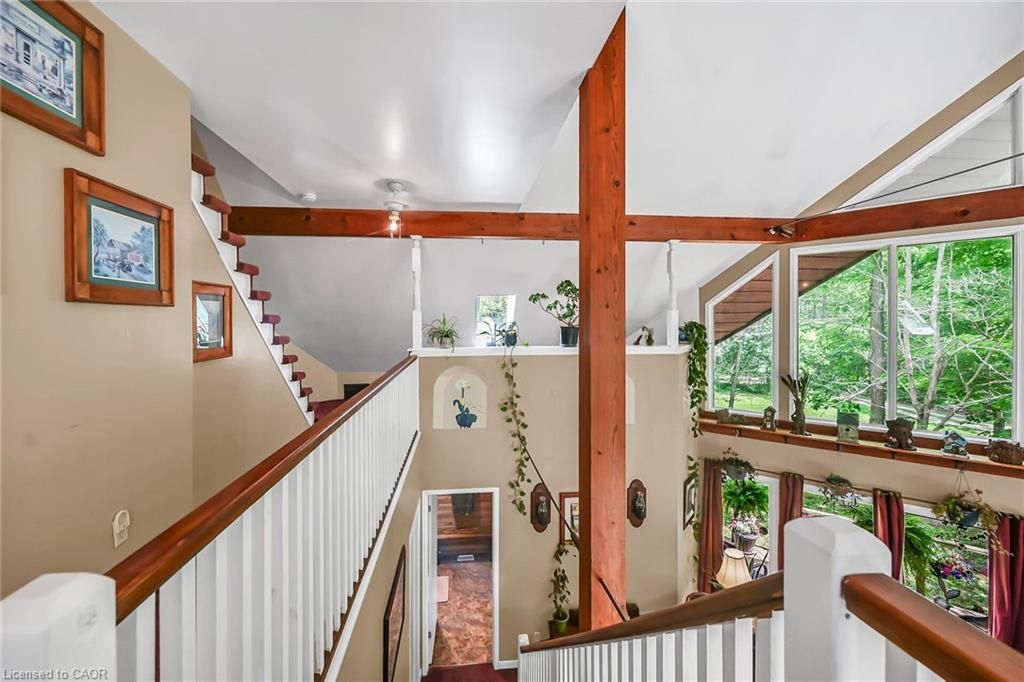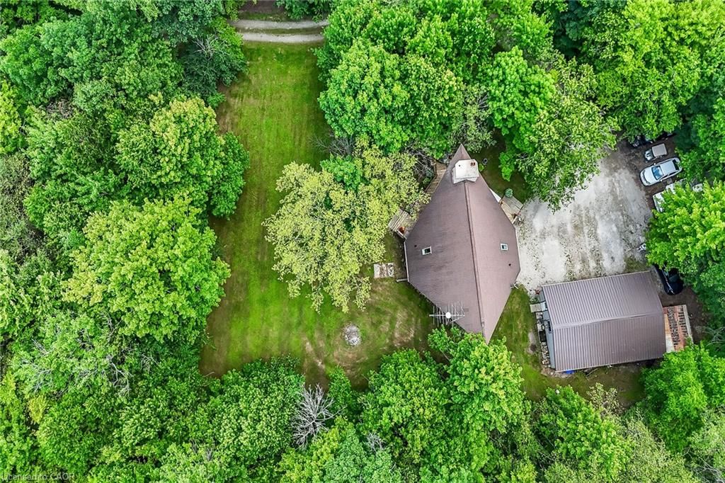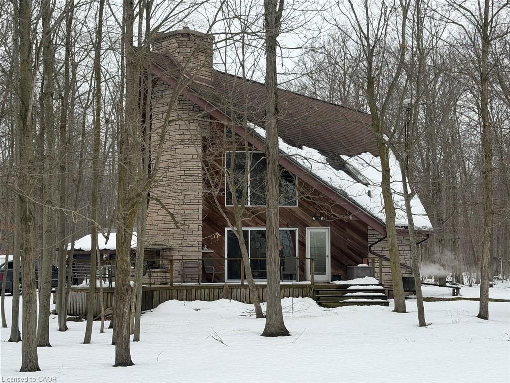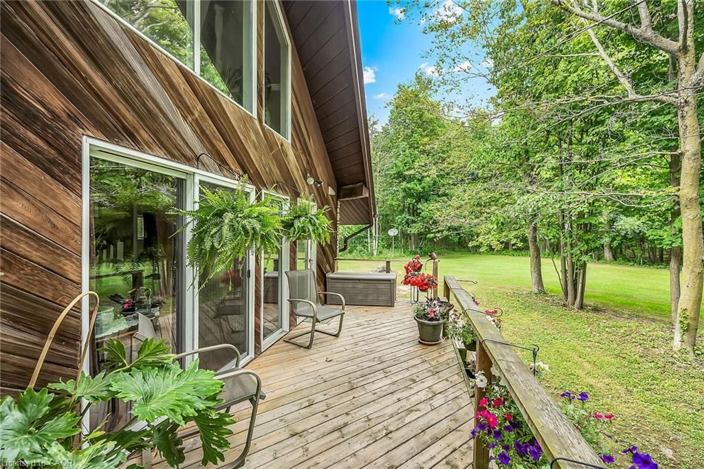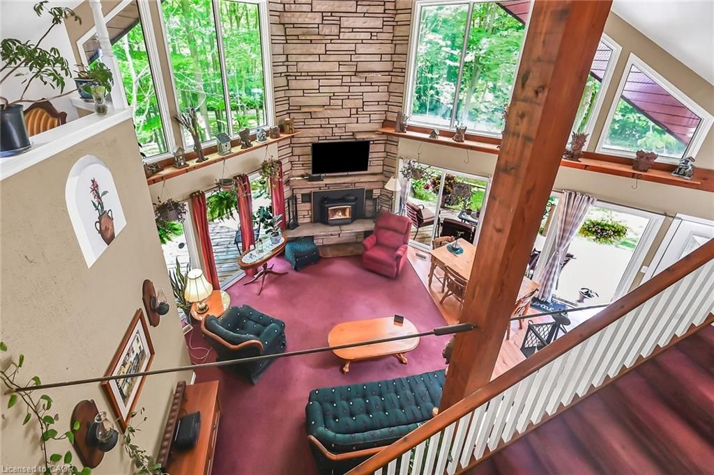 This picturesque property is a true retreat from city life. Experience natural privacy as you enter the winding driveway leading to a secluded 1-acre property that is frequented by deer, wild turkeys, rabbits, squirrels and various bird species. The sturdy chalet construction, with its harmonious blend of natural wood, angel-stone and expansive windows, invites the outdoors inside, creating an atmosphere that is both elegant and inviting. For hobbyists and mechanics, the property features a 24'x36' heated 3-car garage/workshop and a 10'x15' storage shed. The open concept main floor is highlighted by a soaring cathedral ceiling, a kitchen w/skylight and ample cabinetry, a dining area with garden door access to a wrap-around deck with awning, a sun-filled great rm w/sliding patio doors, and a 2-sided wood fireplace for both indoor and outdoor enjoyment. There are 2 spacious main floor bedrooms and a 4pc bath with cedar accent wall and an exterior door for bathroom access from the deck. The 2nd floor contains a primary 3rd bedroom, plus a home office area. The upper floor includes a potential 4th bedrm. The partially finished basement houses the laundry/utility rm and provides ample storage space. Notable amenities include a propane furnace, c/air, 15,000-gal cistern, septic system, and 200-amp hydro. Situated on a paved year- round road in a tranquil setting surrounded by a serene forest, vibrant perennial gardens, landscaped grounds, and a large driveway ideal for parking multiple vehicles and a boat/rv. This property appeals to outdoor enthusiasts and offers a cottage-like ambiance. You will be delighted by the 4-season beauty this property offers. Conveniently located near cayuga & dunnville, 30-60 min commutes to hamilton and niagara. With all the benefits of rural living and the convenience of nearby towns, 35 little rd, cayuga, truly stands apart as a sanctuary where cherished memories are just waiting to be made.