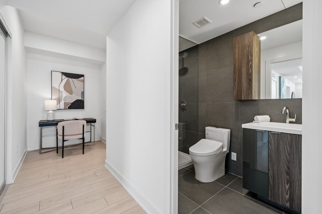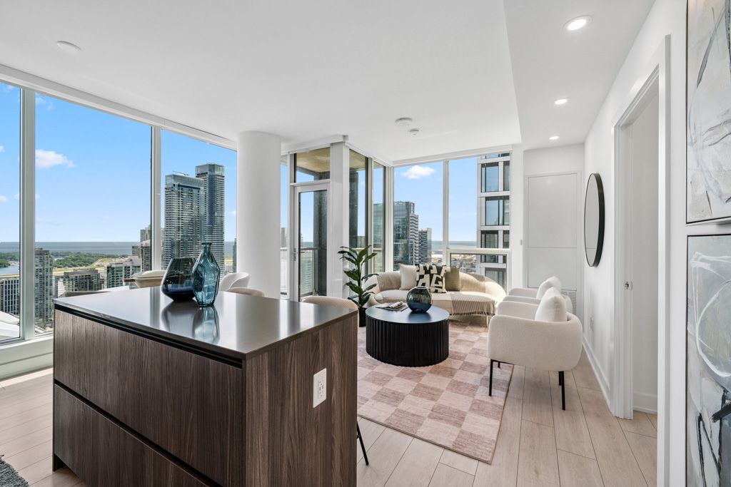 Welcome to the prestigious nobu residences. A brand new, never-lived-in luxury residence, this impressive 862 sq. Ft. Southwest corner unit features 2 bedrooms plus a study and 2 bathrooms, offering an unparalleled living experience. Nestled in the heart of toronto's vibrant entertainment district, this home is surrounded by premium amenities, including the acclaimed nobu restaurant. With a transit score of 100/100 and a walk score of 99/100, you'll find everything you need within walking distance from the subway and path to restaurants, shops, rogers centre, cn tower, and other major attractions. The unit boasts soaring 9-foot ceilings and laminate flooring throughout, creating a spacious and bright ambiance enhanced by floor-to-ceiling windows. The open-concept design allows for a seamless flow between living spaces. The gourmet kitchen features integrated miele appliances such as a cooktop, built-in oven, fridge, dishwasher, and washer/dryer, all complemented by stylish quartz countertops and a matching backsplash. The primary bedroom includes a luxurious 3-piece ensuite and upgraded closet organizers, while the modern bathrooms are thoughtfully designed for both elegance and practicality. Residents are treated to an array of five-star amenities, including a state-of-the-art fitness center, hot tub, yoga area, private dining room, screening room, bbq & prep deck, sauna & steam room, massage room, games room, and the exclusive nobu villa on the terrace. The unit also features a keyless entry door for added convenience. Living at nobu residence means embracing luxury and sophistication, with everything you desire right at your doorstep. Don't miss the opportunity to own this exceptional property in one of toronto's most sought-after locations.