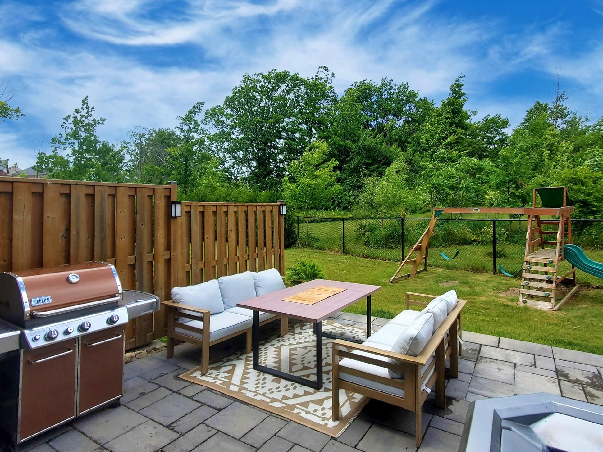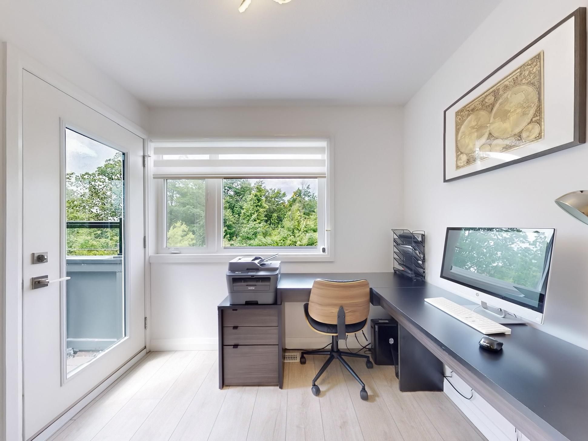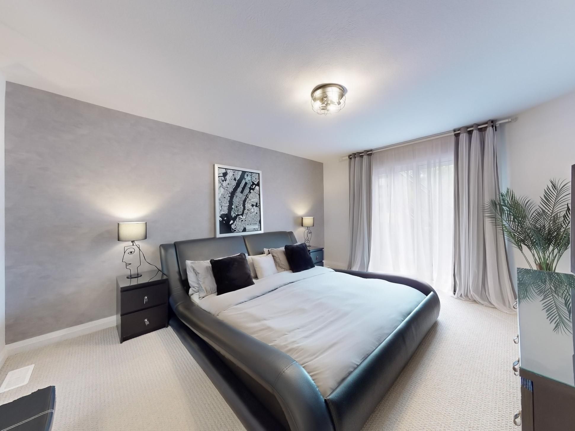 This exquisite executive townhome features 3 bedrooms and 4 bathrooms, combining modern luxury with functionality. The main floor offers an open-concept living area bathed in natural light. Elegant finishes throughout include a tv custom-built stone wall with an electric fireplace, 9-foot ceilings, pot lights, modern light fixtures, heavy duty vinyl flooring on all three levels, expansive wall-to-wall windows on main floor and a floating staircase that adds a dramatic touch. The gourmet kitchen is a chef's dream, boasting a large island with quartz countertops, newer high-end appliances, double oven/air fryer, and plenty of storage. A mudroom provides easy access from the garage. On the second floor, the spacious office can easily be converted into an additional bedroom if needed. The master suite is a true retreat, complete with a spa-like ensuite featuring a walk-in shower, a generous walk-in closet, and direct access to the 240 sq. Ft. Rooftop terrace, offering breathtaking views. A conveniently located second-floor laundry room completes this level. The fully finished basement adds even more living space, with a rec room, gym, full bathroom and a large storage room. The private backyard, overlooking a serene ravine, is perfect for relaxation and entertaining, with a large patio, a hot tub and green space. With countless upgrades throughout, this home is truly a must-see!