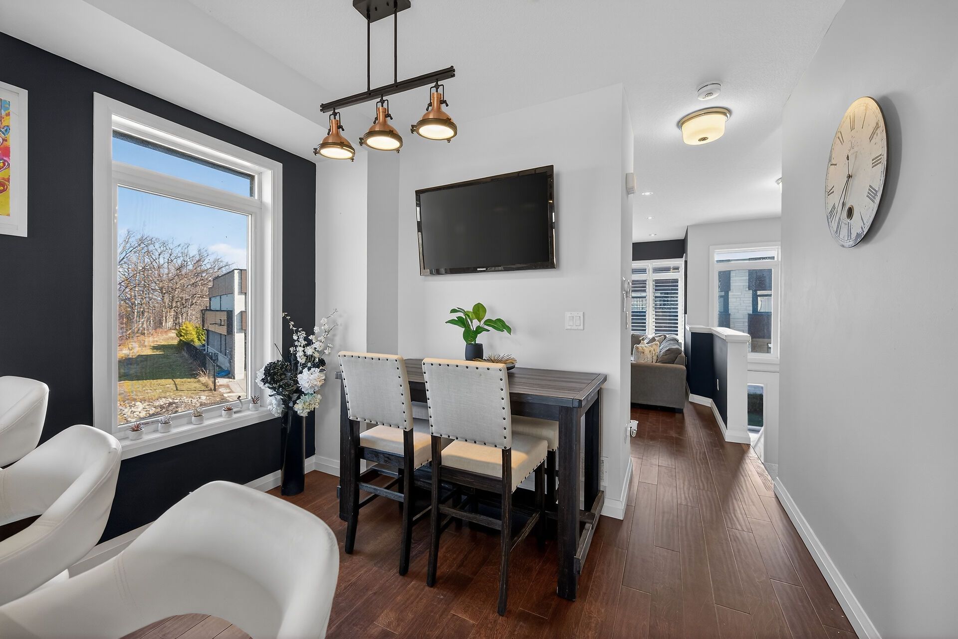 • Modern interior with designer eat-in kitchen and quartz countertops.