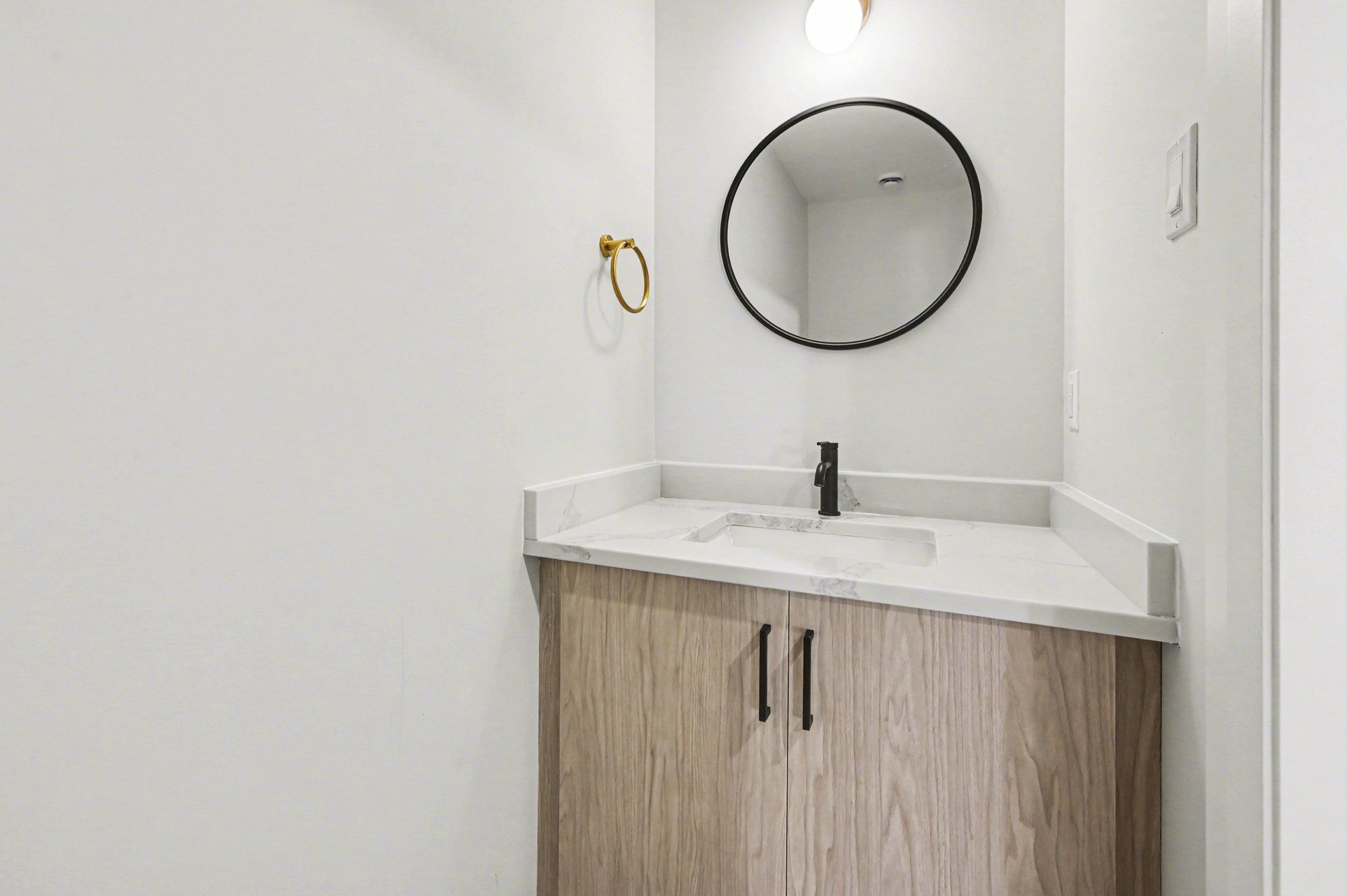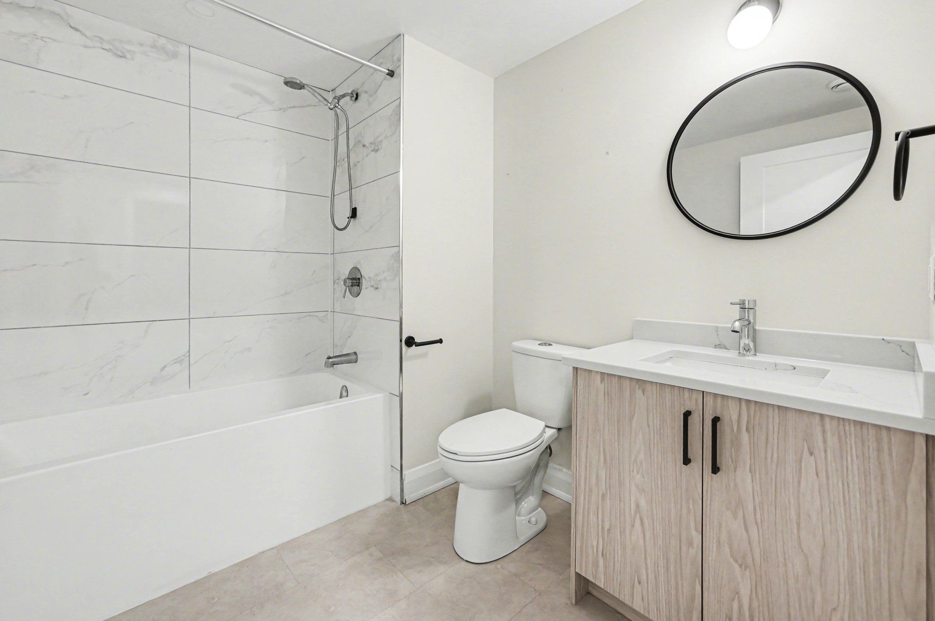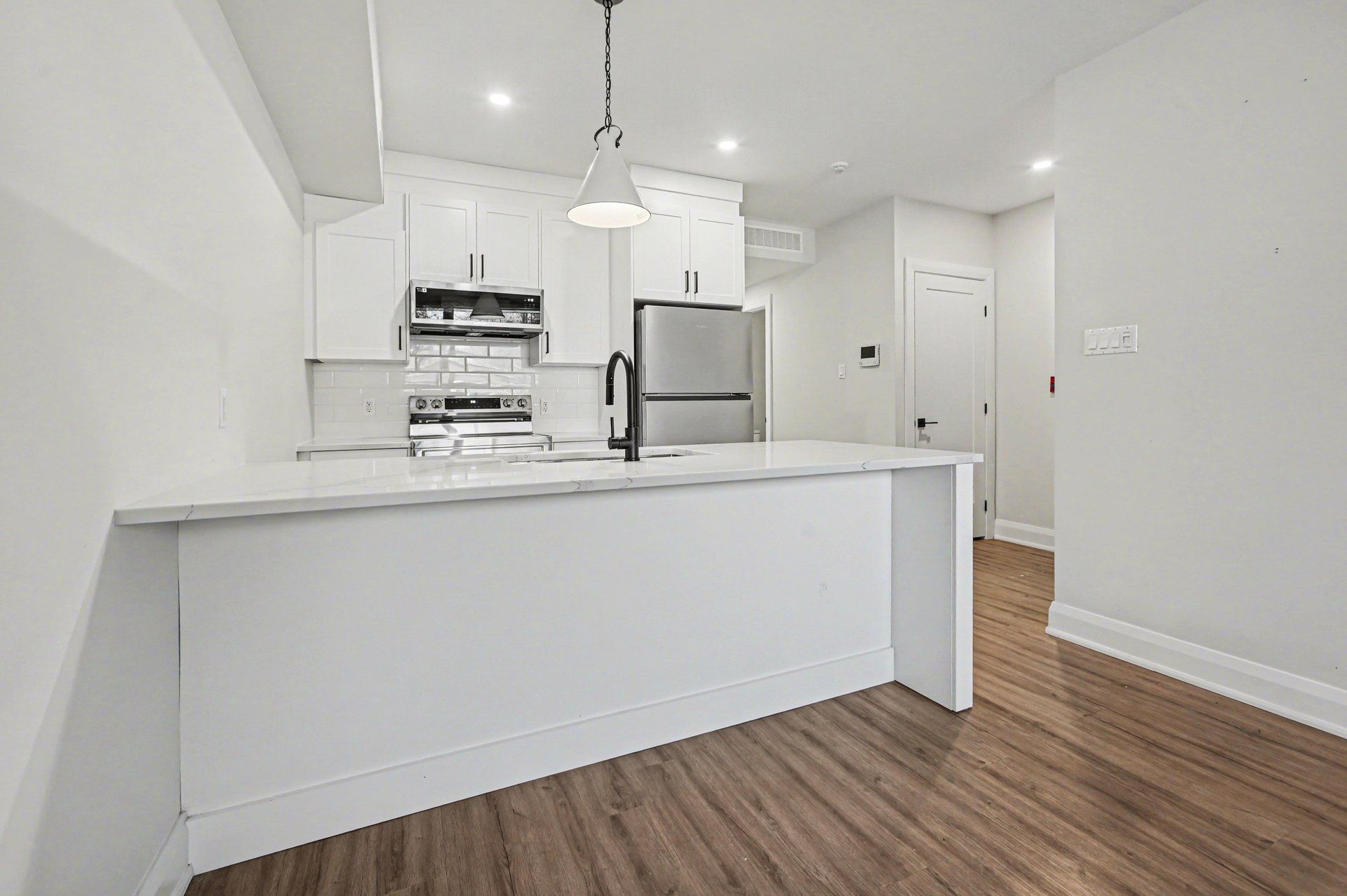 • Stylish kitchen with quartz countertops and stainless steel appliances.