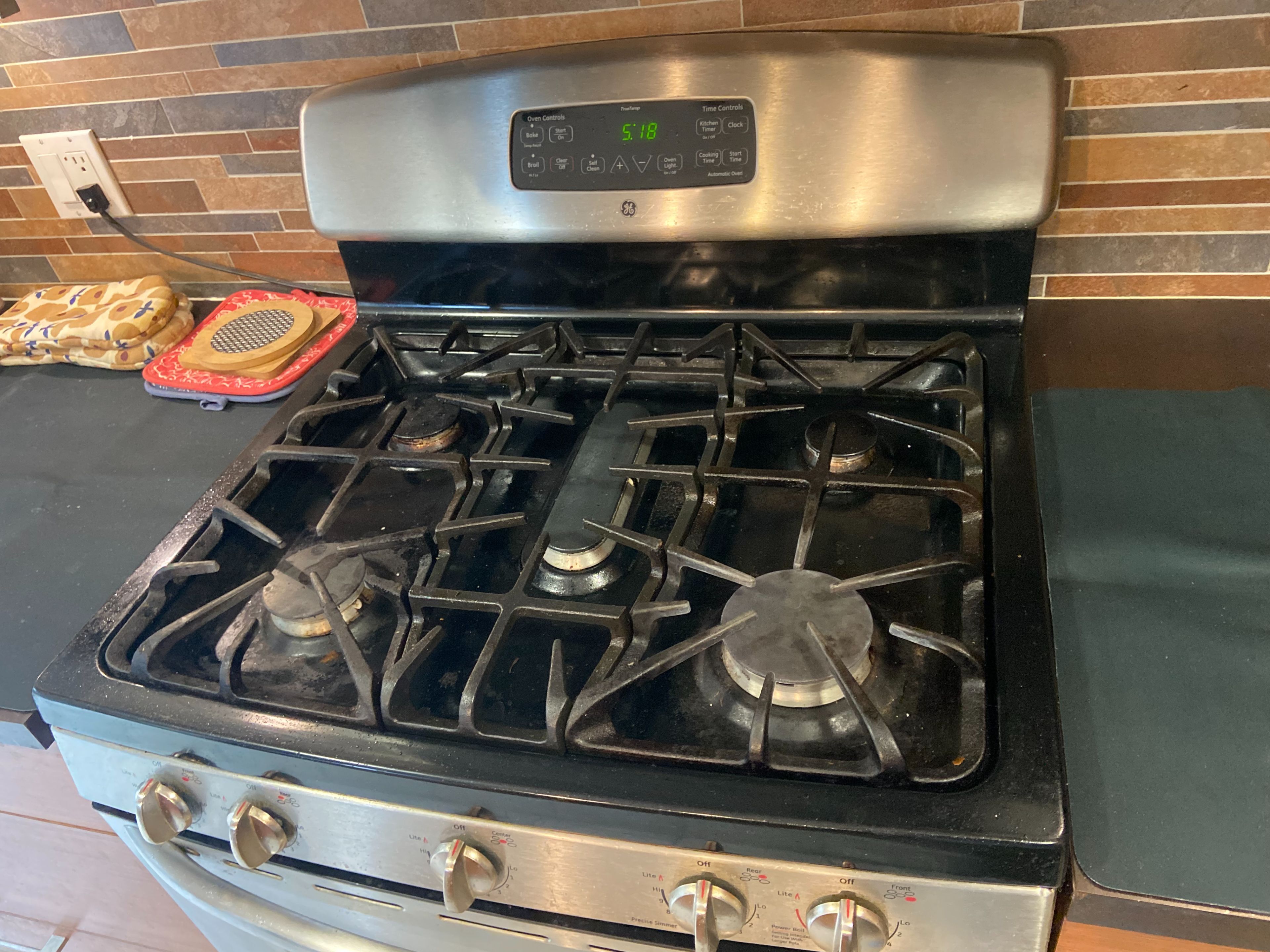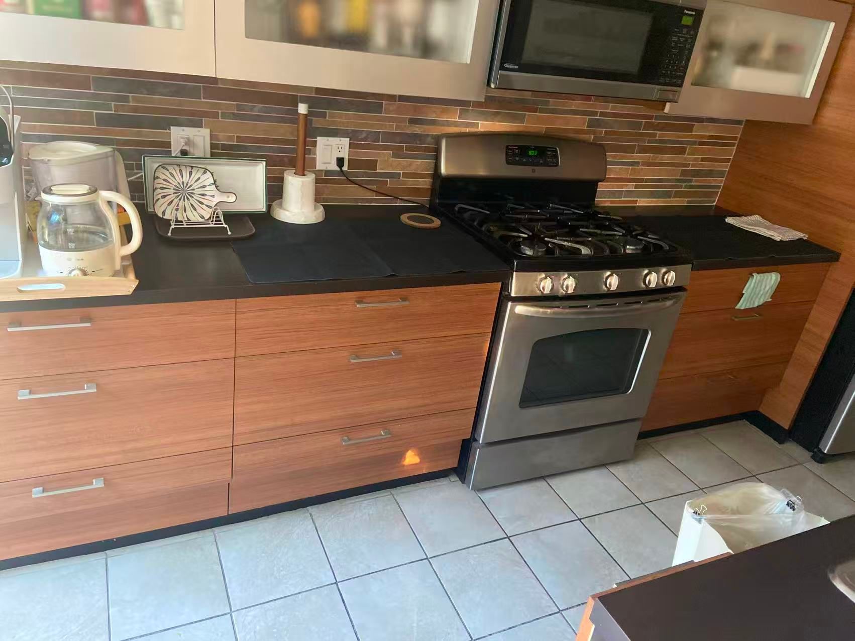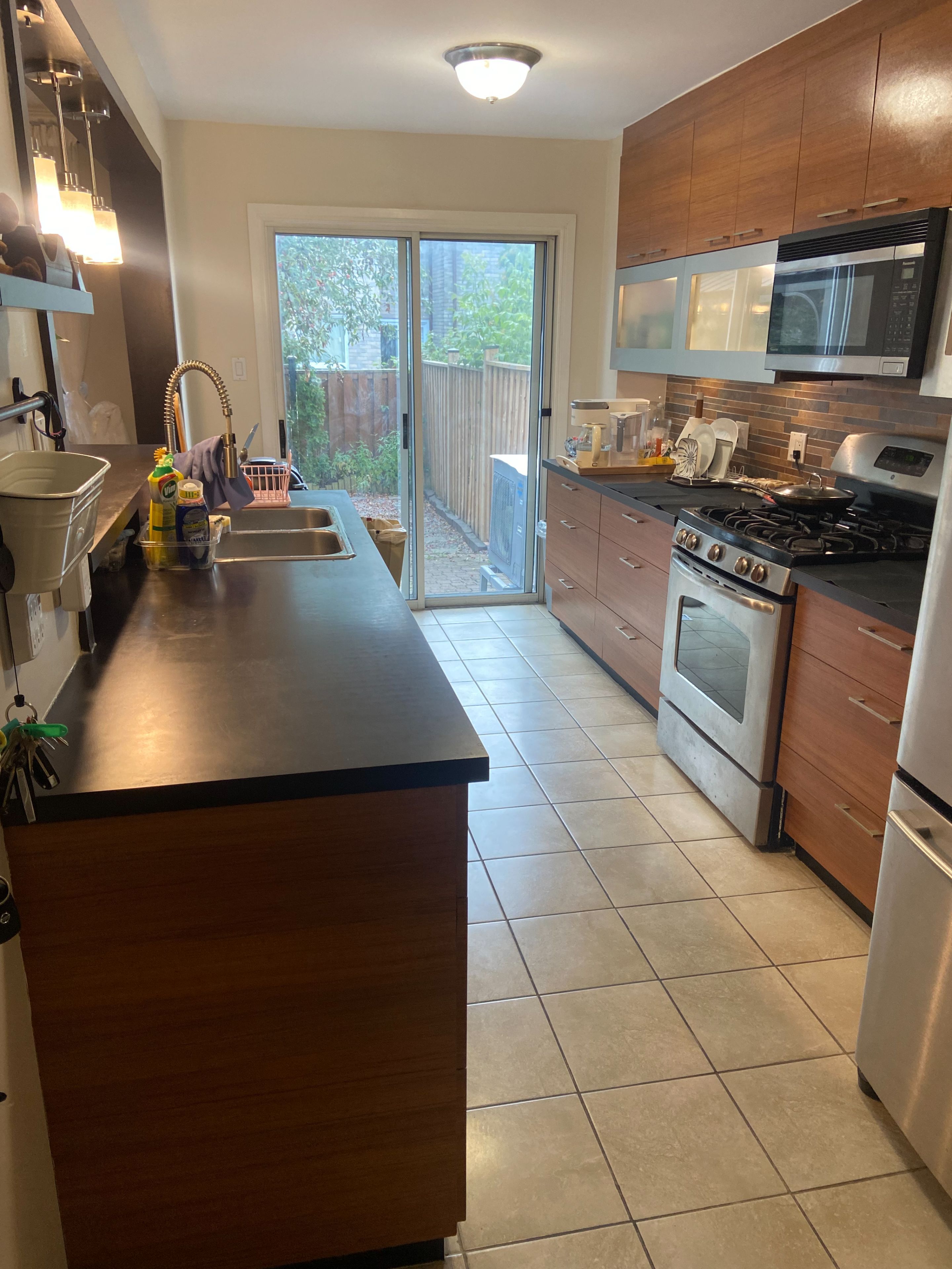 • Practical kitchen with stainless steel appliances and breakfast counter.