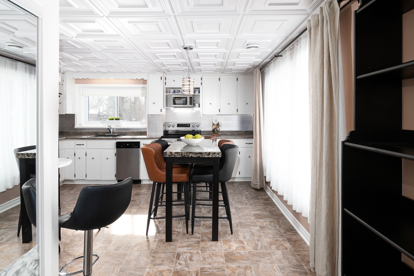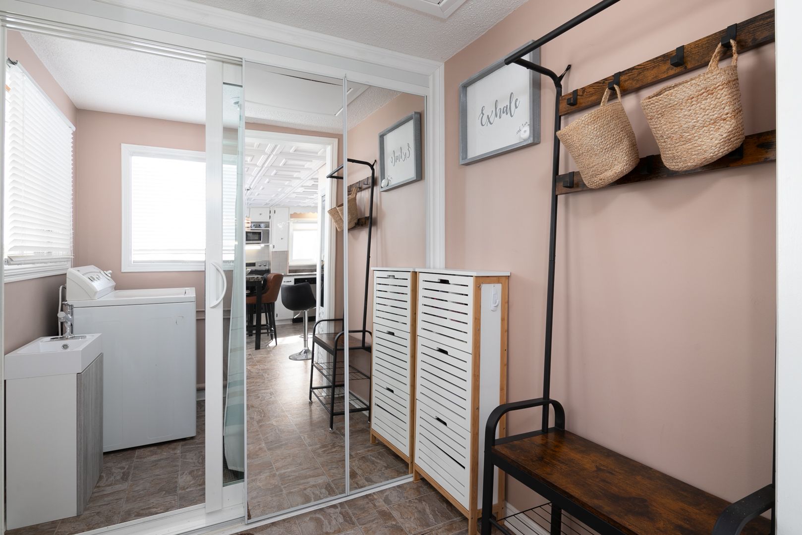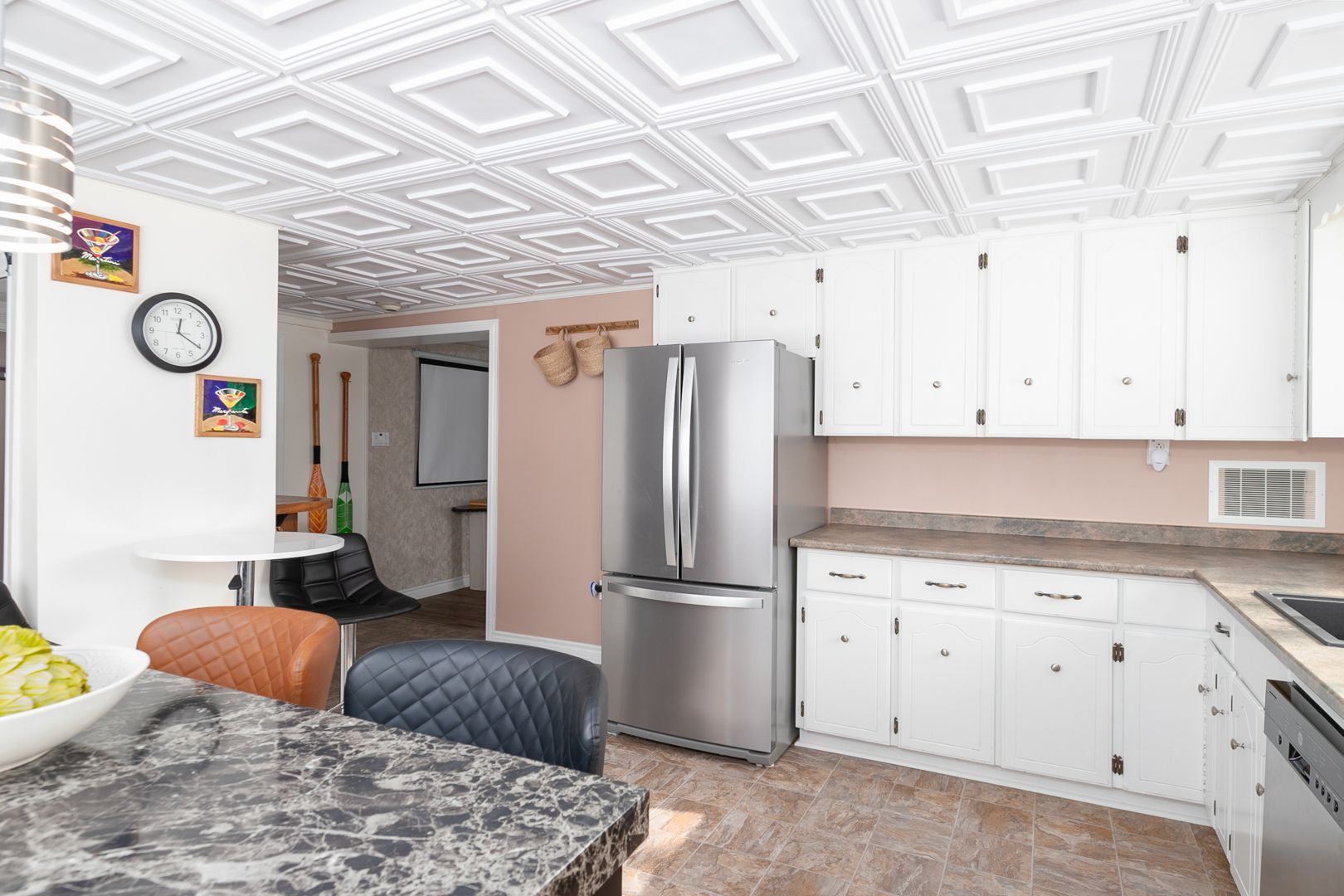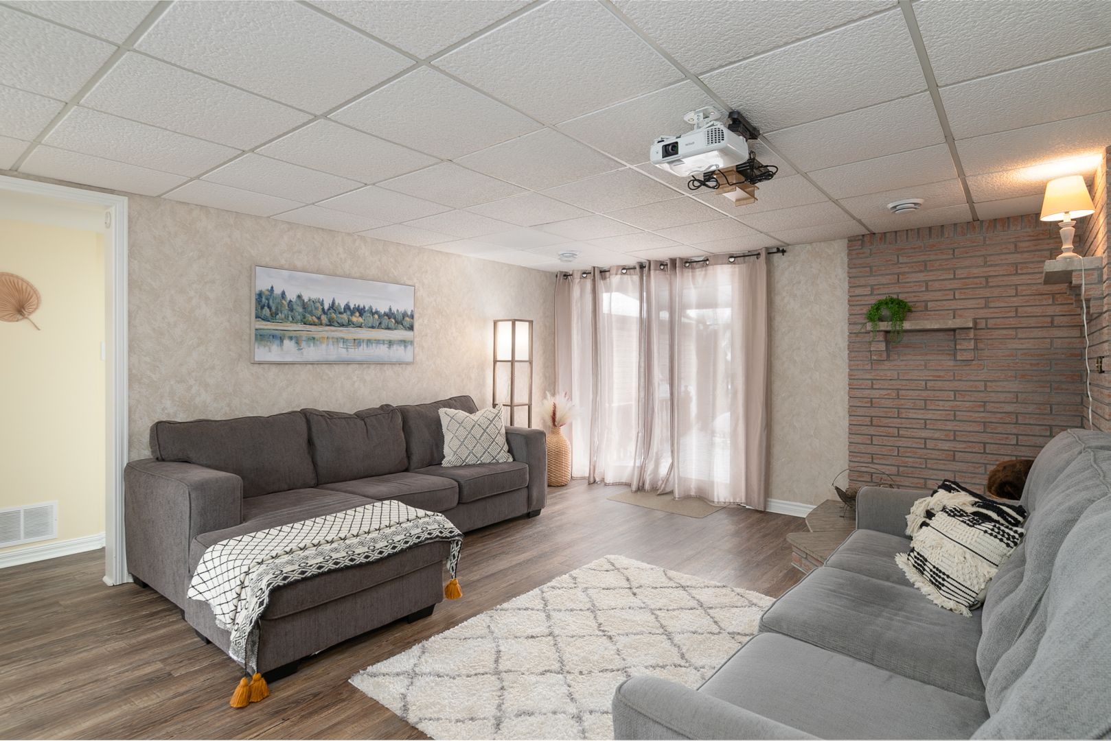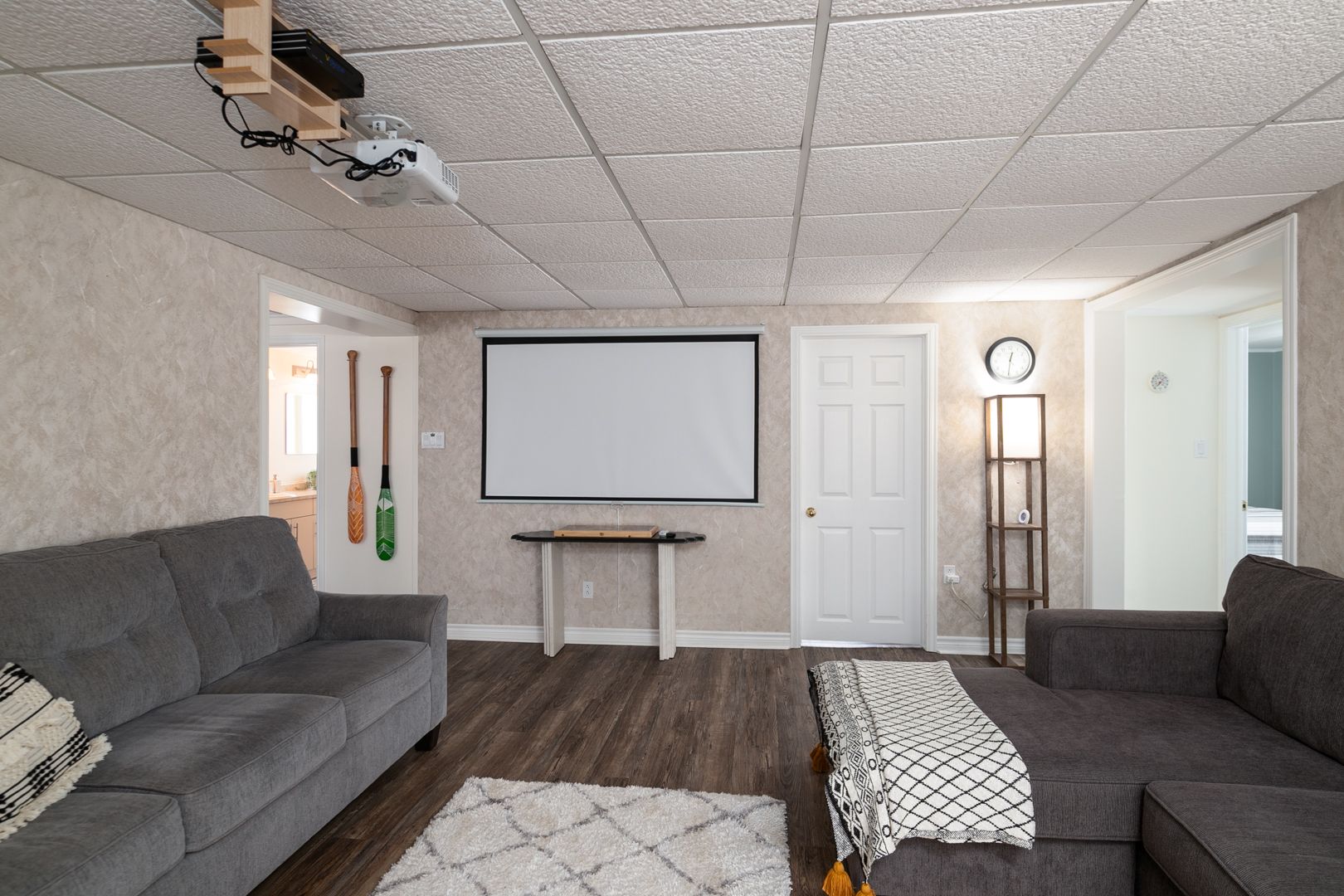 • Spacious kitchen and cozy living room with a projector screen for entertainment.