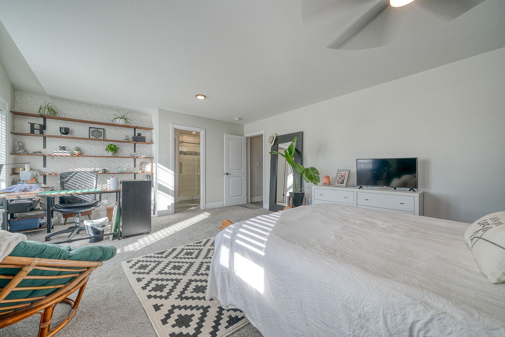 • Functional kitchen with spacious island, sleek countertops, and ample storage.