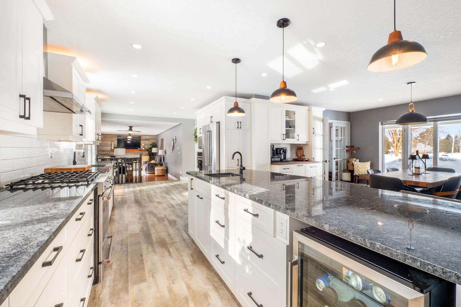 • Modern chef's kitchen with quartz countertops and built-in appliances.