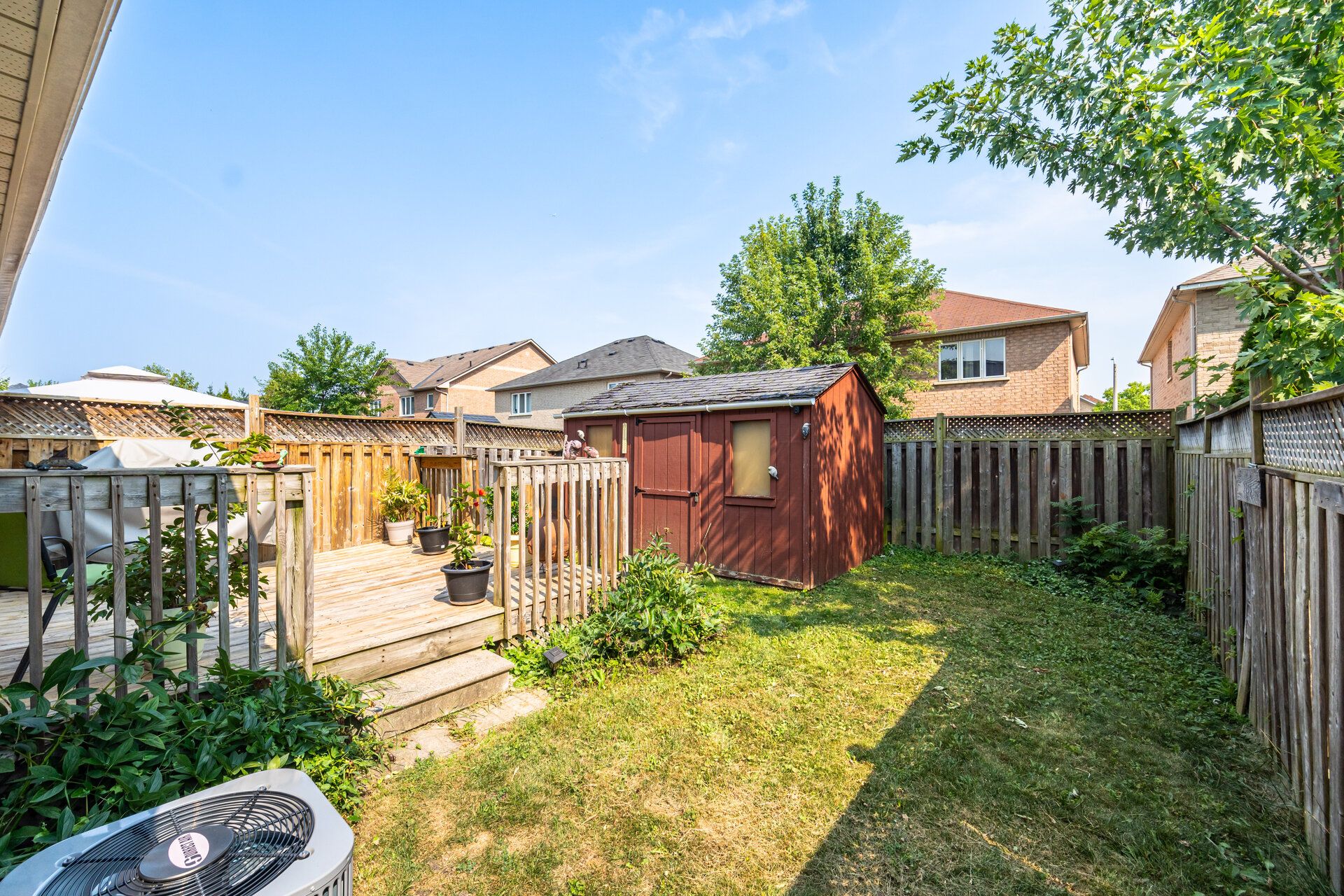 • Private fenced backyard with wood deck, perfect for summer barbecues.