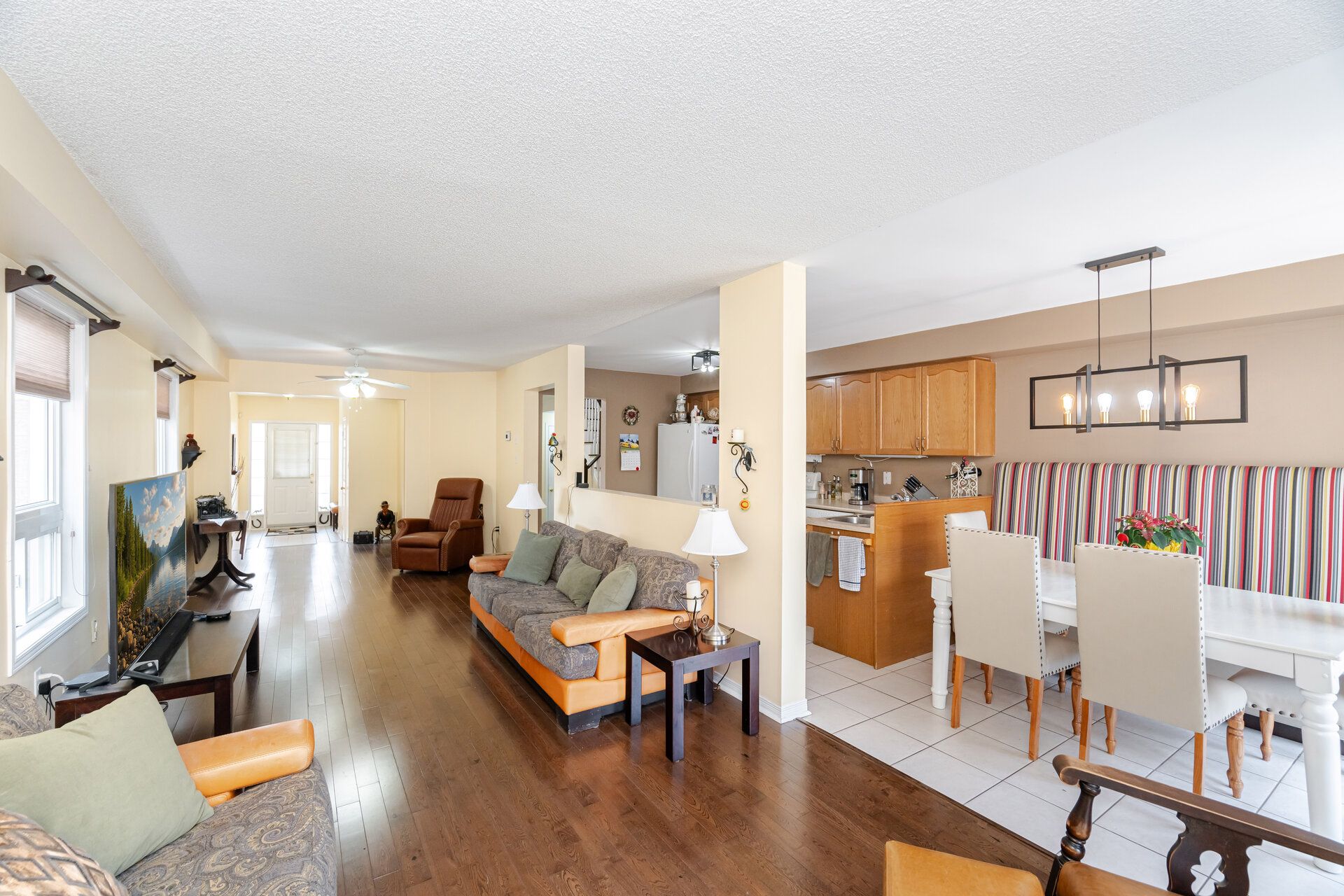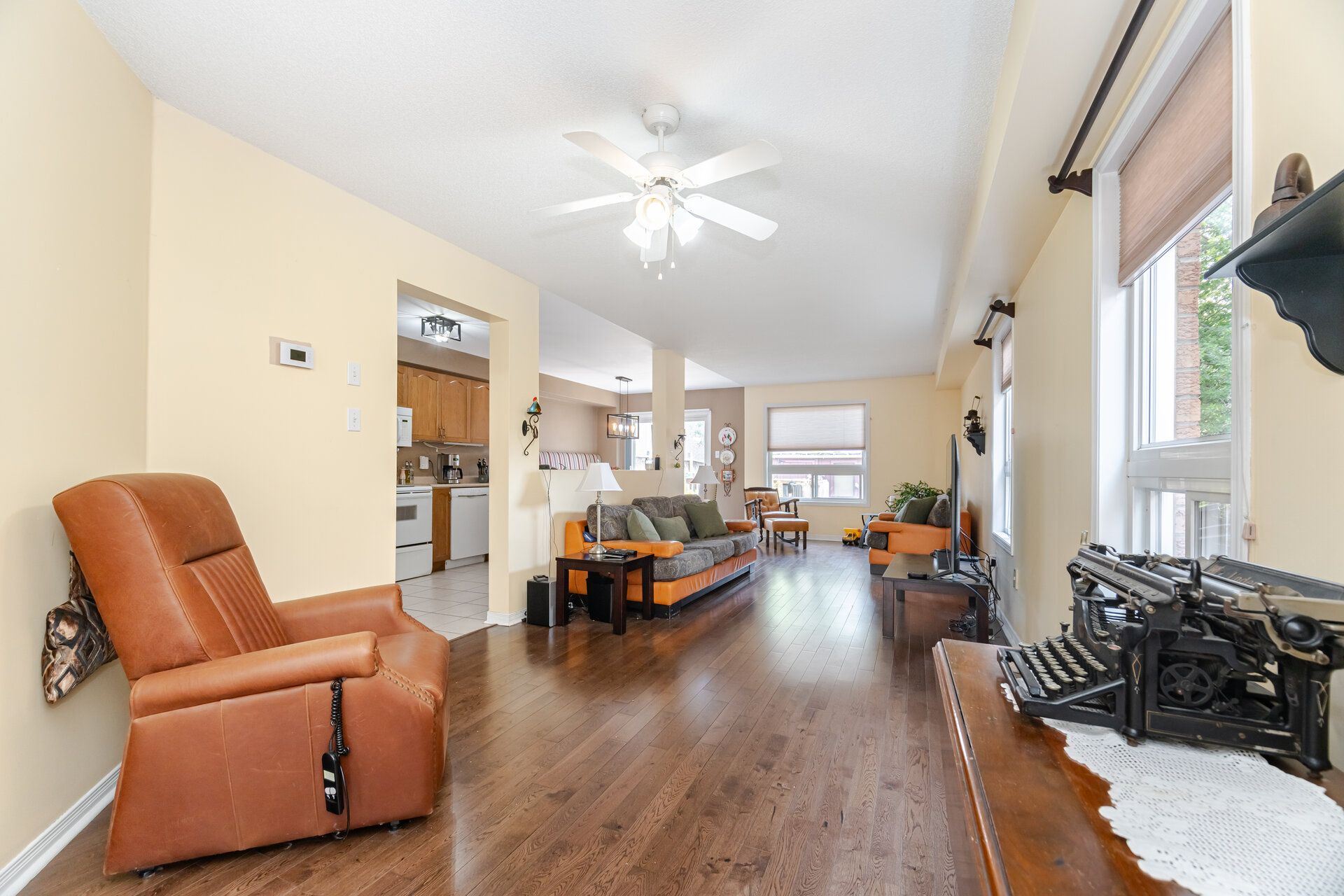 • Open concept main floor with living area and kitchen overlooking backyard.