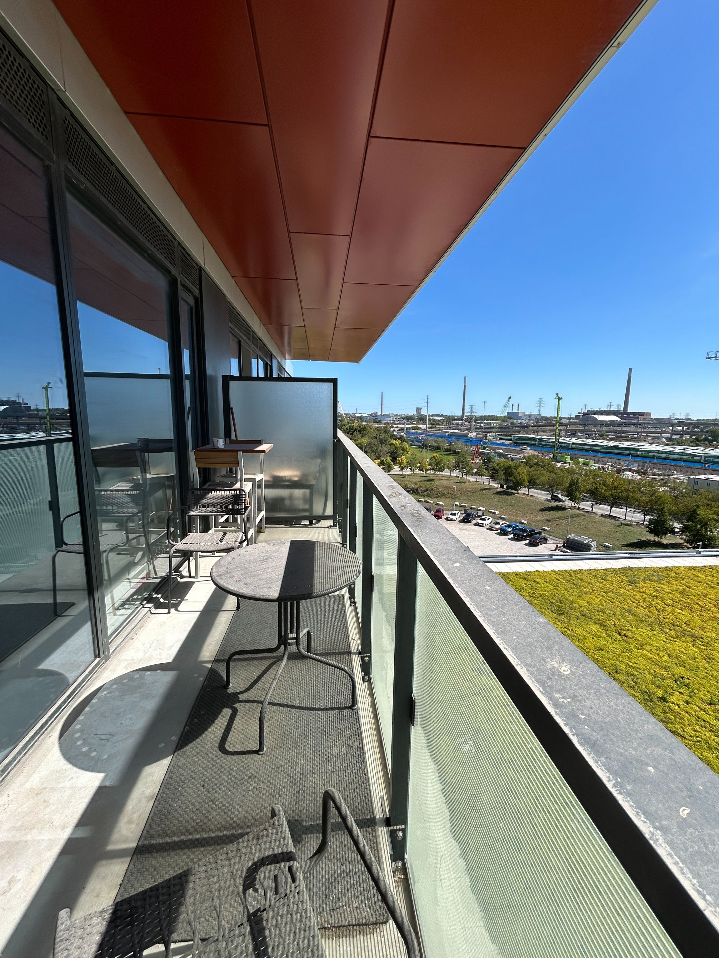 • Open layout with a large balcony and views of green spaces.