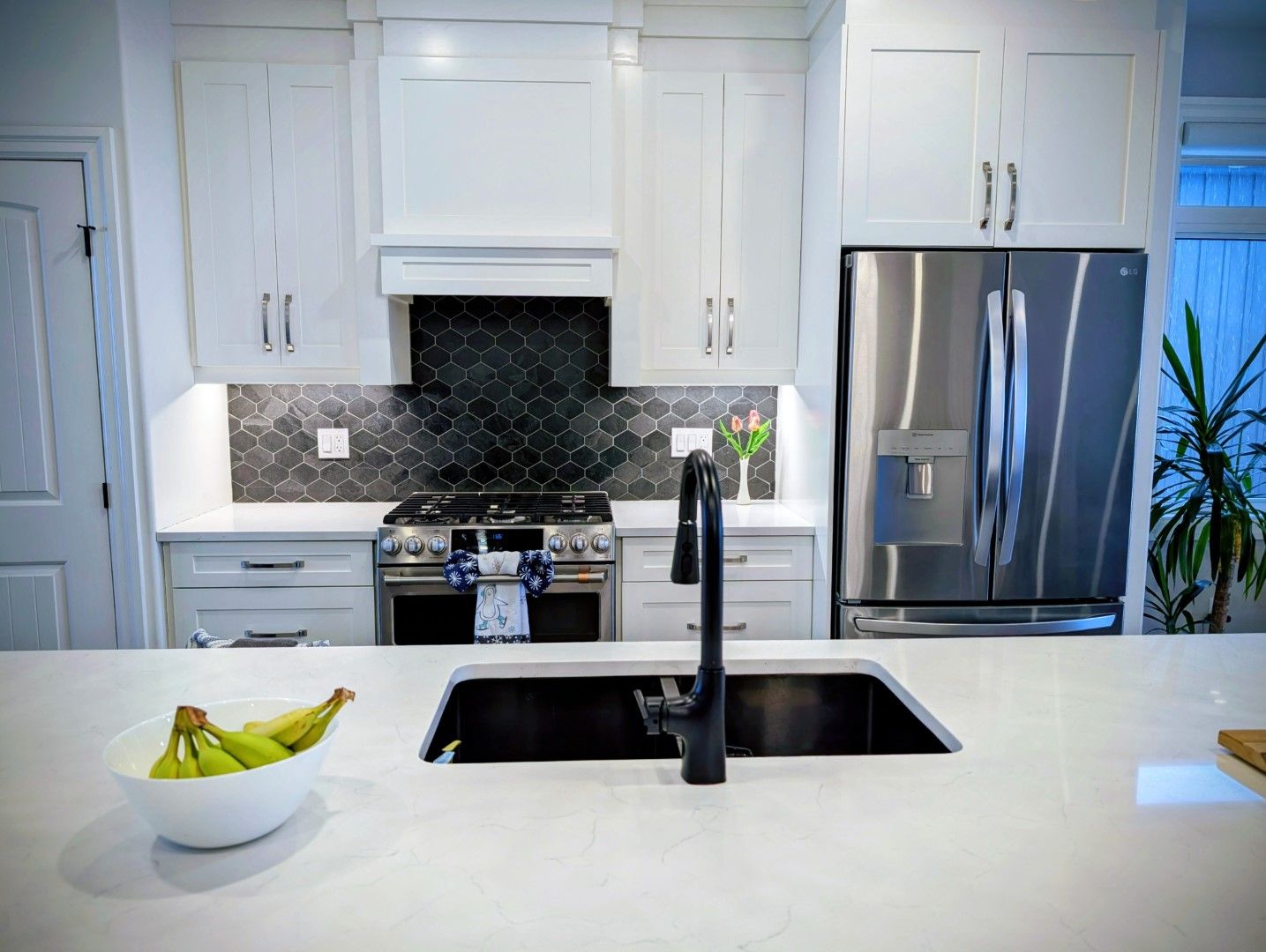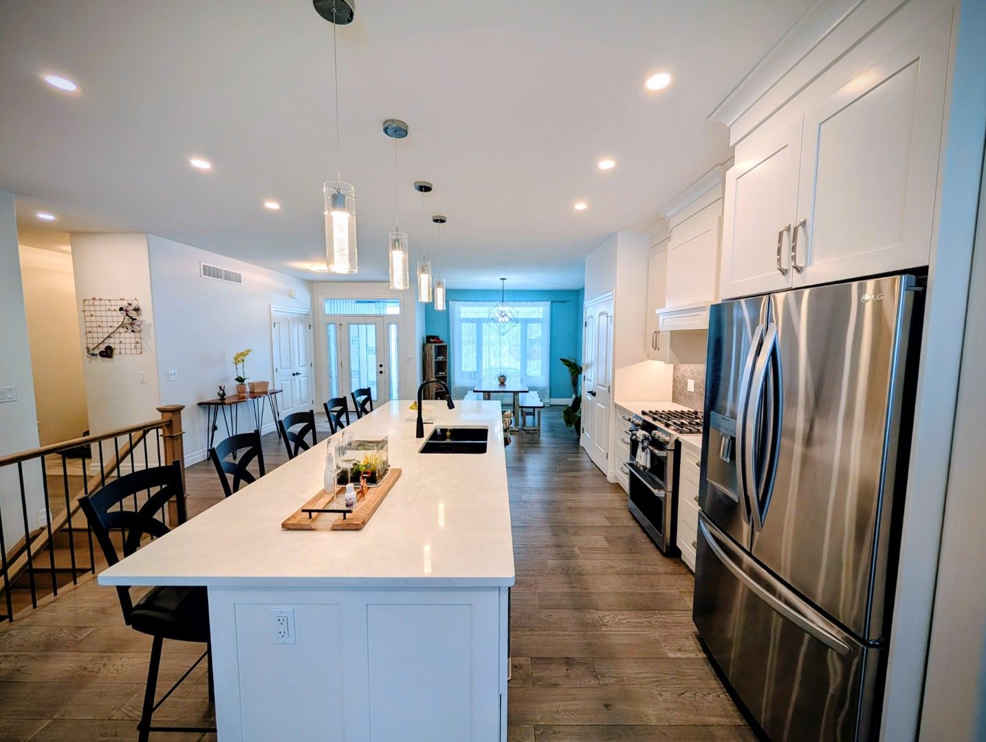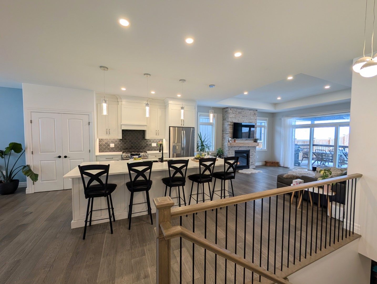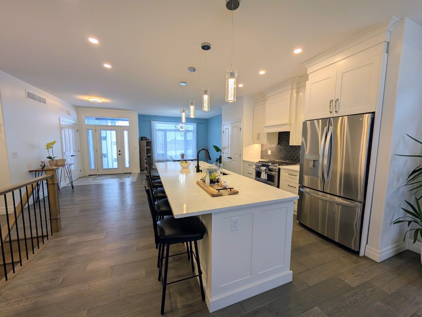 • Open-concept kitchen features a large quartz island and modern appliances for entertaining.