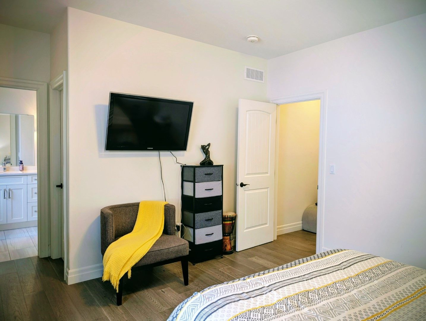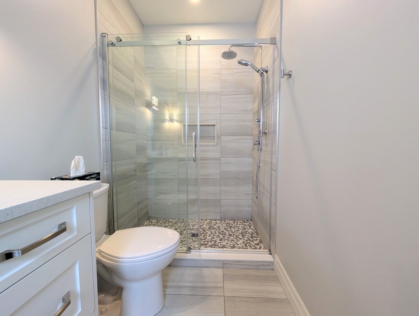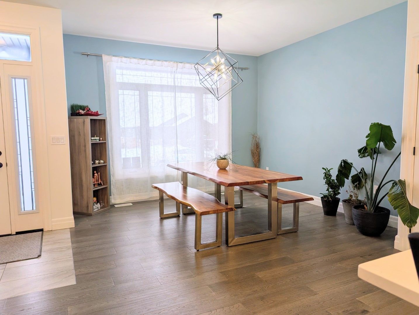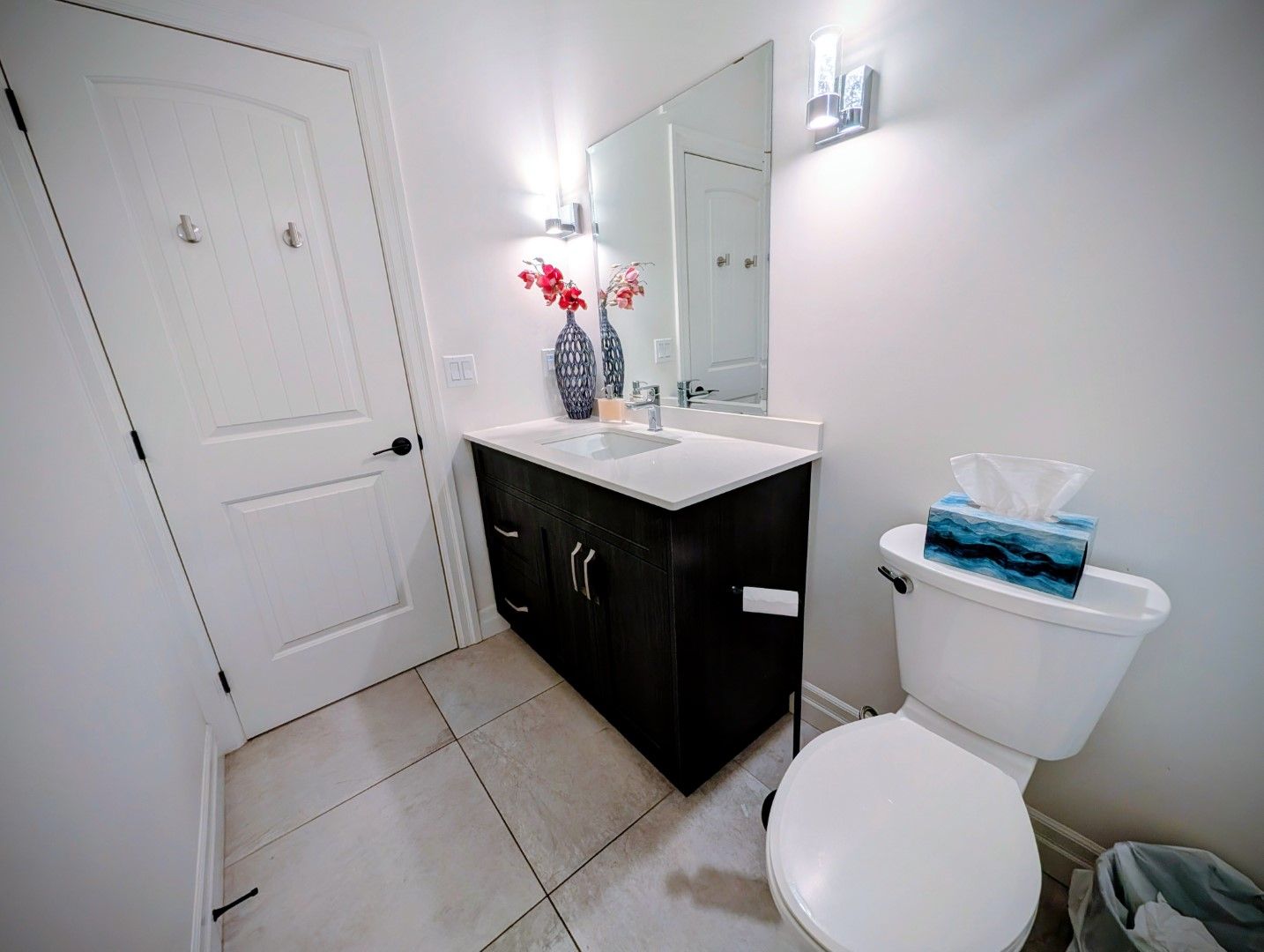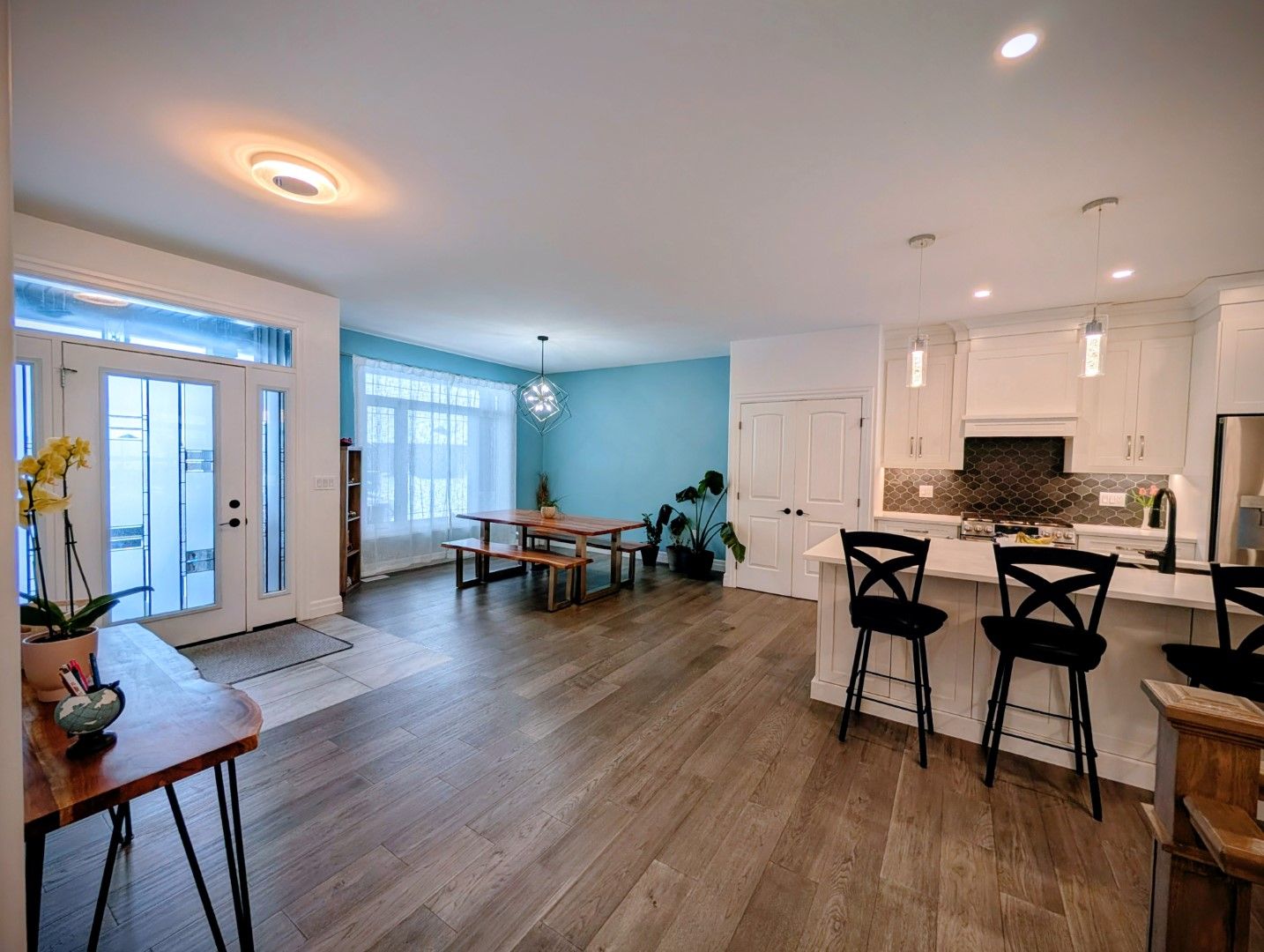 • Open-concept kitchen features a large quartz island and modern appliances for entertaining.
