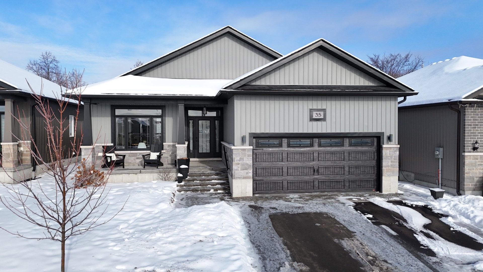 Welcome to 35 schmidt way, an upgraded and well-maintained bungalow built in 2022, offering modern design, premium finishes, and generous living space in a family-friendly neighbourhood with quick access to cfb trenton and highway 401. Thoughtfully designed & meticulously cared for, this home is ideal for families, military relocations or anyone looking for a modern bungalow with room to grow. The main floor features 9-foot ceilings throughout and offers three well-appointed bedrooms including a spacious primary suite complete with a walk-in closet and a private ensuite. A separate second full bathroom is conveniently located on the main level. The living room showcases a tray ceiling, gas fireplace, and large windows that flood the space with natural light, while engineered hardwood flooring and upgraded lighting enhance the open, airy feel. At the heart of the home is the stunning open-concept kitchen, designed for both everyday living and entertaining. Highlights include an impressive 10-foot quartz island with additional cupboard storage, ceiling-height cabinetry, upgraded backsplash, pantry, and a 2025 electric/gas stove. Transom windows further elevate the space and the thoughtful layout offers both style and functionality. The fully finished basement expands the living area with a large recreation room, two additional bedrooms, a 3 piece bathroom and a finished laundry room, providing flexible space for family living, guests, or home office needs. Additional features include a finished attached garage, hrv system, furnace with humidifier and central air, on-demand water heater, sump pump, gas line for bbq, interior and exterior pot lights and pride of ownership throughout. Step outside to a fully fenced backyard designed for enjoyment, featuring a covered deck and a properly installed 2022 6+ seater hot tub set on compacted limestone with a defined walkway. A move-in-ready home with premium upgrades in a sought-after location-simply unpack and enjoy.