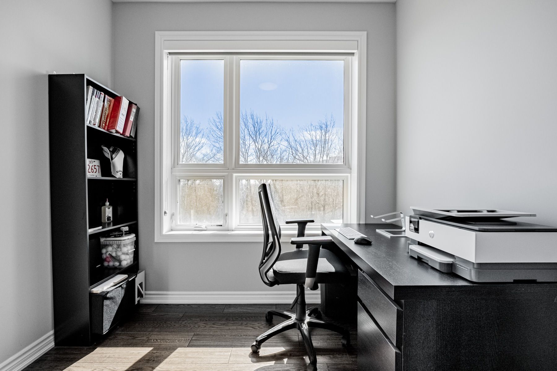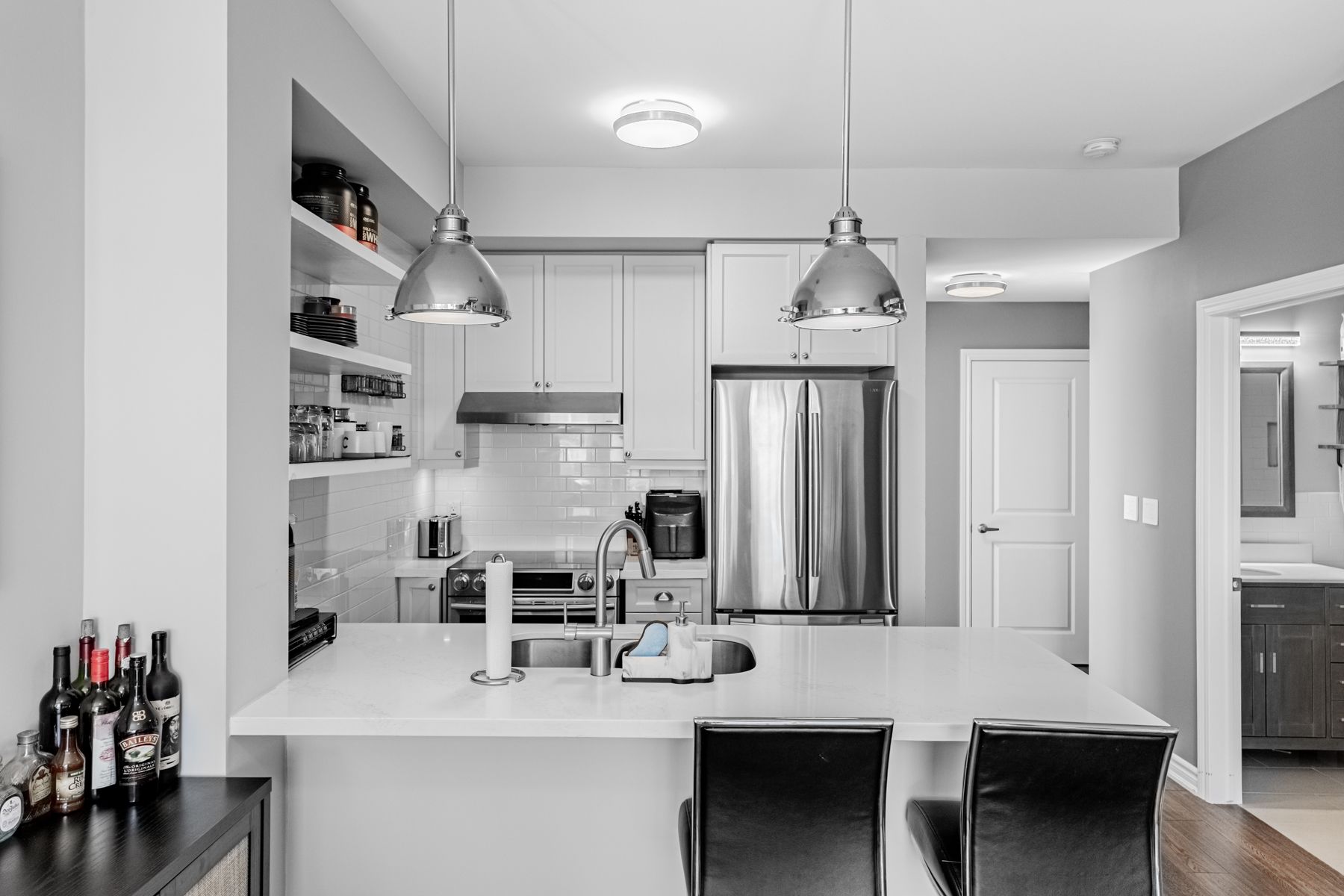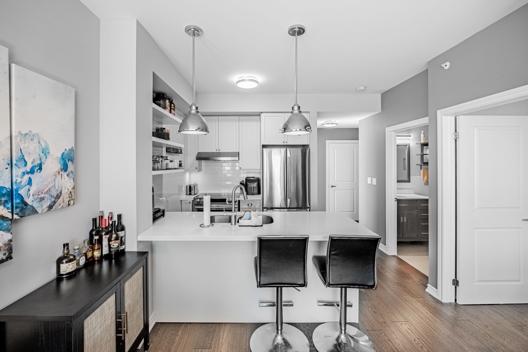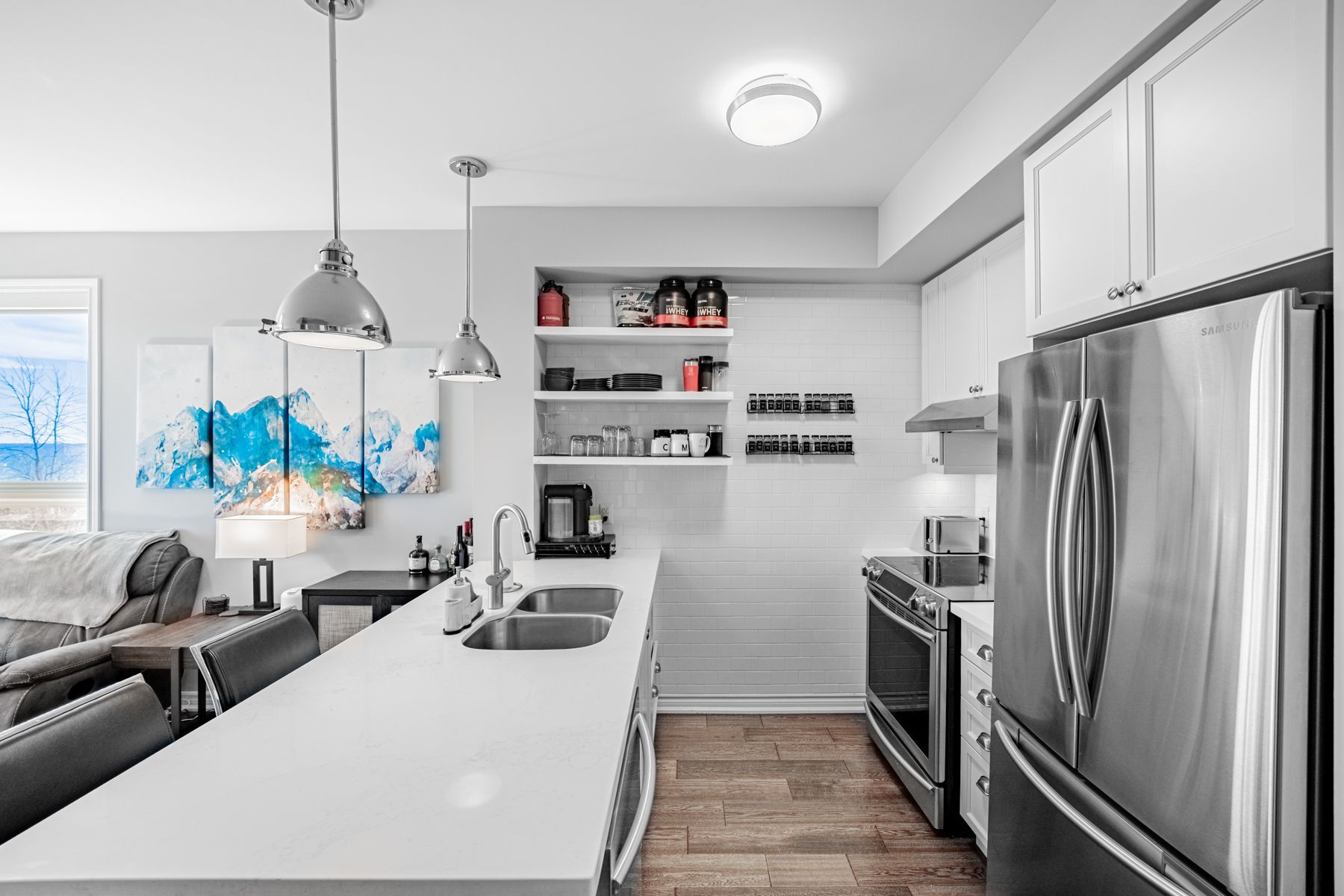 • Open-concept layout with elegant hardwood flooring and sleek kitchen.